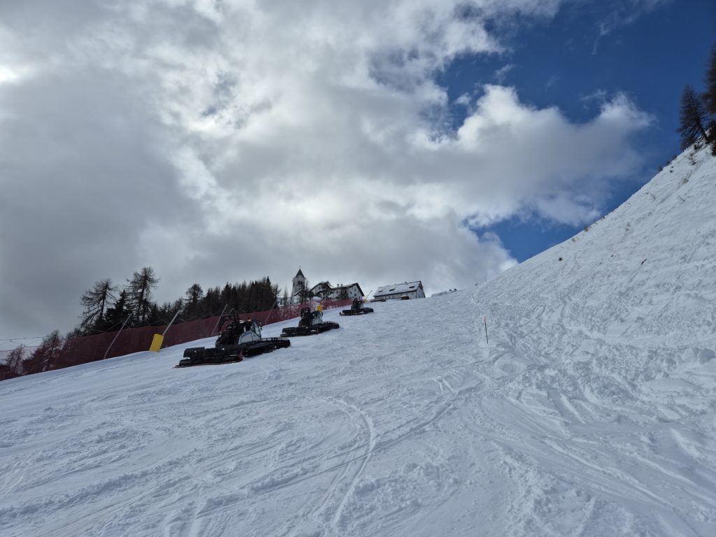 Als wir auf Höhe des Bergdorfs waren sind sie mit fröhlichem Winken wieder an uns vorbei talwärts gefahren und haben die präparierte Pistenfläche noch weiter verbreitert. Auch das ist eine außergewöhnliche Situation. Während des Skibetriebs sind niemals Skiläufer und Pistengeräte gleichzeitig auf der Piste. Wir sind dort schon bei dichtestem Schneefall einen ganzen Tag lang auf der Piste im Tiefschnee gefahren. Präpariert wurde erst nach Betriebsschluss am Abend. Der niederpräparierte Neuschneeteppich hat uns dann am nächsten Tag auch viel Freude bereitet.