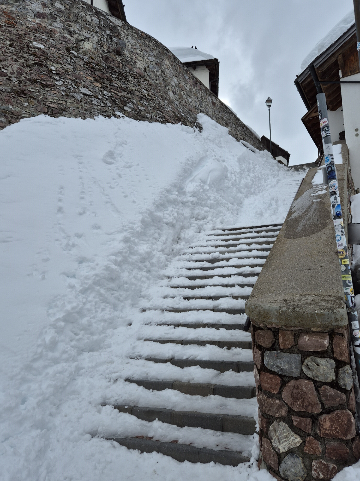 Es folgte nun die spirituelle Einkehr am Ende unserer „Skitourenwallfahrt“, für die wir uns ausgiebig Zeit gegönnt haben. Danach wollten wir nicht über die vereiste Stiege wieder absteigen. Daher haben wir die Skier durch die Gasse im oberen Dorfteil getragen, haben dort angeschnallt und sind unterhalb der am Hang klebenden Häuser wieder zum Pfarrhaus am Fuße der Treppe zurückgefahren.