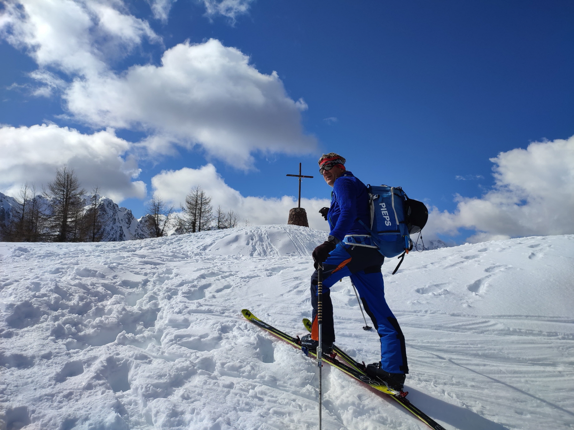 Von da ging es dann weiter aufwärts. Ein abfahrender junger Italiener hat sich über den schrecklich eisigen Untergrund beklagt, der ihm gleich am ersten Hang – trotz Verwendung von Harscheisen – einen unsanften Abgang mit Schürfwunden an beiden Unterarmen beschert hatte. Wenn Pulvertouren vom Motto „Der frühe Vogel fängt den Wurm“ geprägt sind, so war es diesmal wohl eher umgekehrt und er war definitiv zu früh dran.