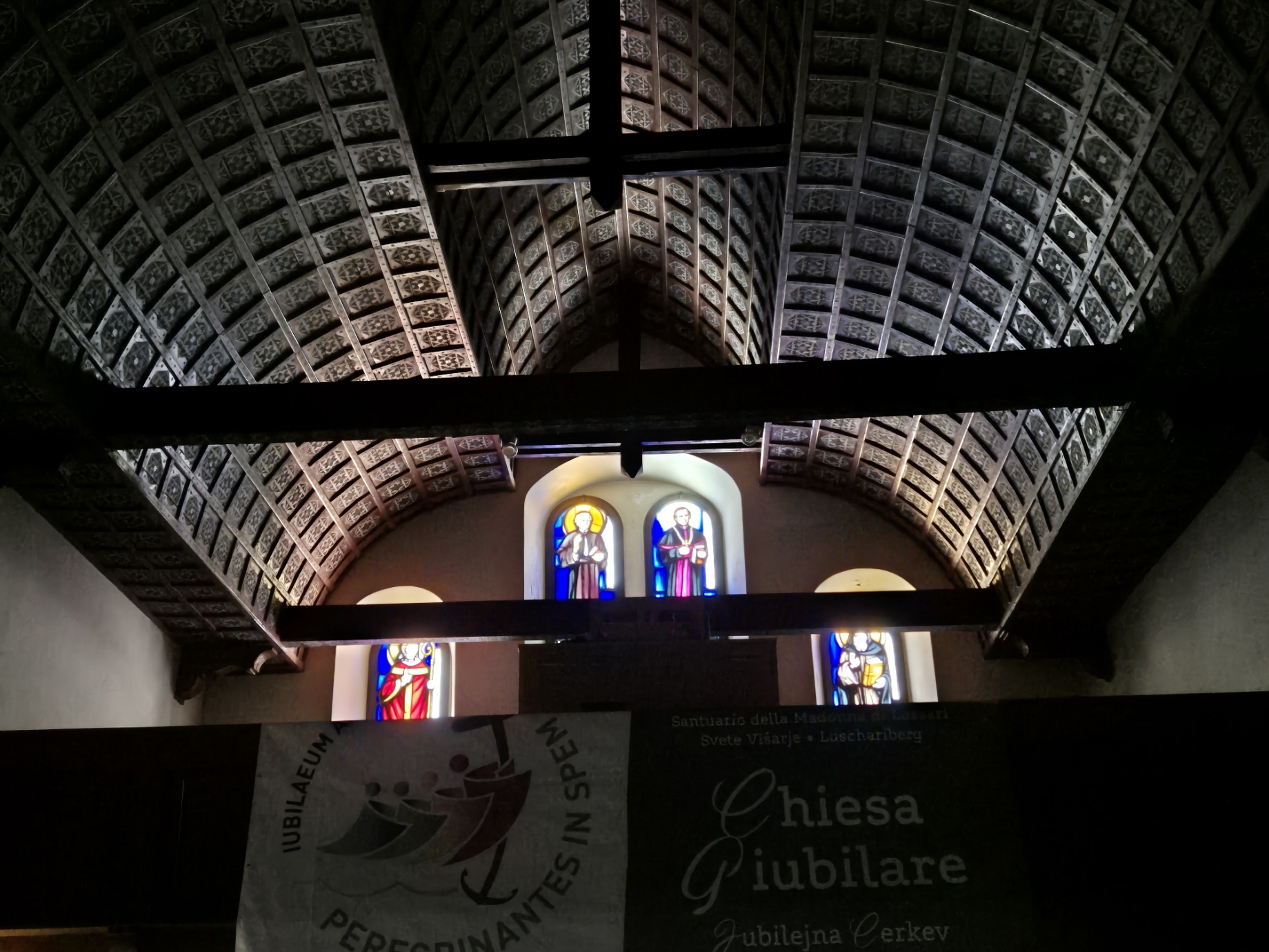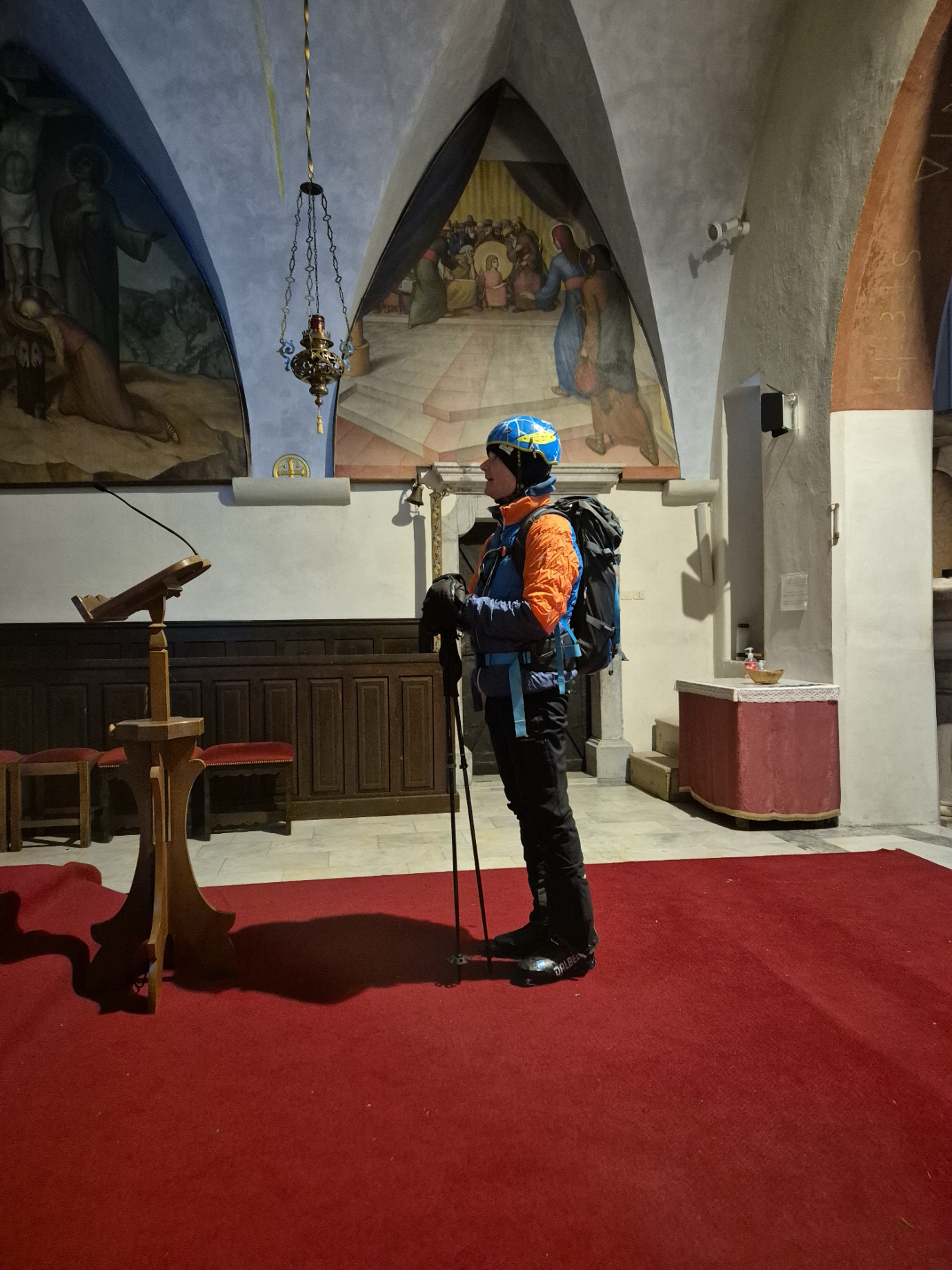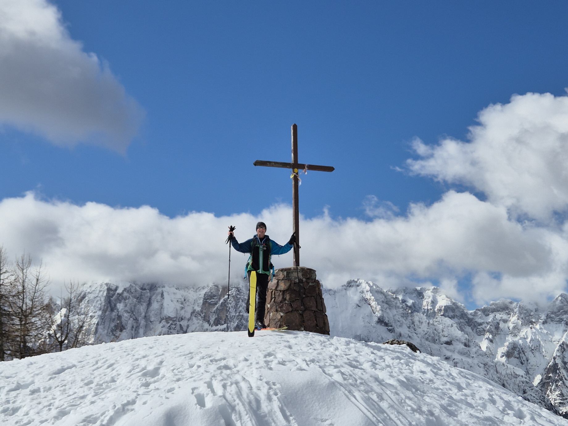 Durch das Bergdorf sind wir noch auf Skiern bis zur vereisten Treppe angestiegen. Die war dann definitiv der „gefährlichste“ Teil des Anstiegs. Oberhalb der Treppe haben wir noch einmal angeschnallt und sind – durch den überdachten Eingangsbereich vor der Wallfahrtskirche – zum großen Kreuz am Gipfel des Monte Lussari angestiegen.