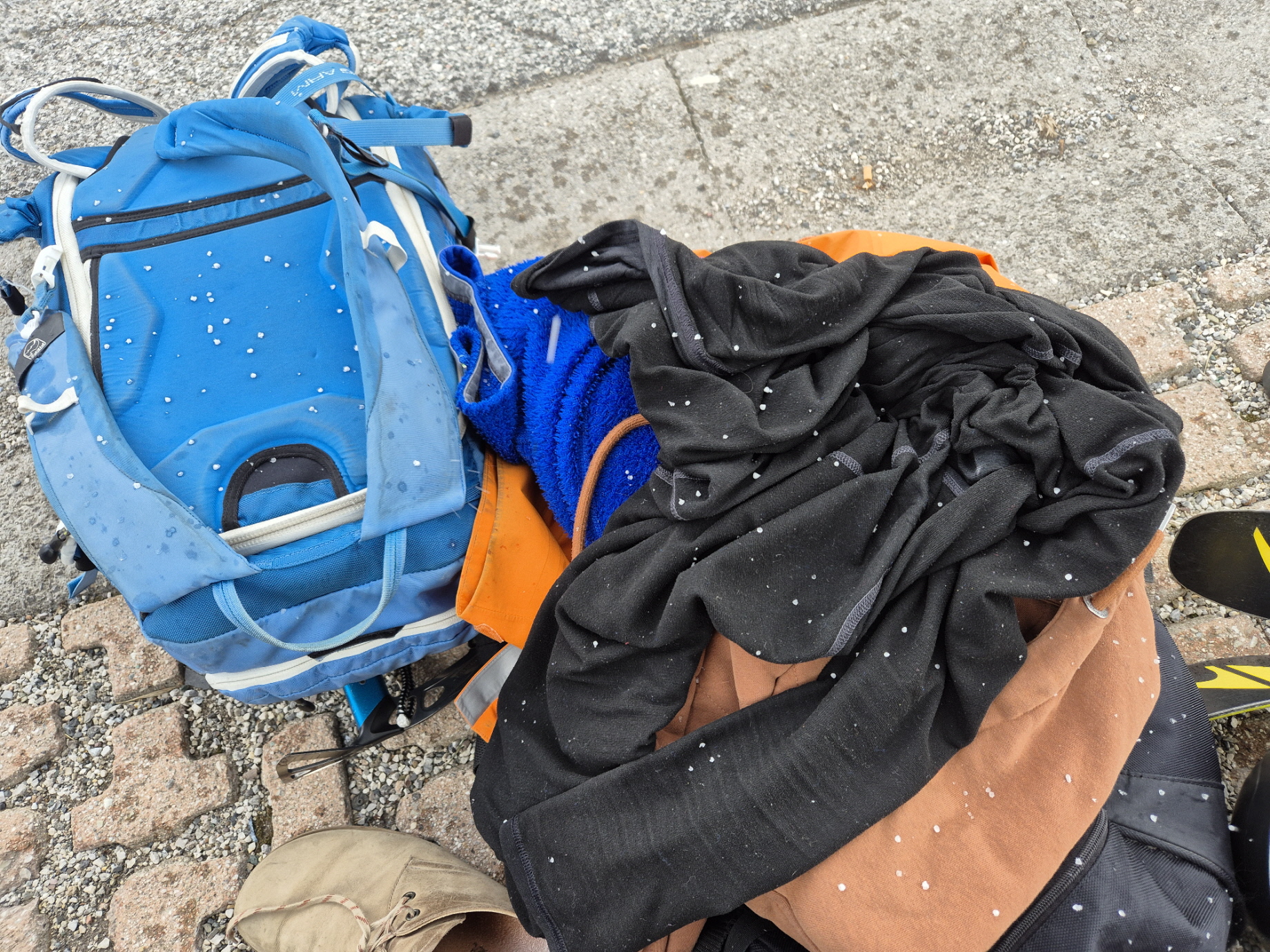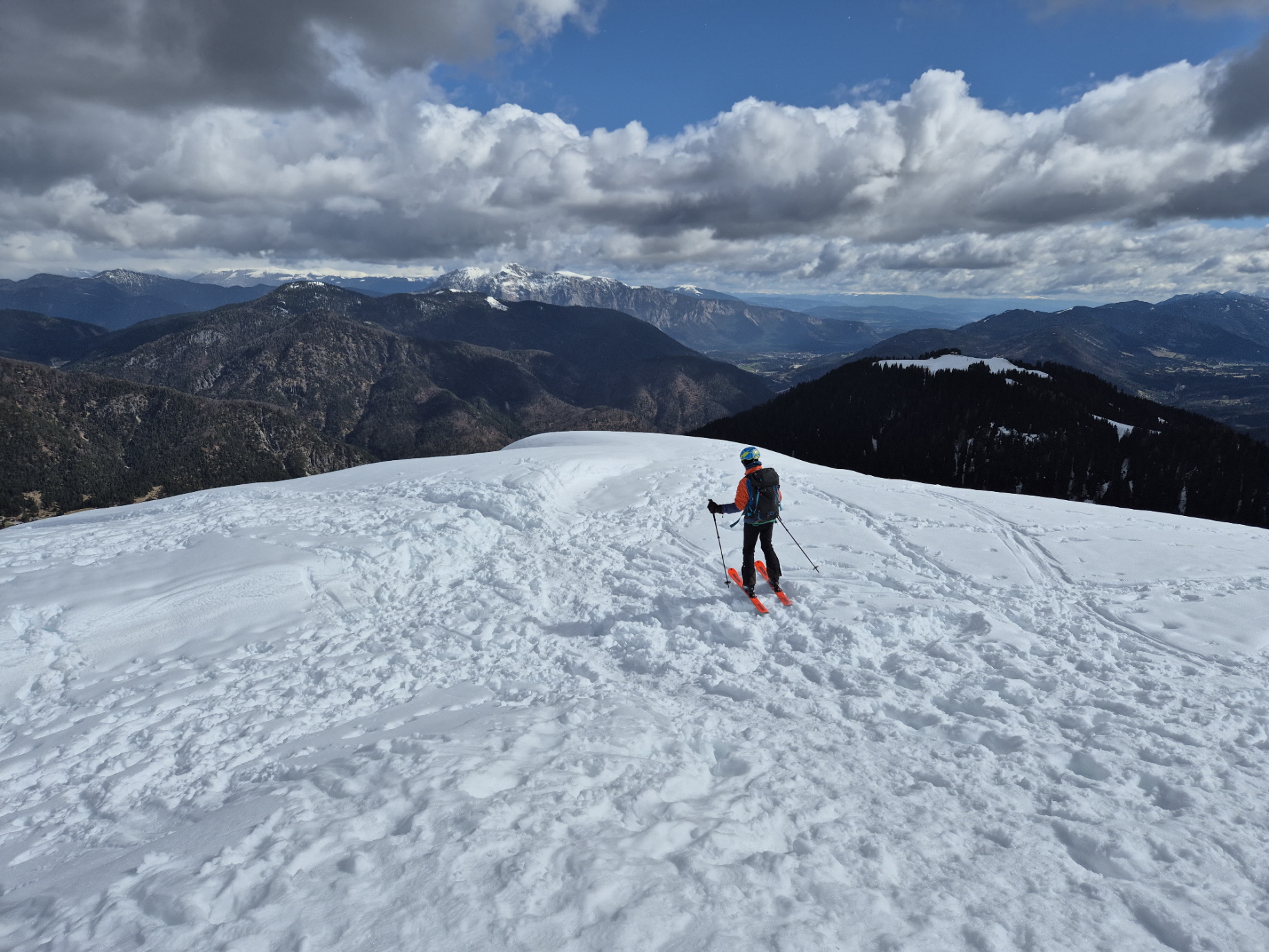 Stefan hat in der Folge mit Rücksicht auf seine neuen Abfahrtsgeräte einmal für wenige Meter abgeschnallt, ich bin mit angeschnallten Skiern über ein Wiesenstück gleich drüber gestiefelt. Über den inzwischen aufgefirnten Zielhang sind wir schließlich bis zu jenem Punkt abgefahren, wo wir in der Früh angeschnallt hatten. Nach dem kurzen Fußmarsch zurück zum geparkten Auto haben wir die Ausrüstung darin verstaut, während der nächste kurze Graupelschauer niedergegangen ist.