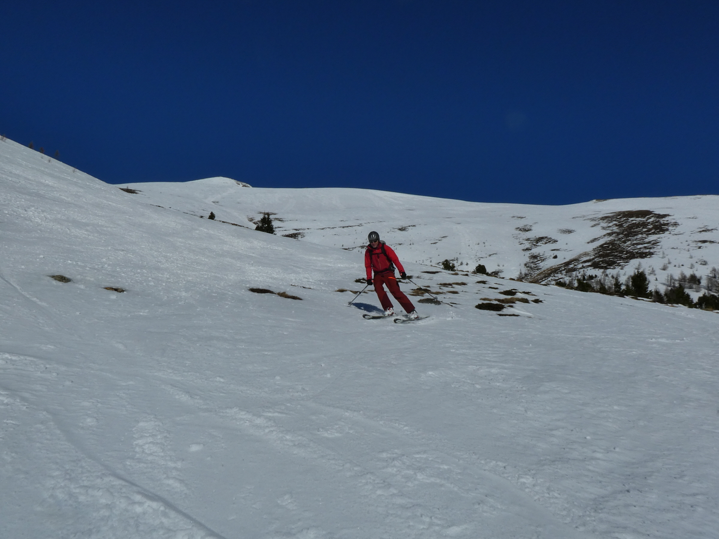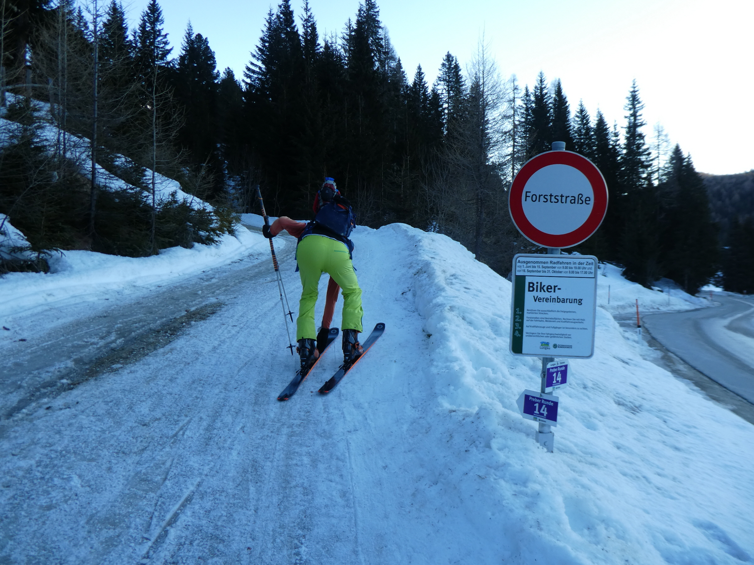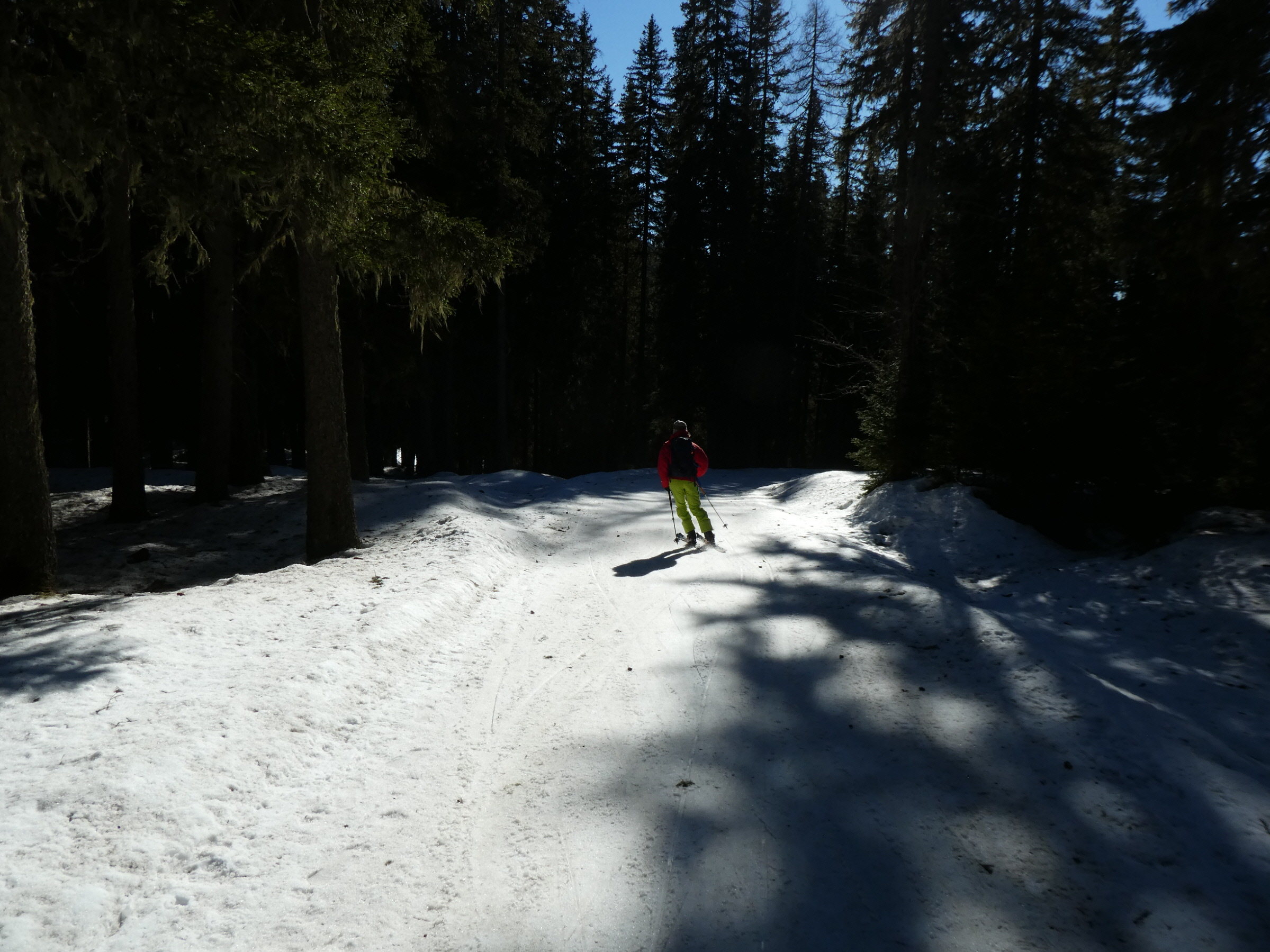 Mit abnehmender Höhe hat dieser irgendwann eine schmierige Konsistenz bekommen und im Bereich der – bei diesen Verhältnissen auch fahrbaren – Rinne ist der Schnee dann firnig geworden. Auch der Bereich danach bis zu den Halterhütten war bestens fahrbar. Nach einer kurzen Abfahrtspause haben wir uns dann in den Weg hineingestellt und sind in flotter Fahrt zurück zum Ausgangspunkt bei der Ludlalm abgefahren.