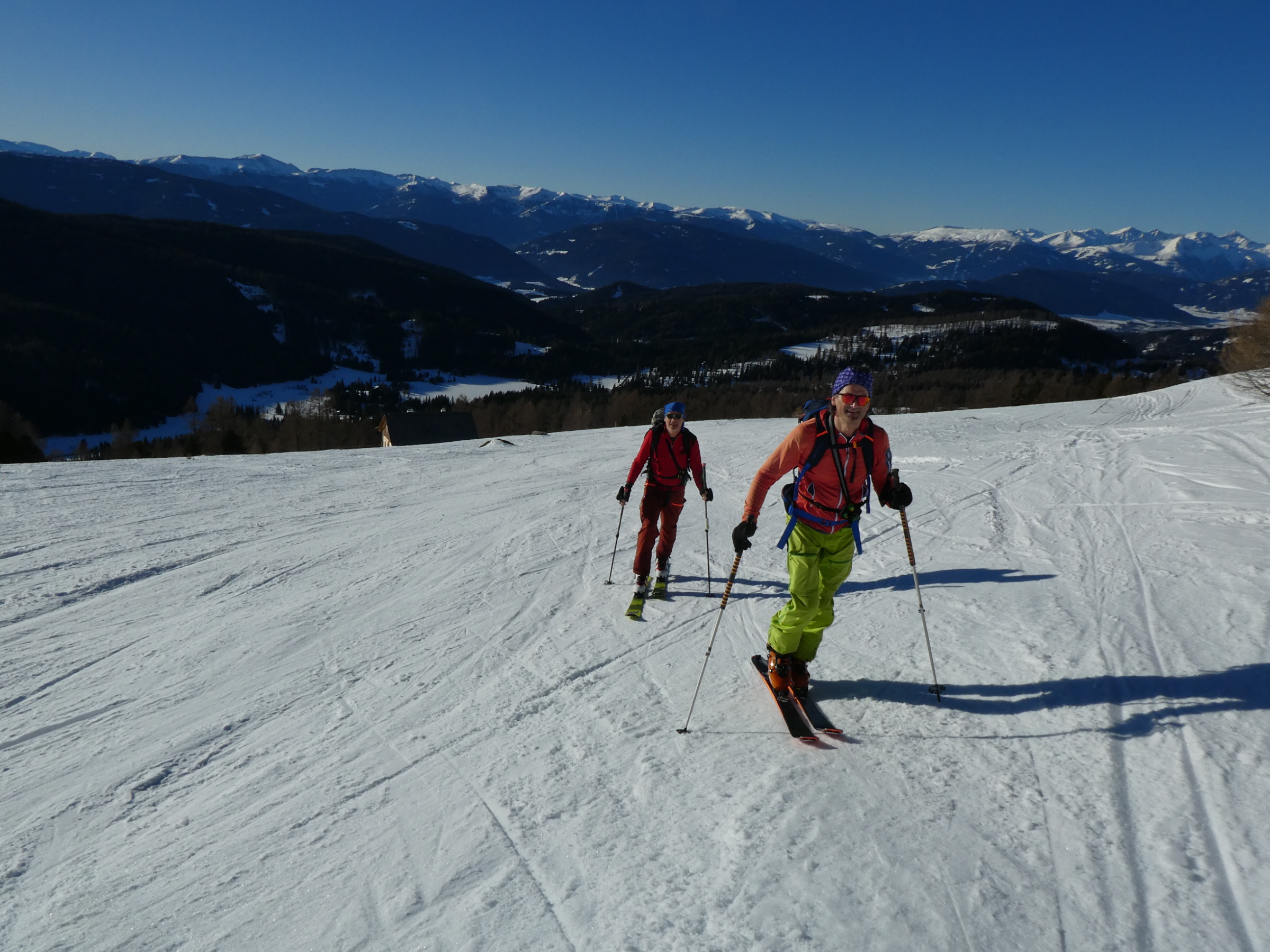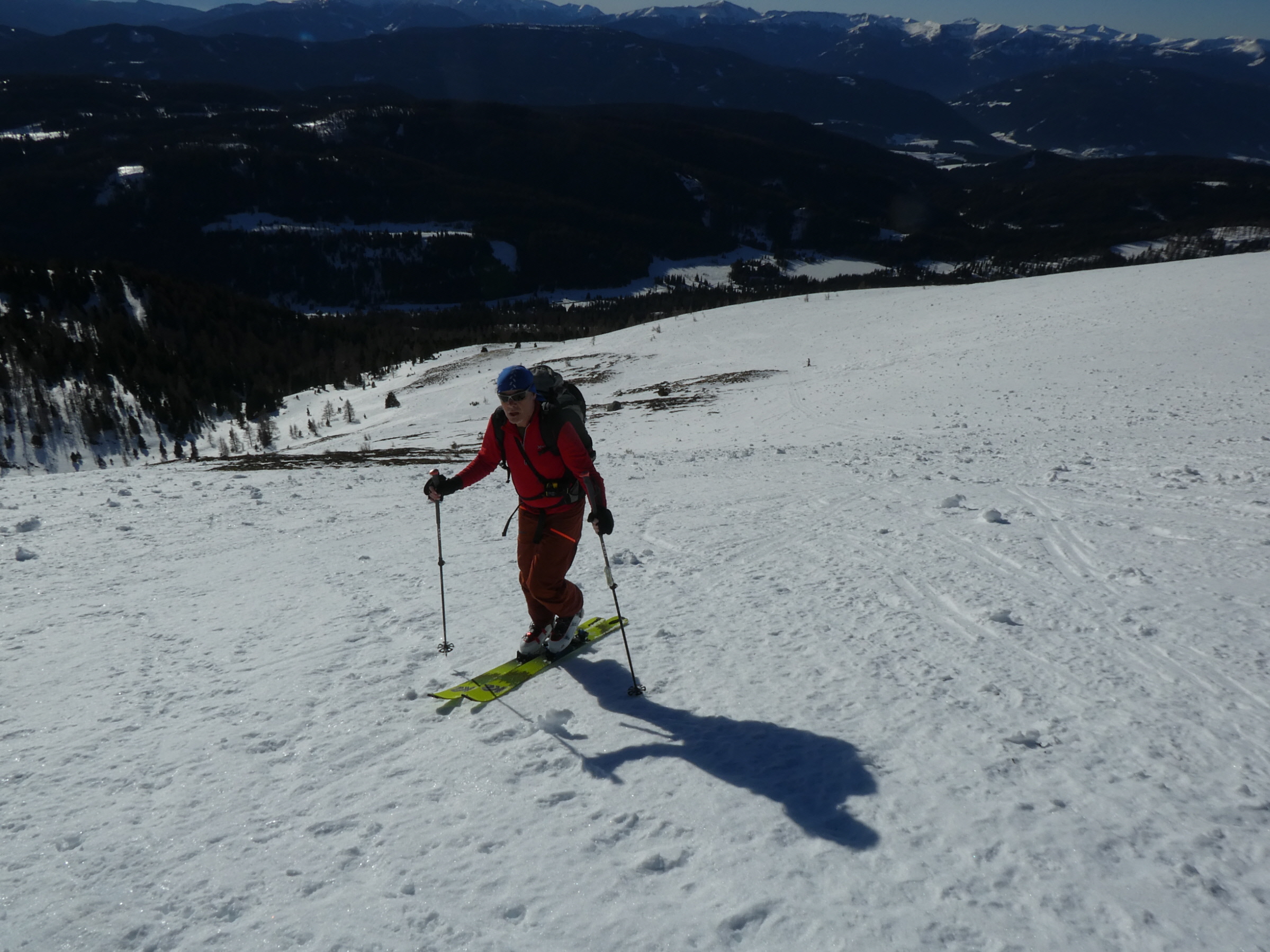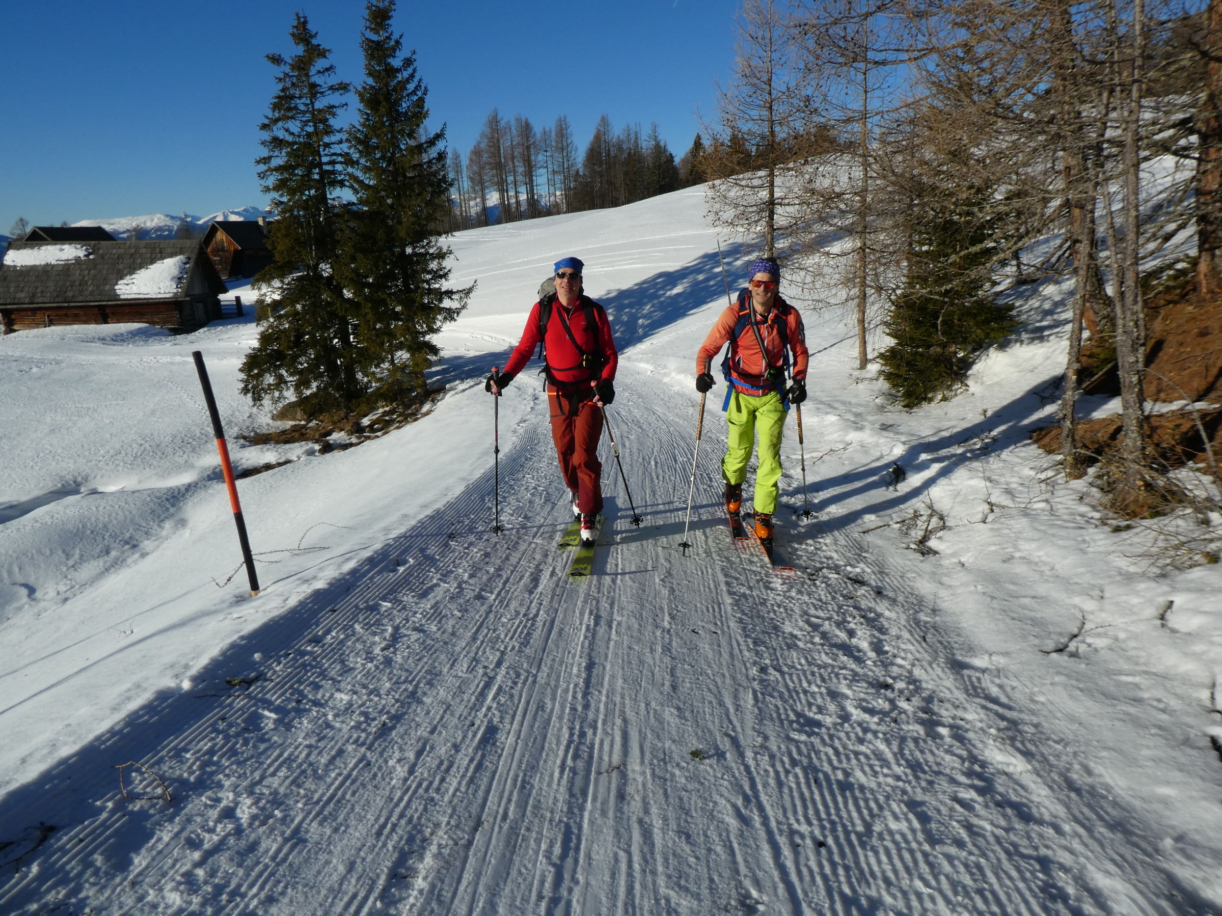 Bei dieser Gelegenheit haben wir wegen der oberhalb des Jausenplatzes zunehmenden Steilheit und der etwas glasigen Spur auch gleich die Harscheisen montiert. Andreas ist dabei beim Auspacken der zackigen Aufstiegshilfen das Sackerl entfleucht. In flotter Talfahrt ist es der Schwerkraft gefolgt und erst ziemlich weit unten zum Stilstand gekommen. Die nach uns aufsteigende Eva Maria aus Stadl/Mur hat dies auch beobachtet, ihren Aufstiegsweg um eine lange Kehre erweitert und Andreas einige Minuten Später seinen Ausreißer wieder zurückgebracht. Danke für dieses Service auch an dieser Stelle noch einmal!