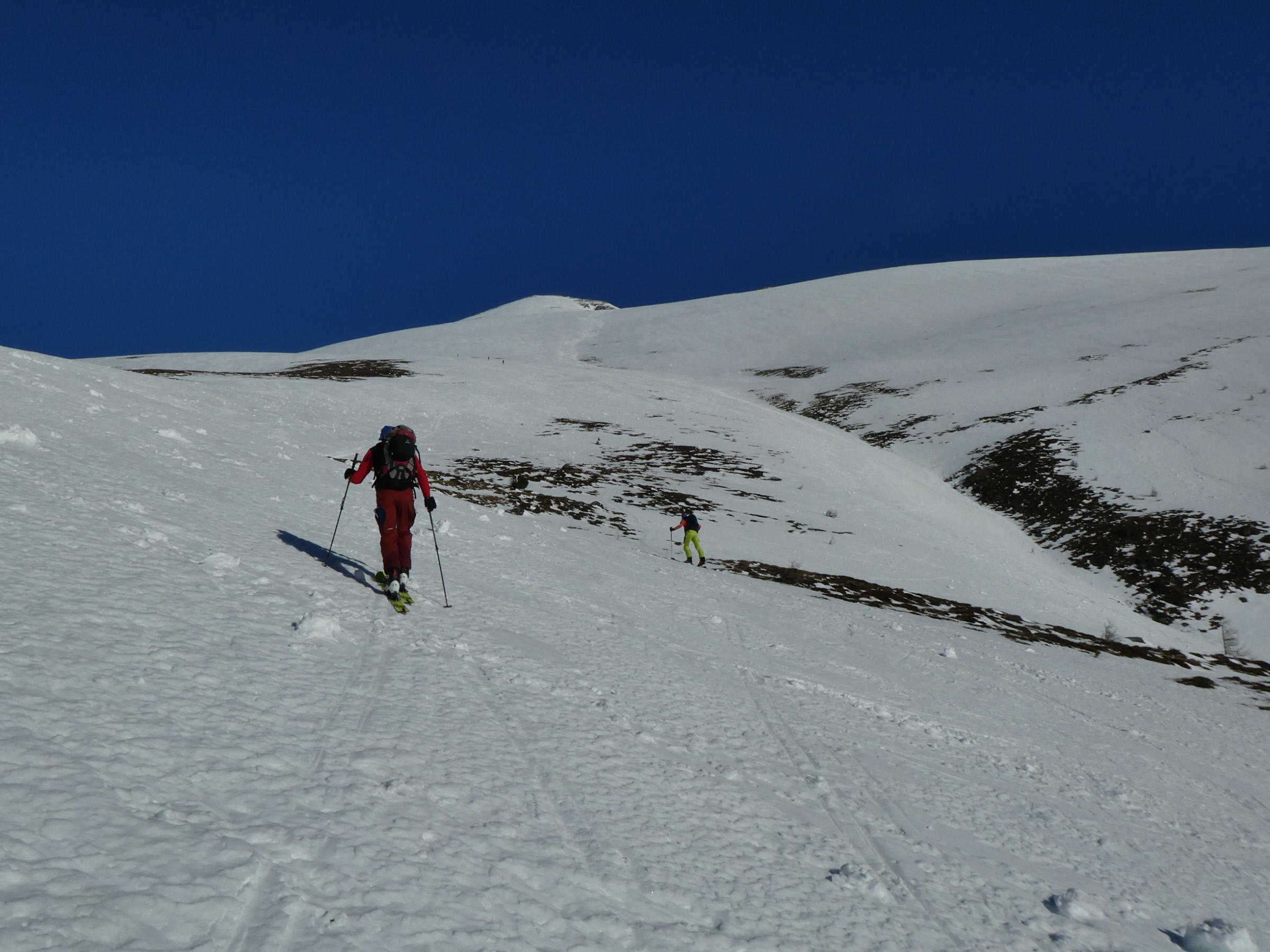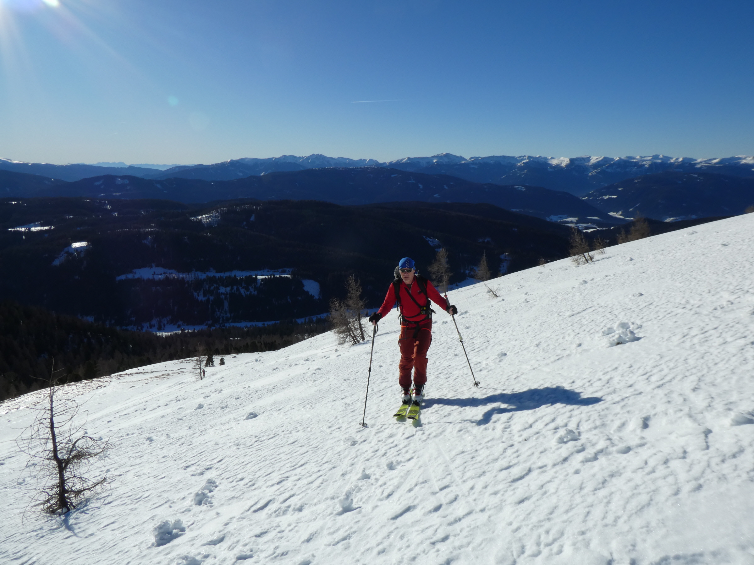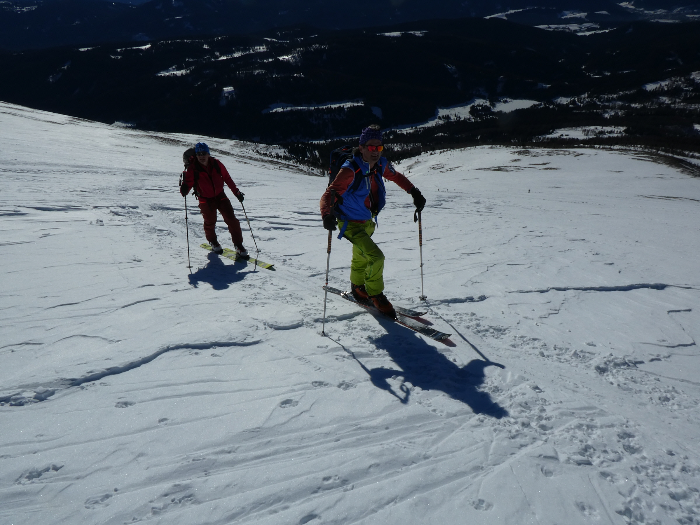 Bei dieser Gelegenheit haben wir wegen der oberhalb des Jausenplatzes zunehmenden Steilheit und der etwas glasigen Spur auch gleich die Harscheisen montiert. Andreas ist dabei beim Auspacken der zackigen Aufstiegshilfen das Sackerl entfleucht. In flotter Talfahrt ist es der Schwerkraft gefolgt und erst ziemlich weit unten zum Stilstand gekommen. Die nach uns aufsteigende Eva Maria aus Stadl/Mur hat dies auch beobachtet, ihren Aufstiegsweg um eine lange Kehre erweitert und Andreas einige Minuten Später seinen Ausreißer wieder zurückgebracht. Danke für dieses Service auch an dieser Stelle noch einmal!