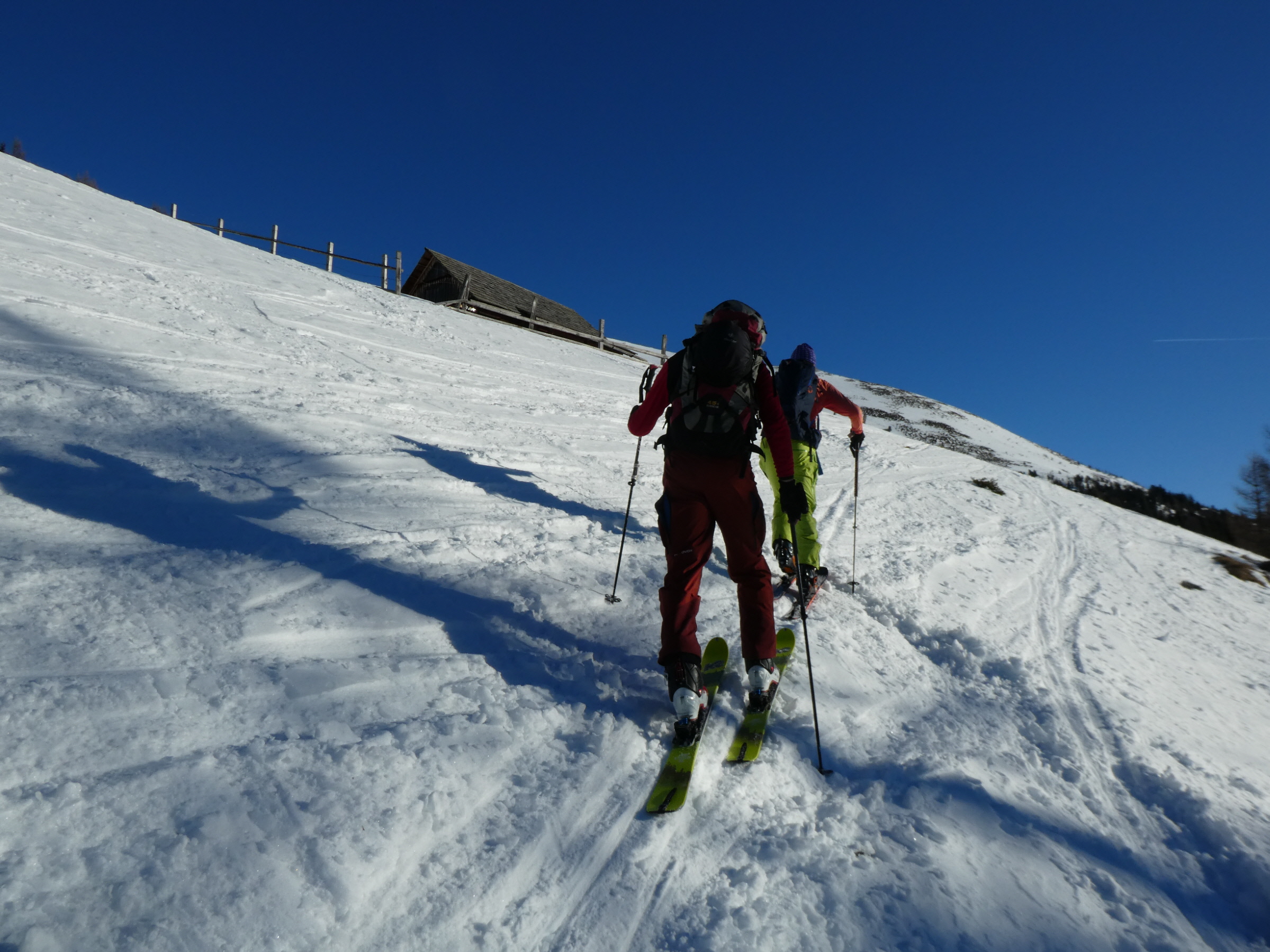 Bei minus 11 Grad sind wir am Parkplatz bei der Ludlalm am Prebersee gestartet. Vorbei an der Prodingerhütte ging es weiter hinauf zur Halterhütte, bzw. deren zwei, seit das neue Gebäude fertiggestellt ist. Mit der Sonne ist es dabei auch angenehm warm geworden. Unser Aufstiegstempo haben wir von Beginn an moderat gehalten und uns oberhalb der Roßböden beim Steinmann eine Trink- und Jausenpause gegönnt.