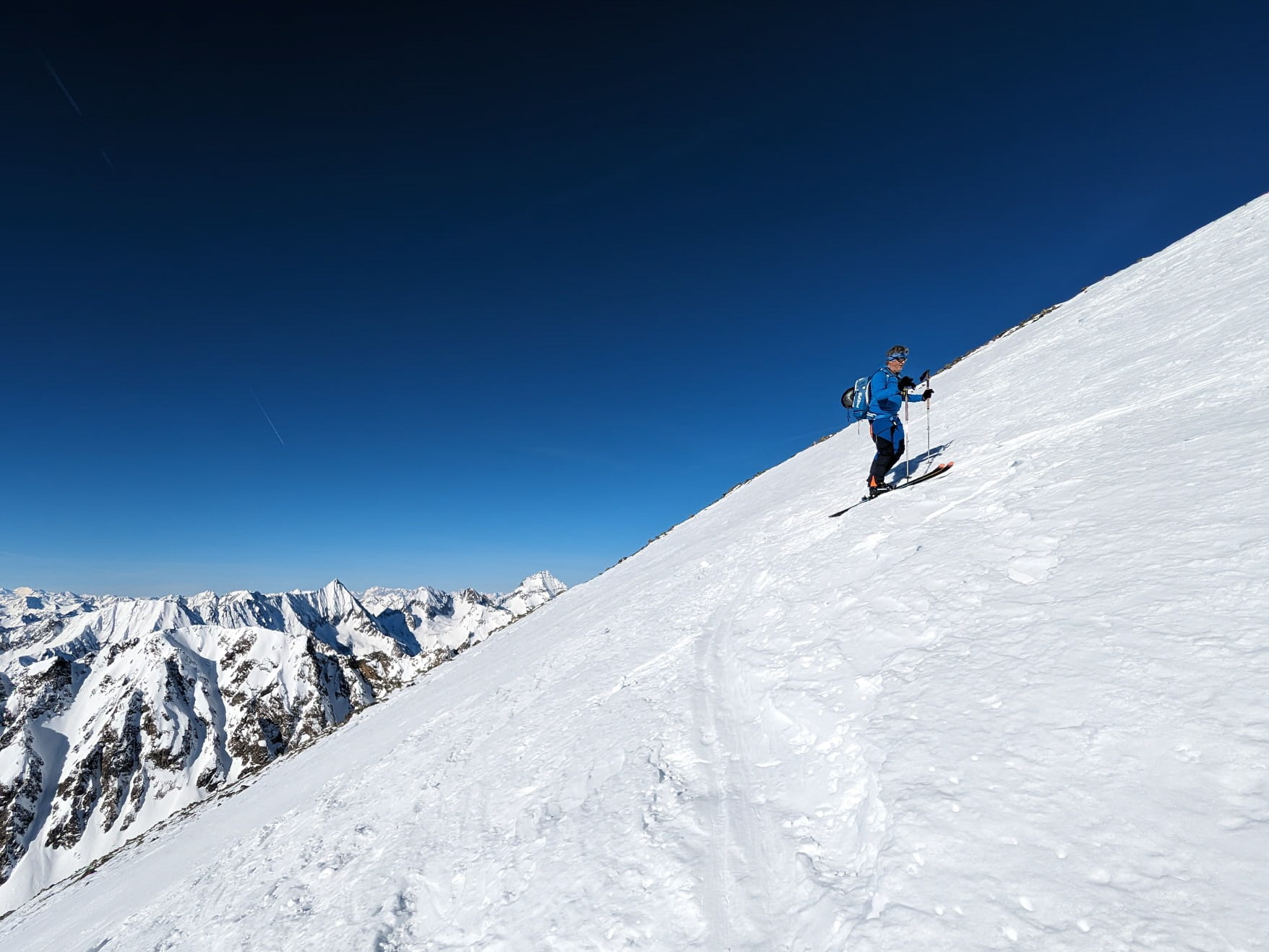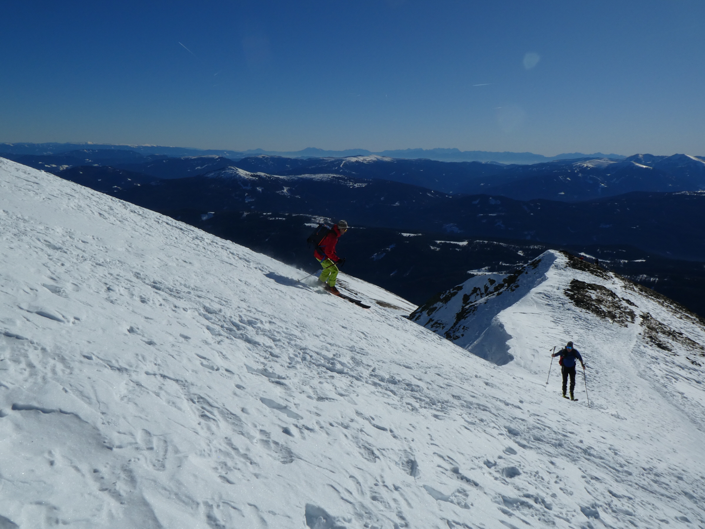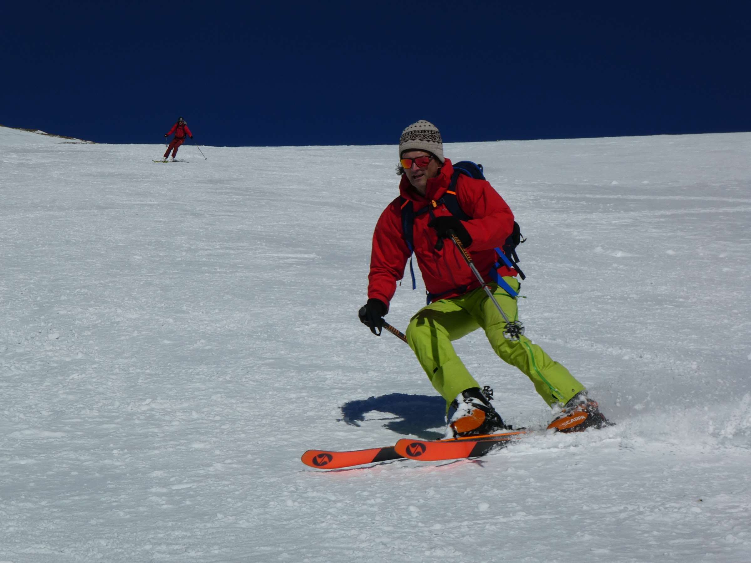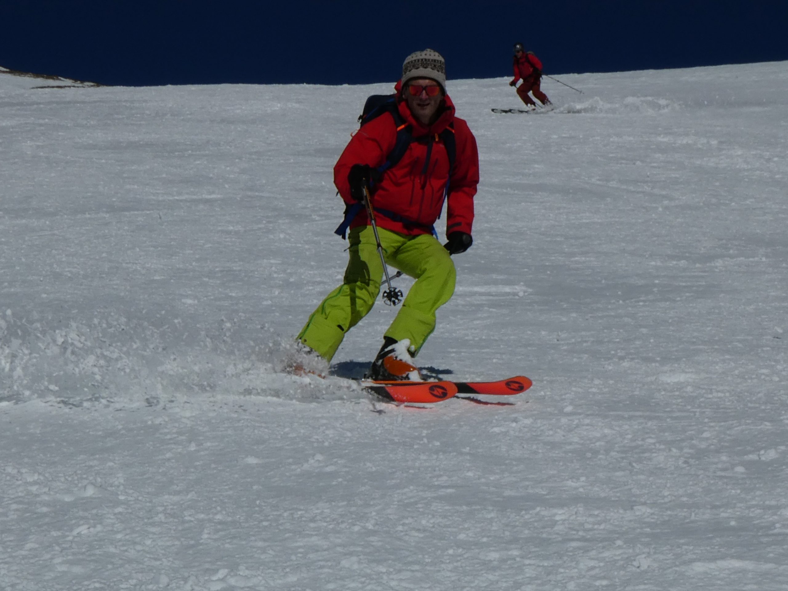 Schließlich sind wir wieder zum Vorgipfel abgestiegen bzw. abgefahren. Weitere nach uns Aufsteigende haben uns zwar vermittelt, dass es für eine Firnabfahrt noch zu früh sei, aber das hat uns nicht daran gehindert unsere Abfahrt gleich zu starten. Für den obersten Bereich war das wohl zutreffend, aber über 1.200 Hm wird man nie eine einheitliche Schneekonsistenz vorfinden. Ähnlich wie am Vortag war der fahrbare Untergrund anfangs auch hier gepresster Pulver, nur halt zerfahren.