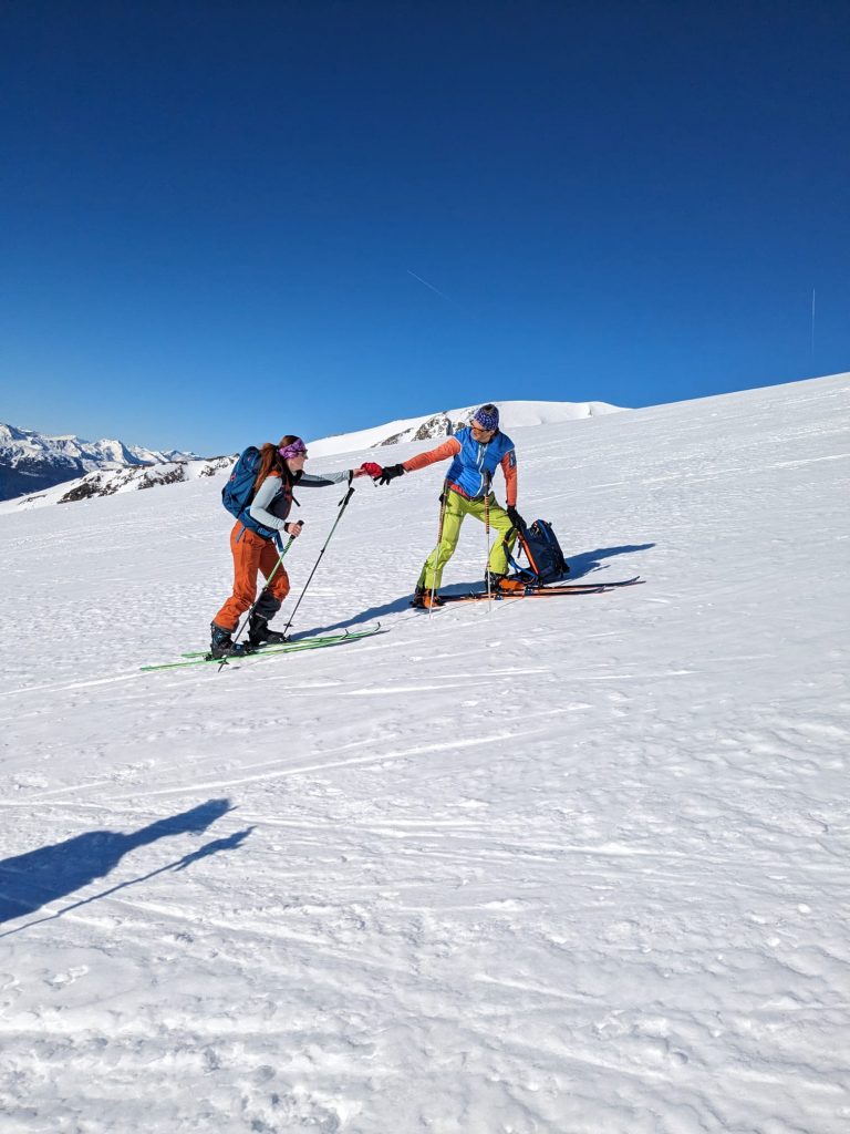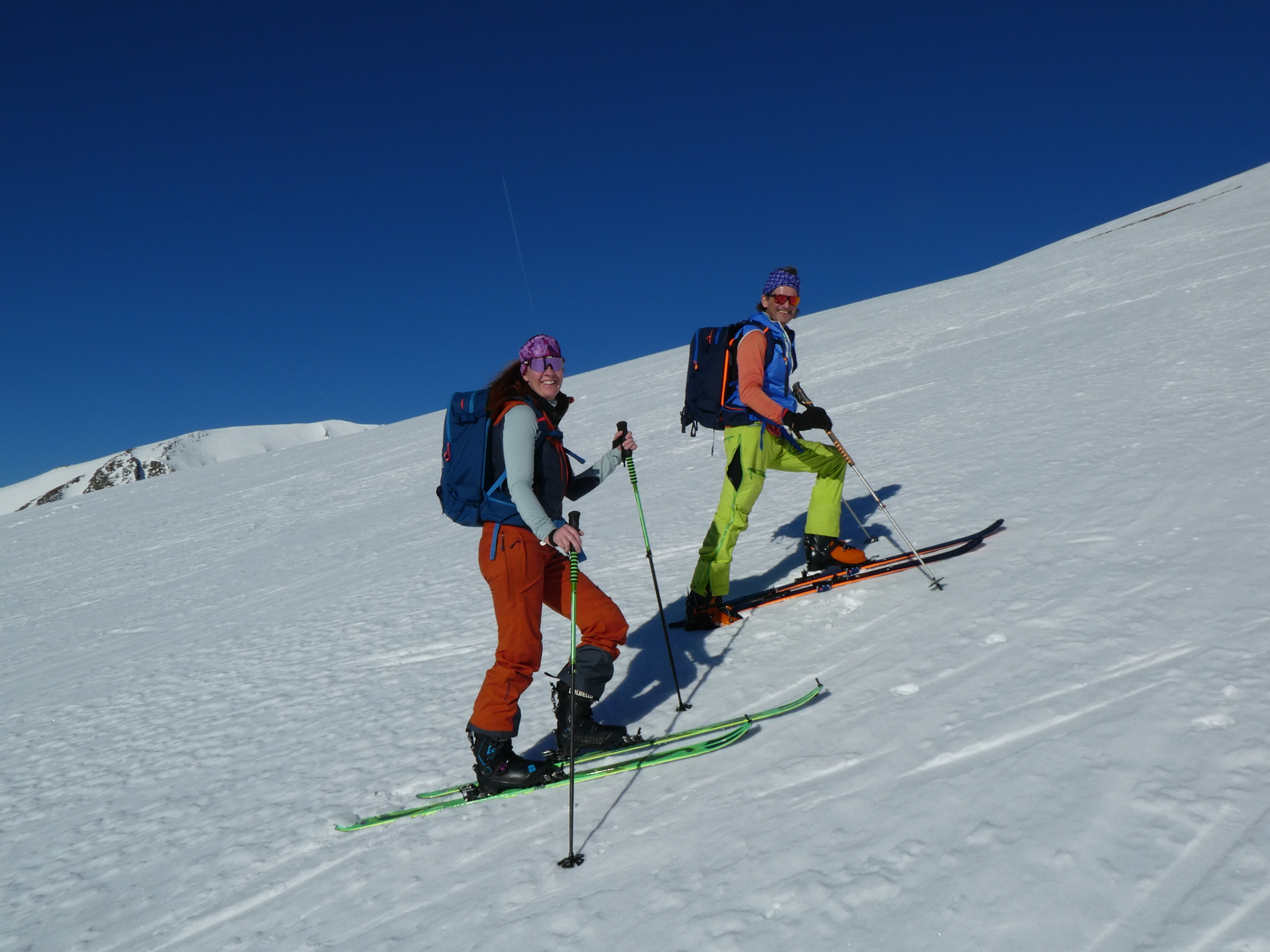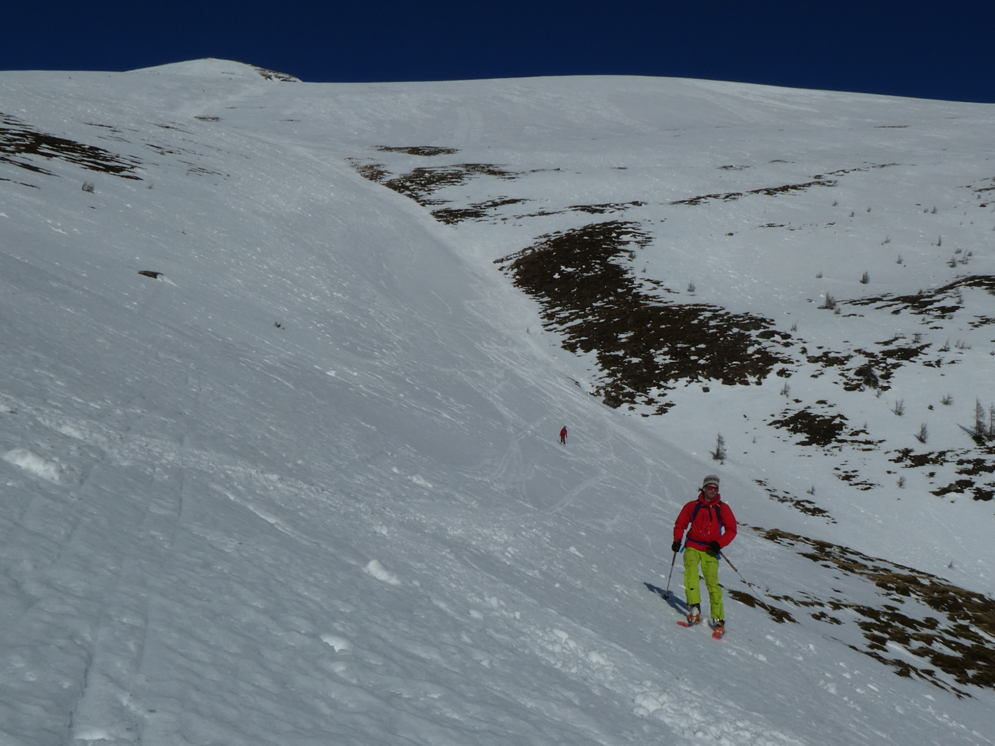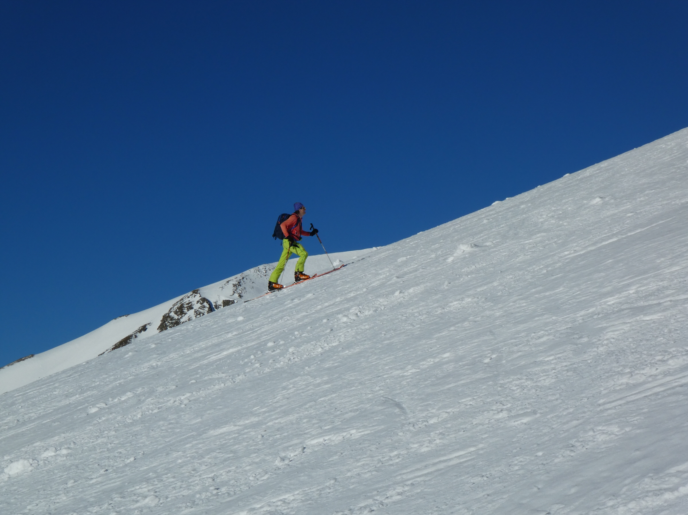 Schließlich sind wir wieder zum Vorgipfel abgestiegen bzw. abgefahren. Weitere nach uns Aufsteigende haben uns zwar vermittelt, dass es für eine Firnabfahrt noch zu früh sei, aber das hat uns nicht daran gehindert unsere Abfahrt gleich zu starten. Für den obersten Bereich war das wohl zutreffend, aber über 1.200 Hm wird man nie eine einheitliche Schneekonsistenz vorfinden. Ähnlich wie am Vortag war der fahrbare Untergrund anfangs auch hier gepresster Pulver, nur halt zerfahren.