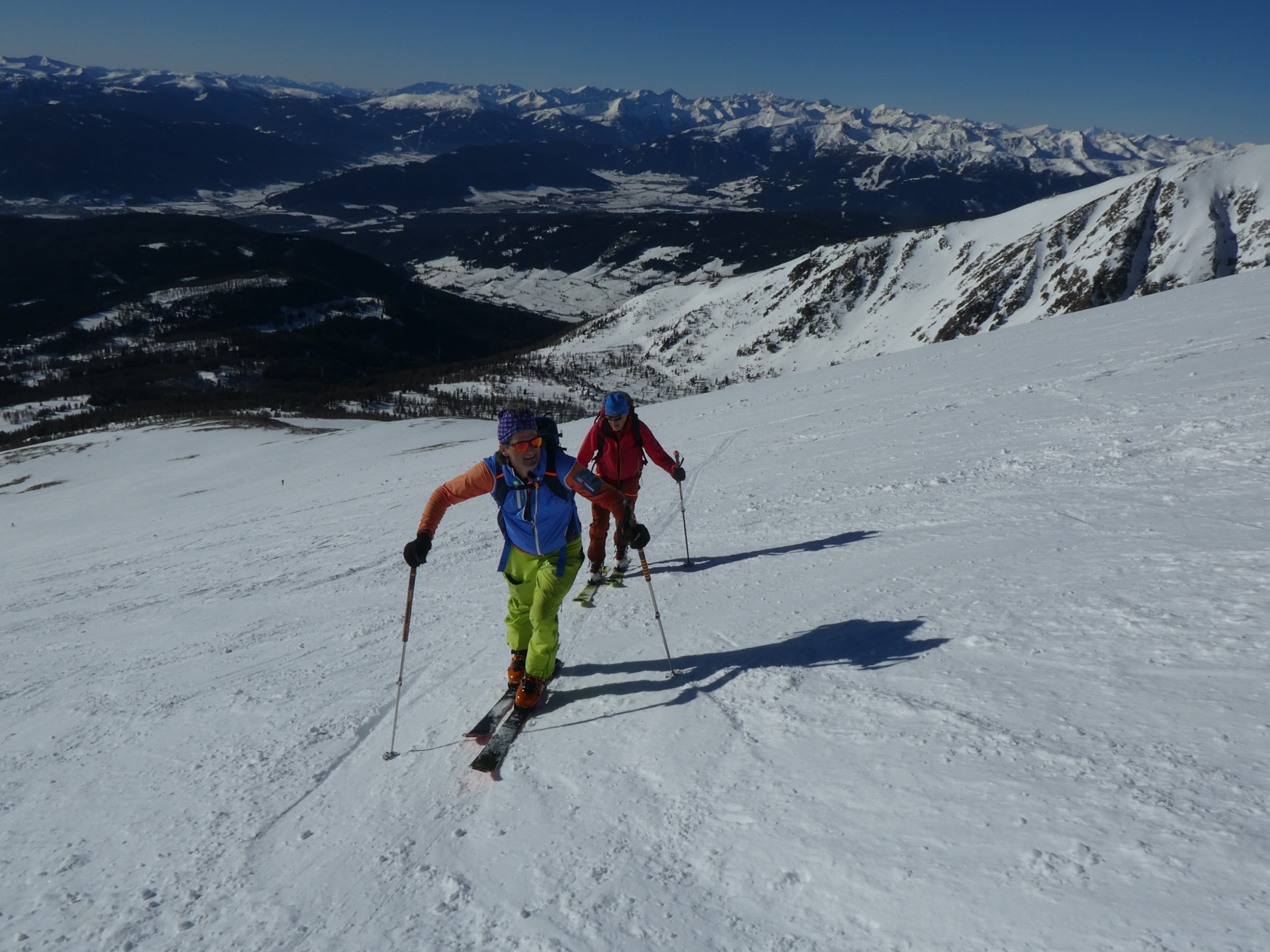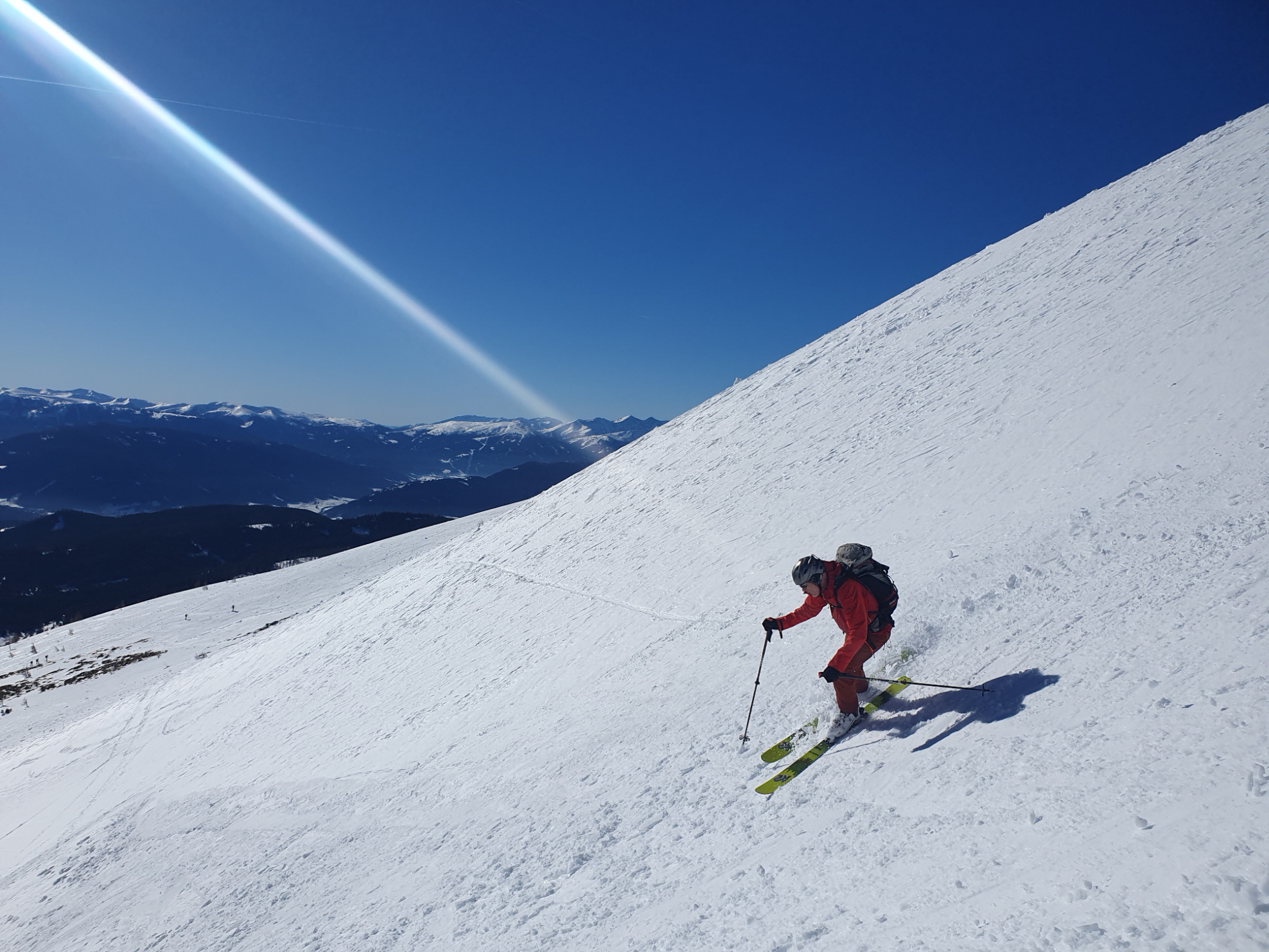 Bei anhaltend schönem Wetter war nach dem fordernden alpinen Mix des gestrigen Tages heute wieder einmal etwas gemütlichere Kost angesagt. Jedenfalls hat die Erfahrung mit den durch Regeneintrag massiv vereisten Flächen nach einer ausschließlich nach Süden ausgerichteten Exposition mit möglichst hohem Ausgangspunkt gerufen. Da war wieder einmal der Tourenklassiker aus meiner alten Heimat eine Bank.