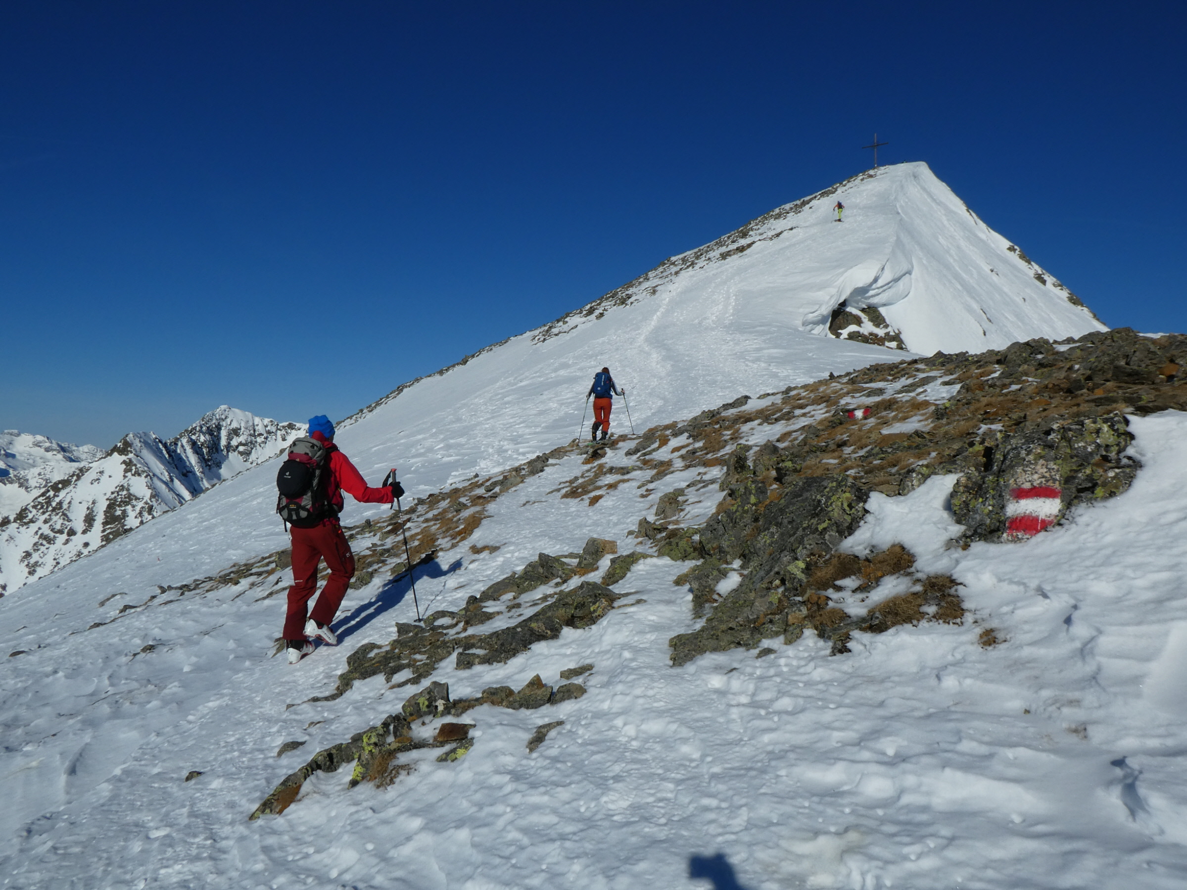 Nach der Pause sind wir in vielen Kehren zur Roßscharte und danach weiter zum Vorgipfel angestiegen. Dort haben Gerhard und ich unsere Skier im ausgeaperten Bereich oberhalb des Gedenkkreuzes deponiert, Andreas ist noch weiter auf Skiern angestiegen. Wir haben den kurzen Weg hinauf zum großen Gipfelkreuz mit dem Strahlenkranz ohne diese zurückgelegt.