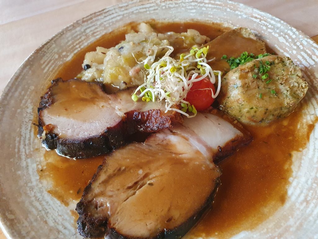 Die ansonsten gastliche Einkehrstätte hatte wegen Ruhetags leider geschlossen. Weil dies größtenteils auch für die Krakauer Gastronomie gilt, sind wir nach meinem Friedhofsbesuch gleich bis Murau weitergefahren. Dort wurden Gerhards und mein Hunger mit einem knusprigen Braten vom Schwein mit Kraut und Serviettenknödel gestillt. Andreas hat sich Heinrichs (Burger)Kritik nach unserer letzten gemeinsamen Einkehr zu Herzen genommen und diesmal heimische Kost geordert. Ob unser Kulinarikkritiker seinem Blunzengröstl oder doch unserem Schweinernen den Vorzug eingeräumt hätte, wird er mich bald einmal wissen lassen.