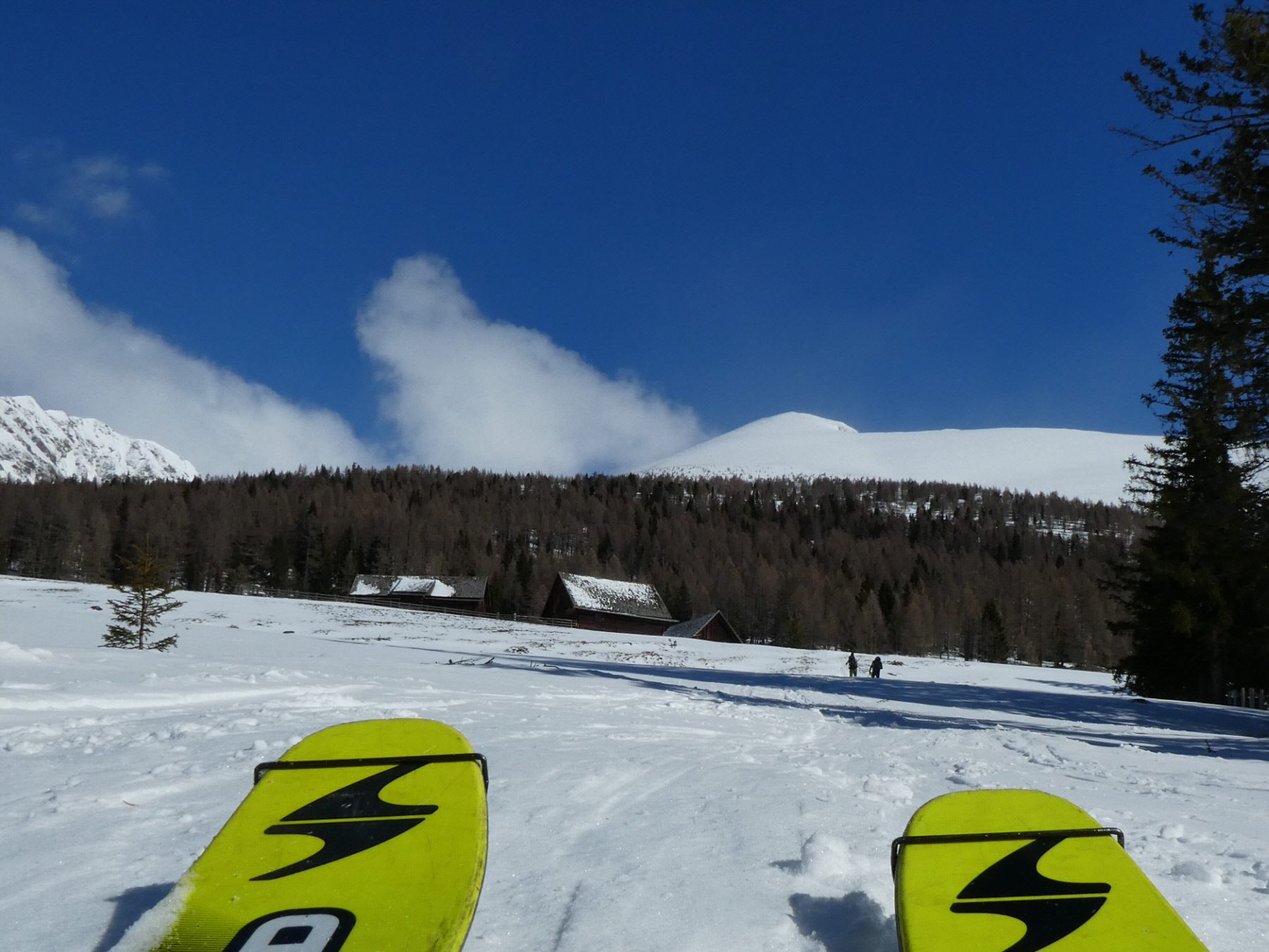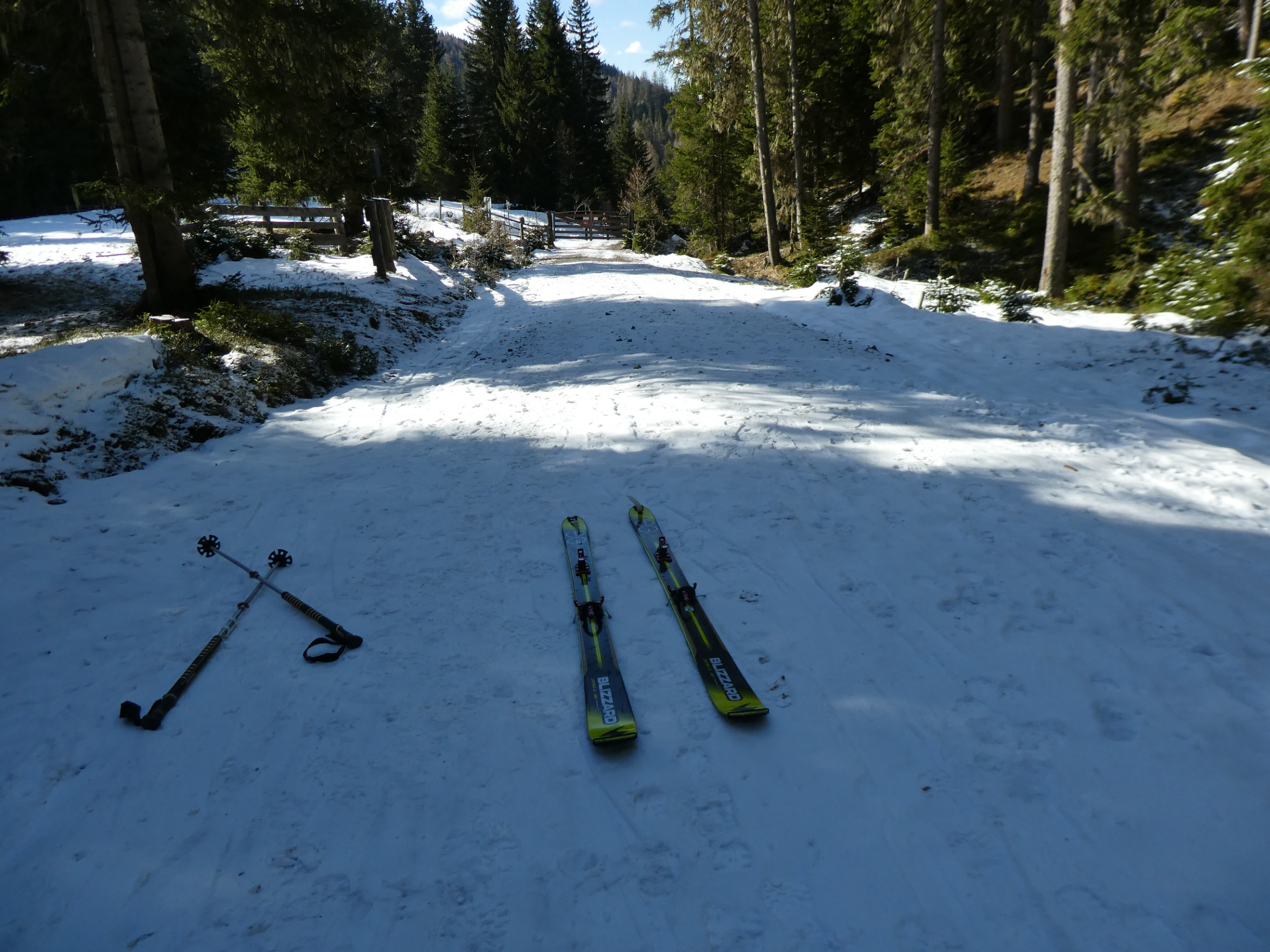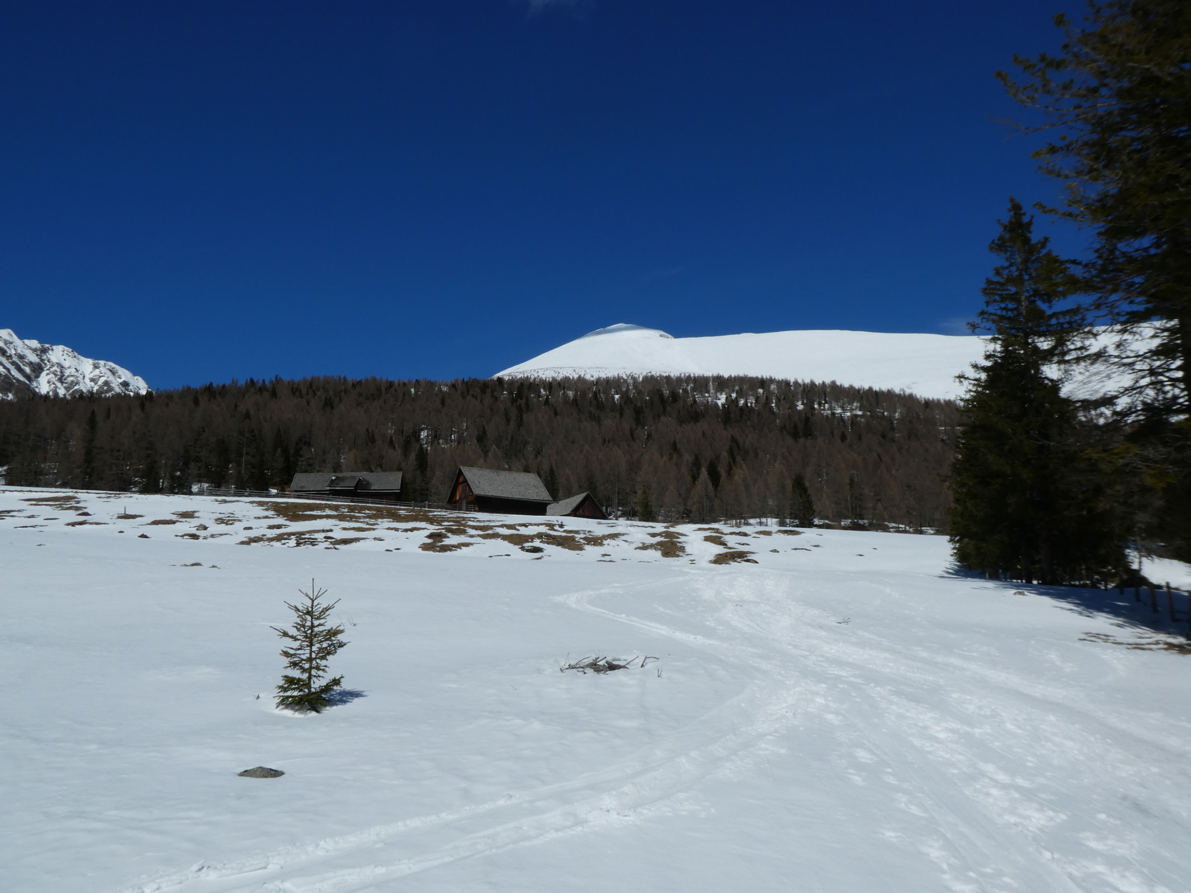 Etwas später als gewohnt bin ich beim Prebersee gestartet, um der Restbewölkung die Zeit zu geben, sich aufzulösen und dem Wind, sich zu beruhigen. Schon 100 m oberhalb des Gatters, bei dem vor 2 Wochen der Preberlauf (Christian Hoffmann hat in unglaublichen 46:49 min gewonnen) gestartet wurde, konnte ich anschnallen. Auf der stellenweise sehr dünnen Neuschneeauflage bin ich – immer am Weg bleibend – zur Prodingerhütte und nach einer kurzen Abkürzung der dortigen Wegkehre auch weiter am Weg zur Halterhütte angestiegen.
