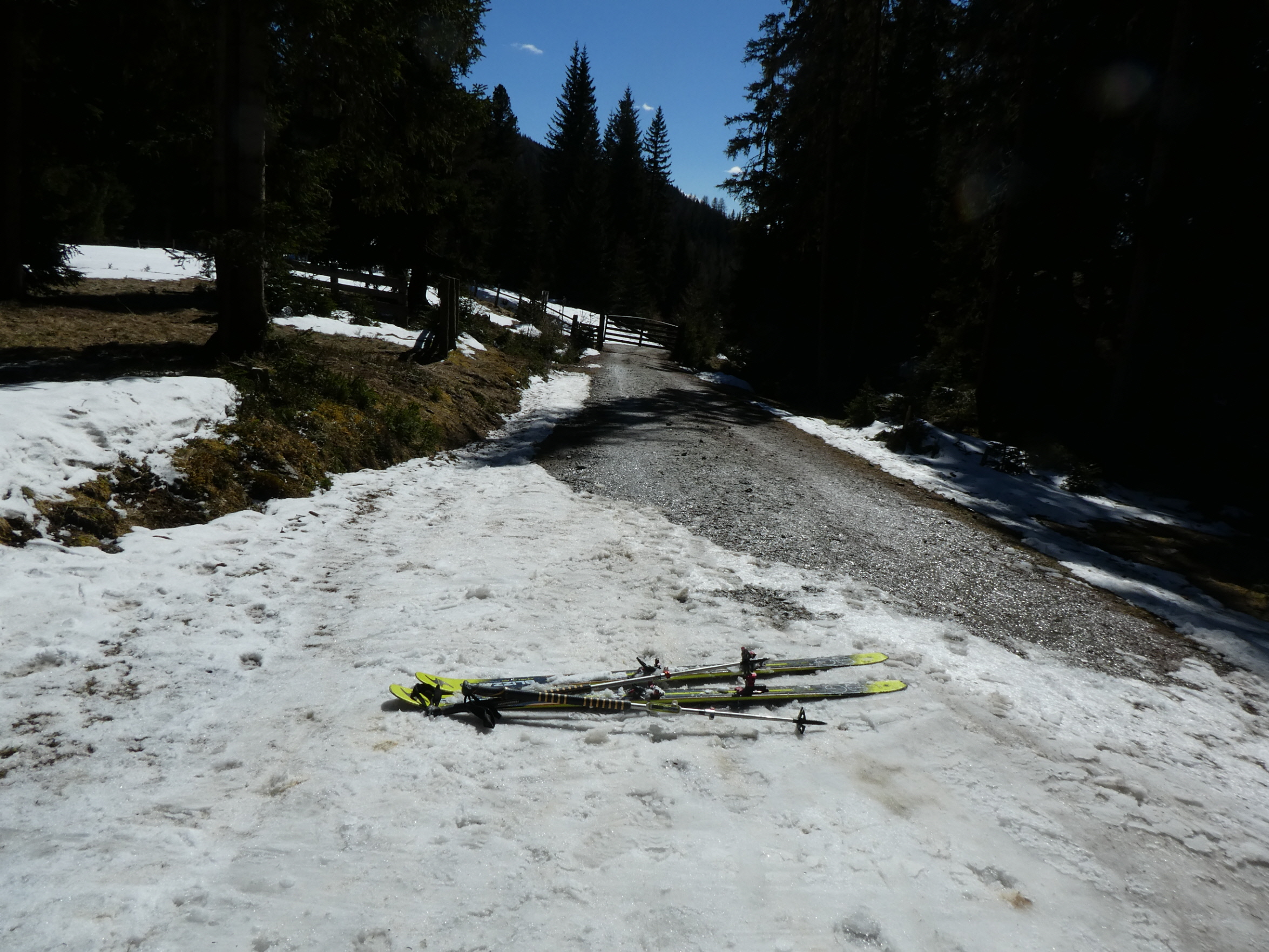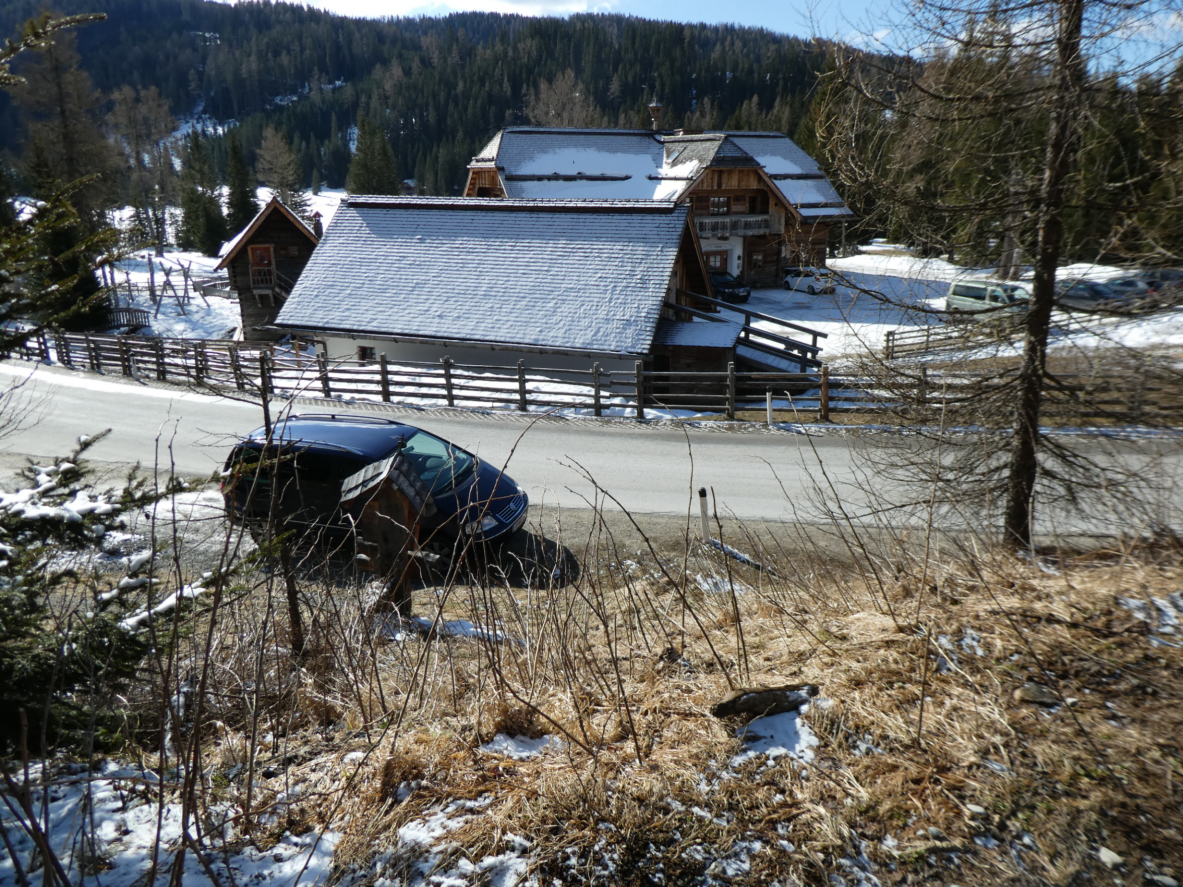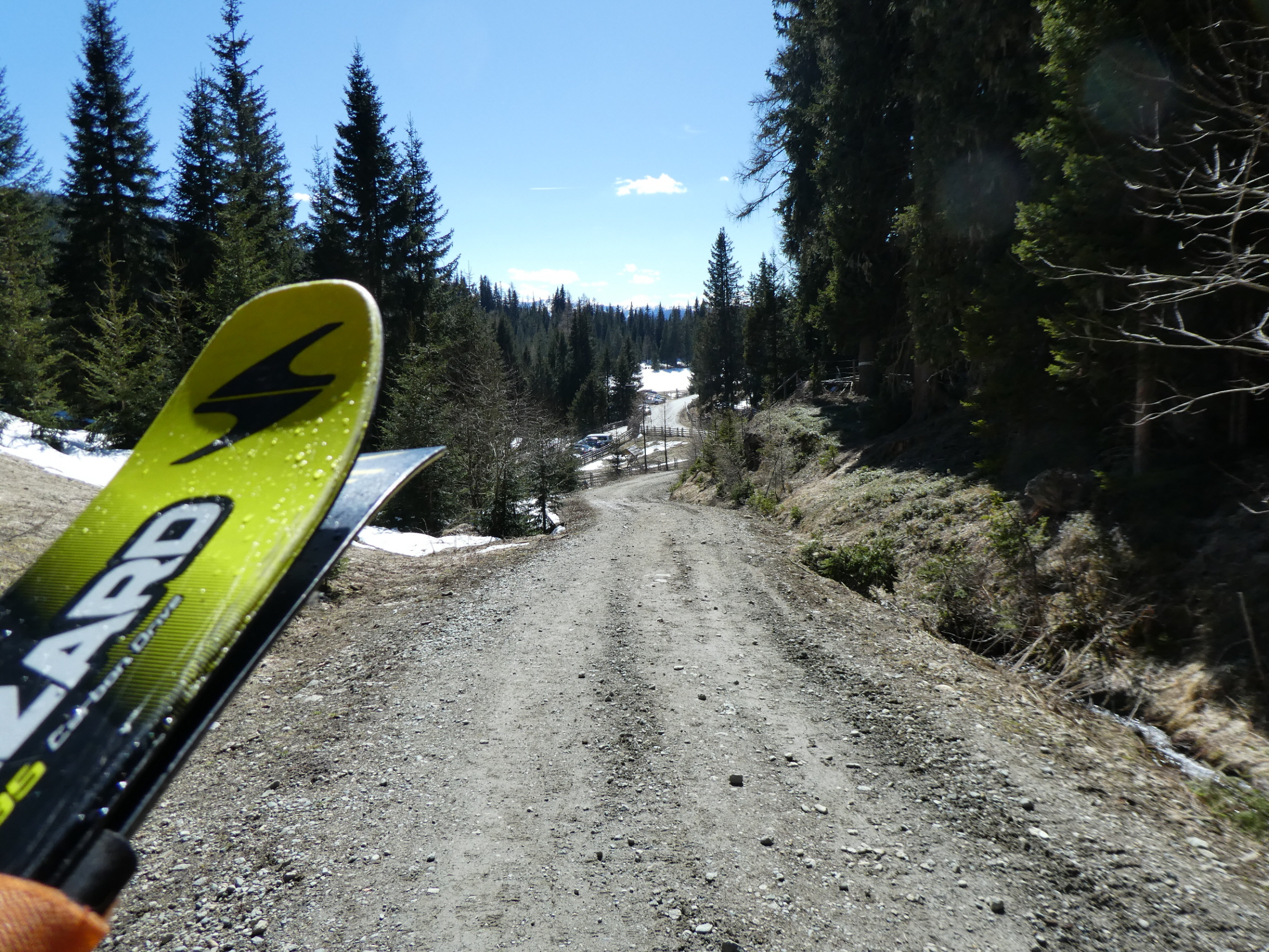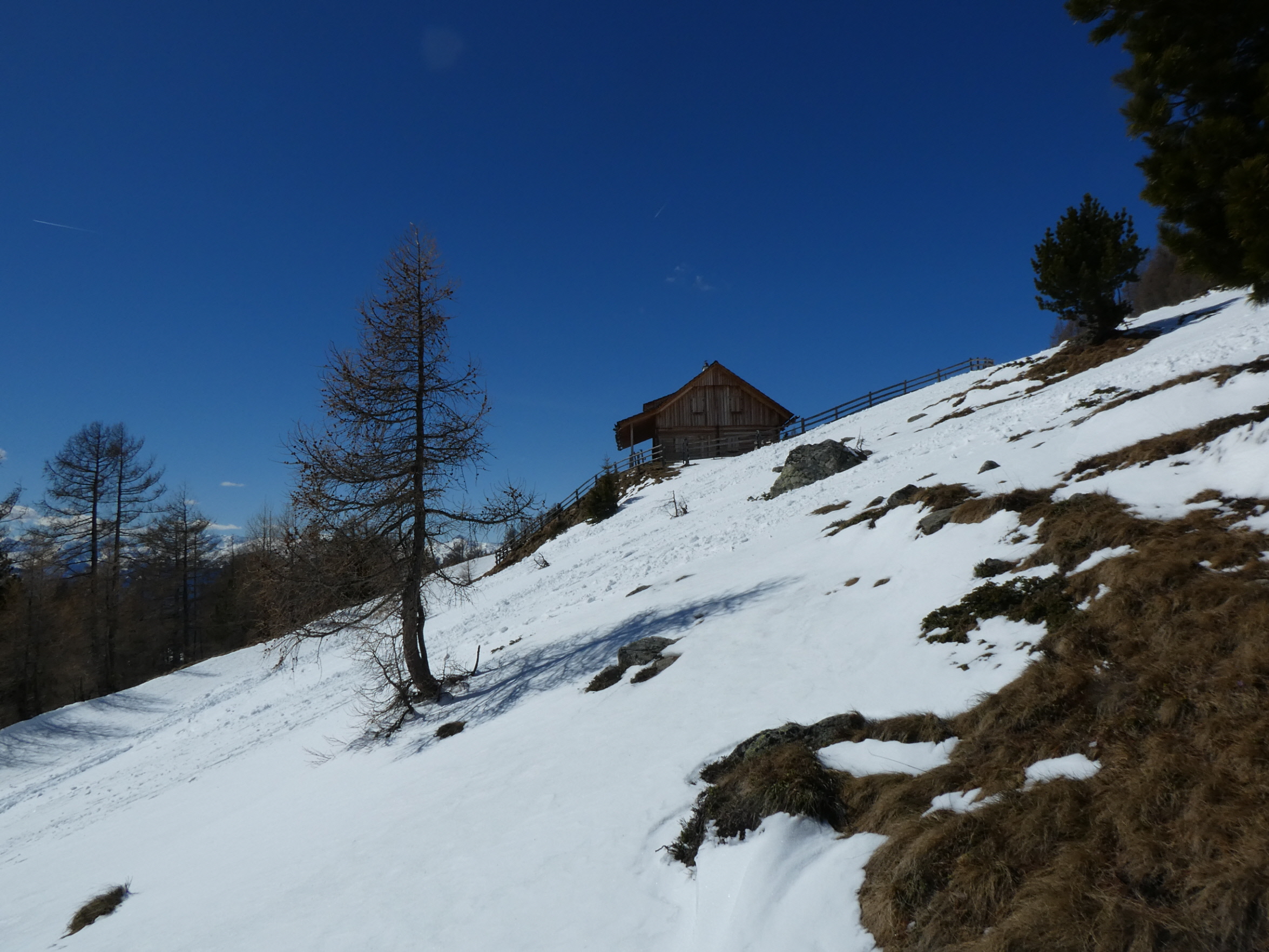 Etwas später als gewohnt bin ich beim Prebersee gestartet, um der Restbewölkung die Zeit zu geben, sich aufzulösen und dem Wind, sich zu beruhigen. Schon 100 m oberhalb des Gatters, bei dem vor 2 Wochen der Preberlauf (Christian Hoffmann hat in unglaublichen 46:49 min gewonnen) gestartet wurde, konnte ich anschnallen. Auf der stellenweise sehr dünnen Neuschneeauflage bin ich – immer am Weg bleibend – zur Prodingerhütte und nach einer kurzen Abkürzung der dortigen Wegkehre auch weiter am Weg zur Halterhütte angestiegen.