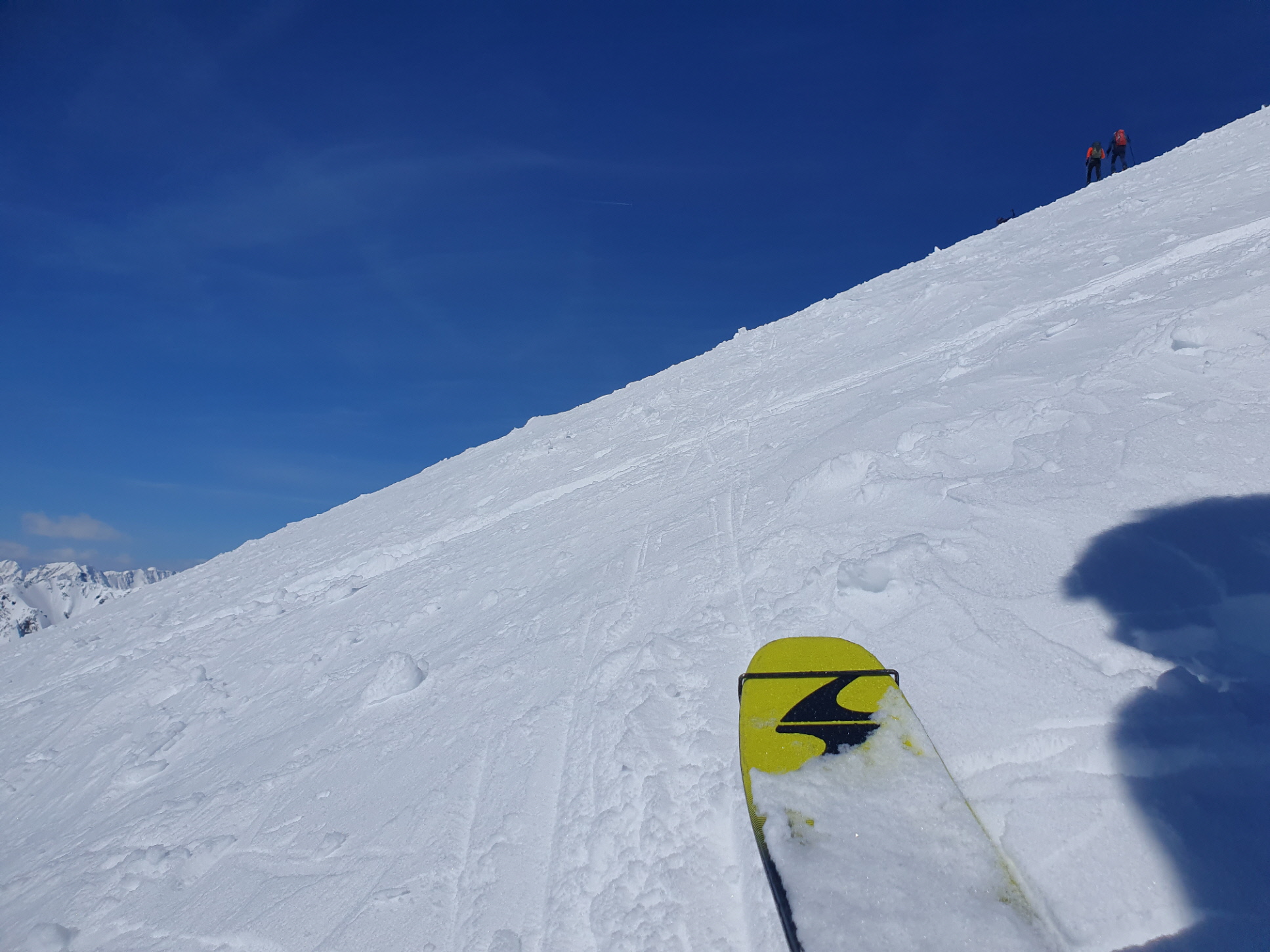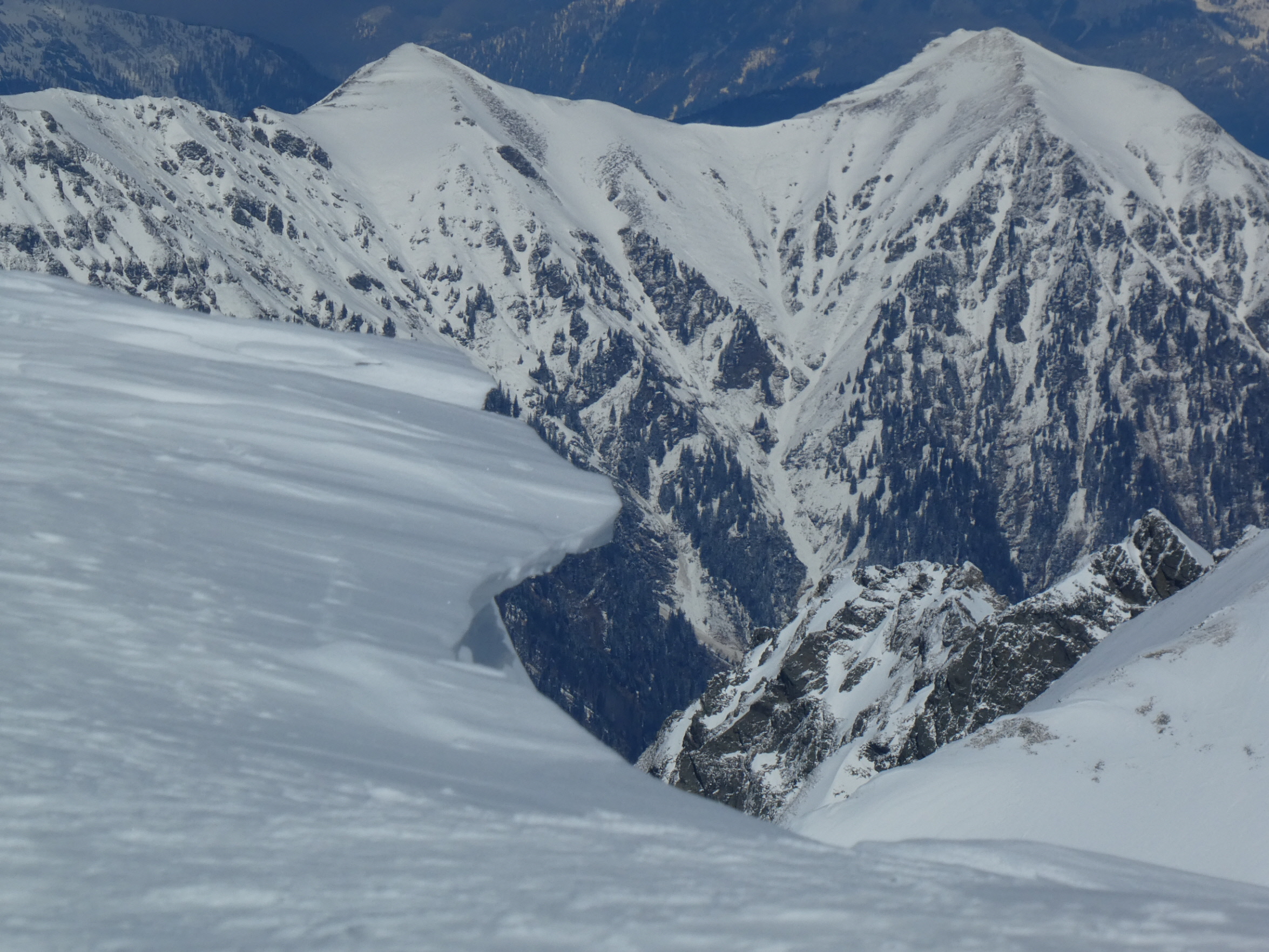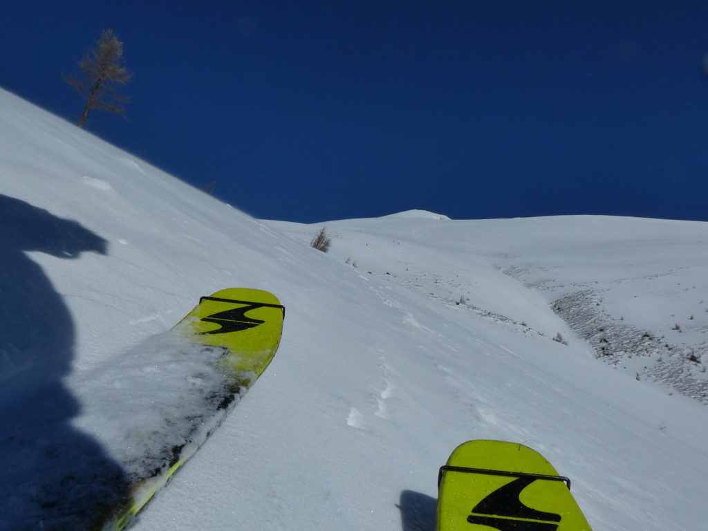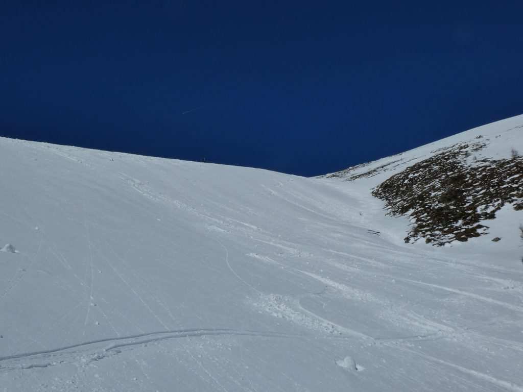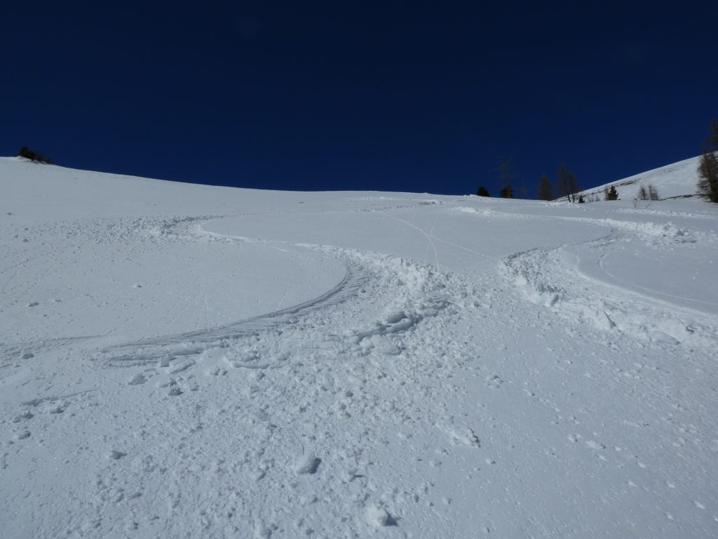 Ab da galt es, Spuren im etwas windgepressten, aber bestens fahrbaren Neuschnee zu ziehen. Dass ich dabei wegen meines späten Starts nicht der Erste war, hat dem Abfahrtsspaß keinen Abbruch getan. Sehr flott war ich wieder auf Höhe meines Rastplatzes vom Aufstieg. Jetzt bin ich aber im Verlauf der Rinne geblieben. Die Sonne hatte den Schnee in diesem Bereich schon leicht umgewandelt. Der nasse Pulver war aber auch bestens fahrbar.