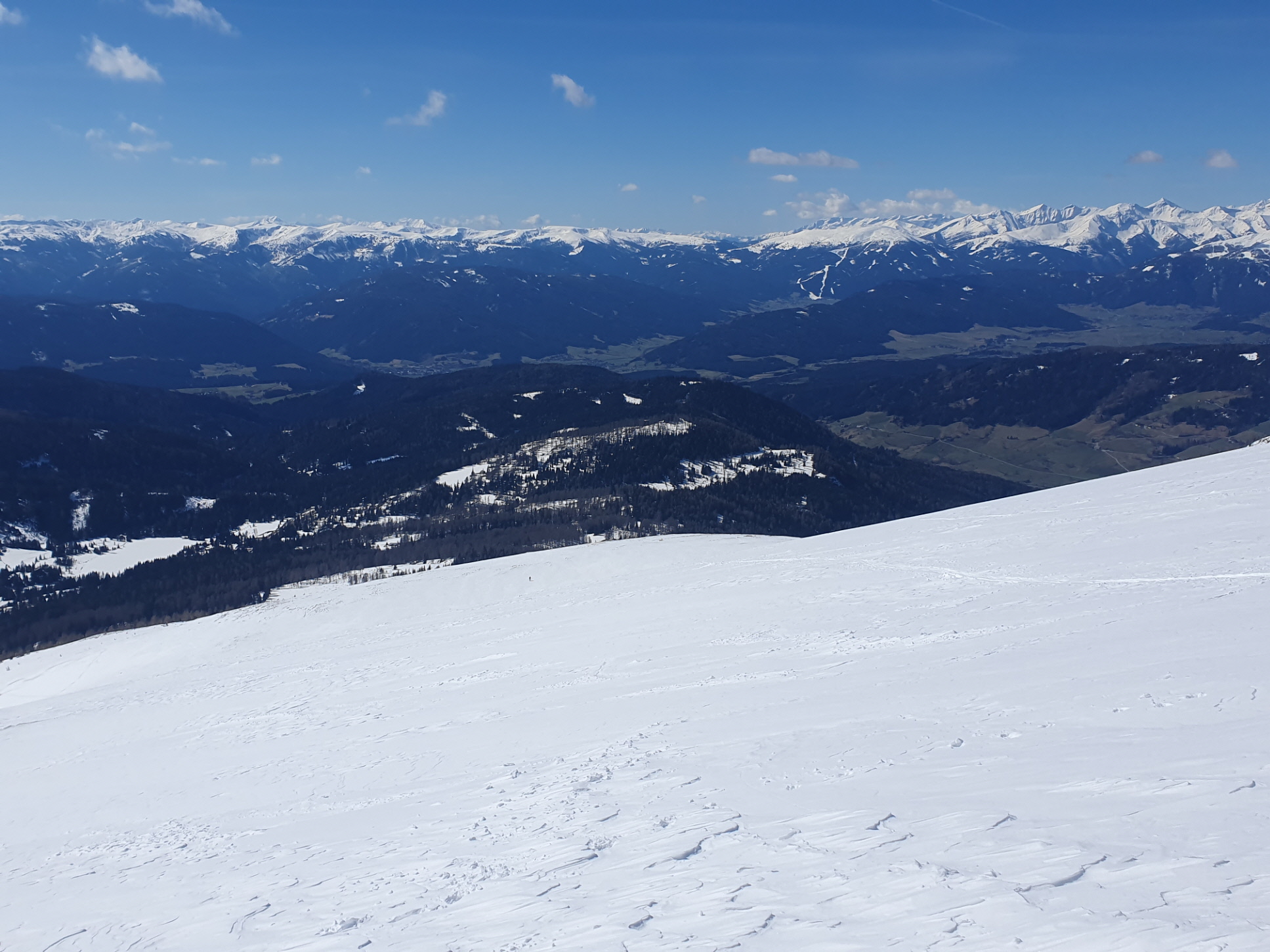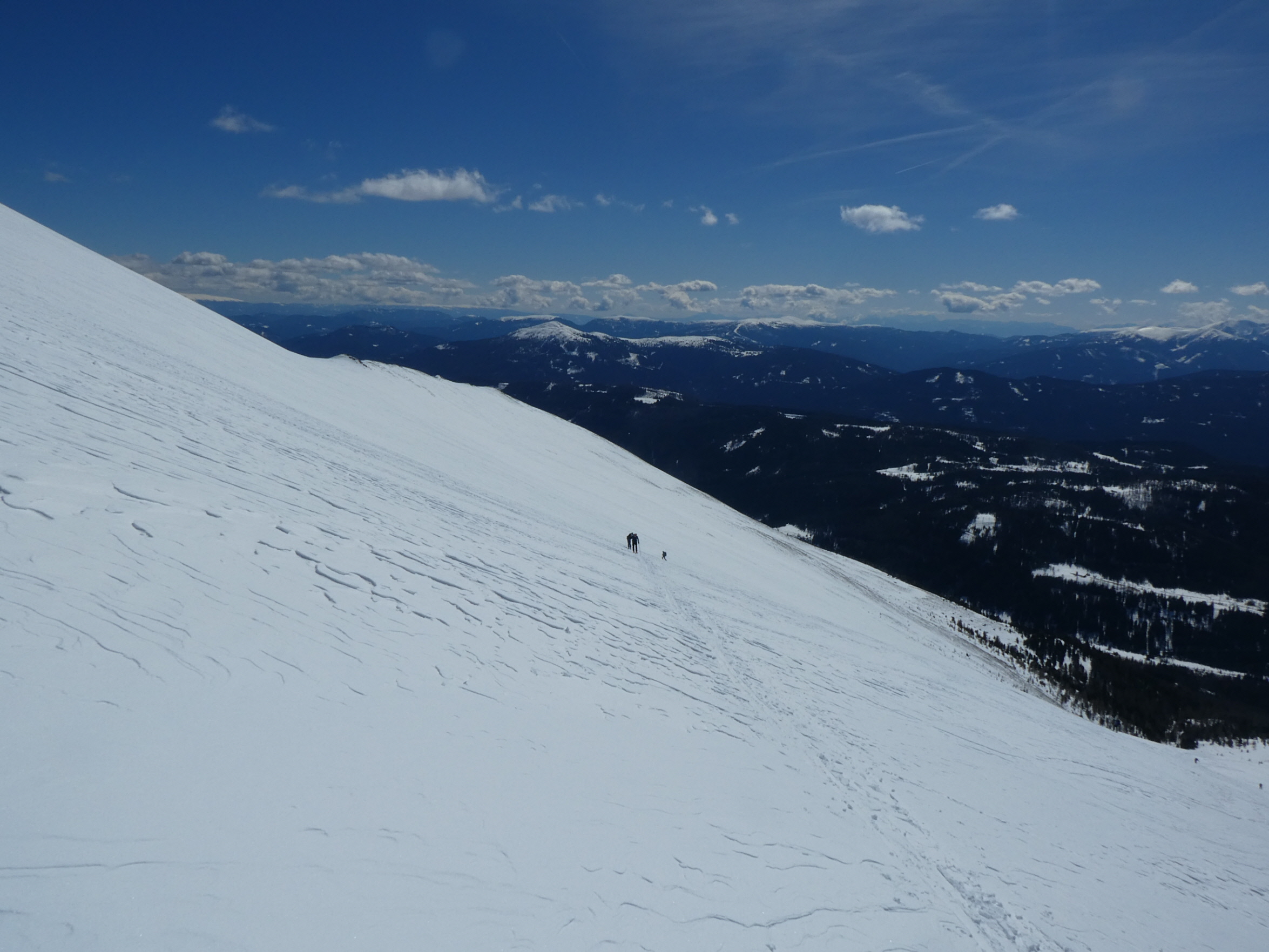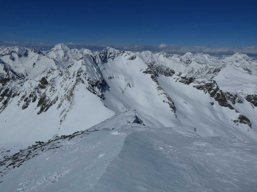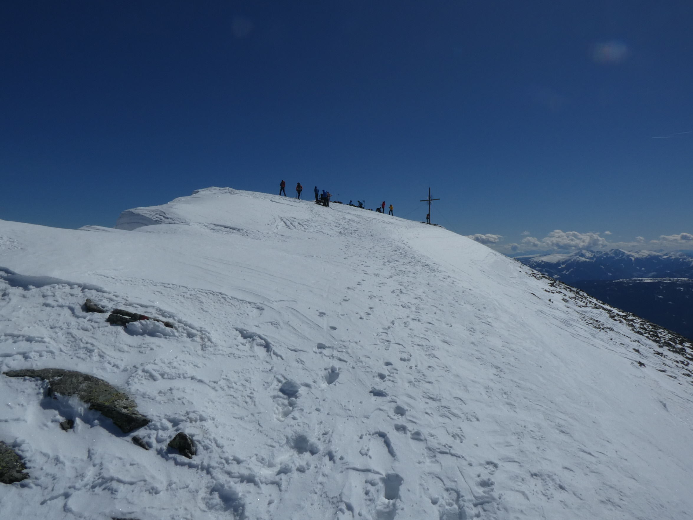 Der Wind war in der Zwischenzeit nahezu vollkommen eingeschlafen. Daher stand einer ausreichenden Gipfelrast mit viel in die nahe und fernere Bergwelt Schauen nichts im Wege. Während sich das Krakauer Hochtal bereits frühlingshaft zeigt, präsentieren sich die höheren Regionen noch im frischen Winterkleid. Eine Spur durch den Neuschnee wurde an diesem Tag auch durch das Moarkar in Richtung Roteck gezogen.
