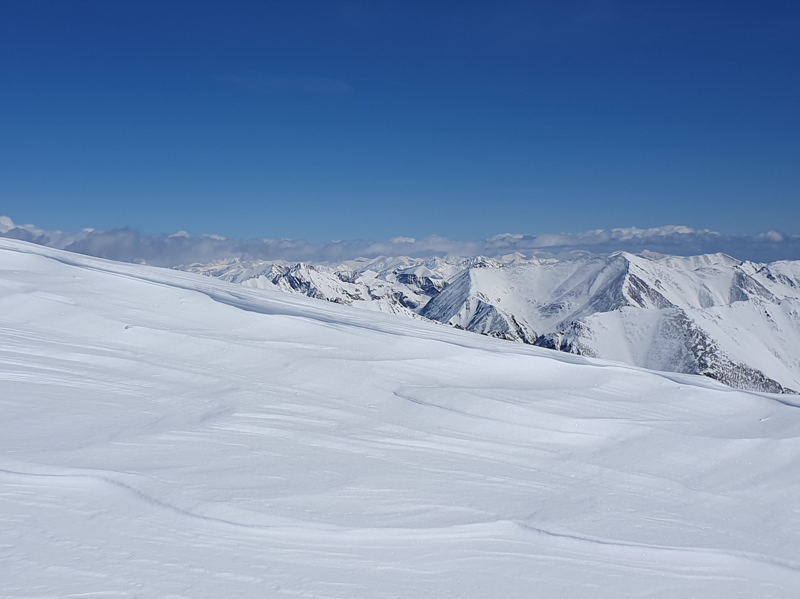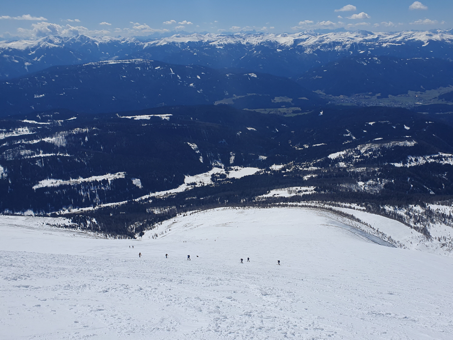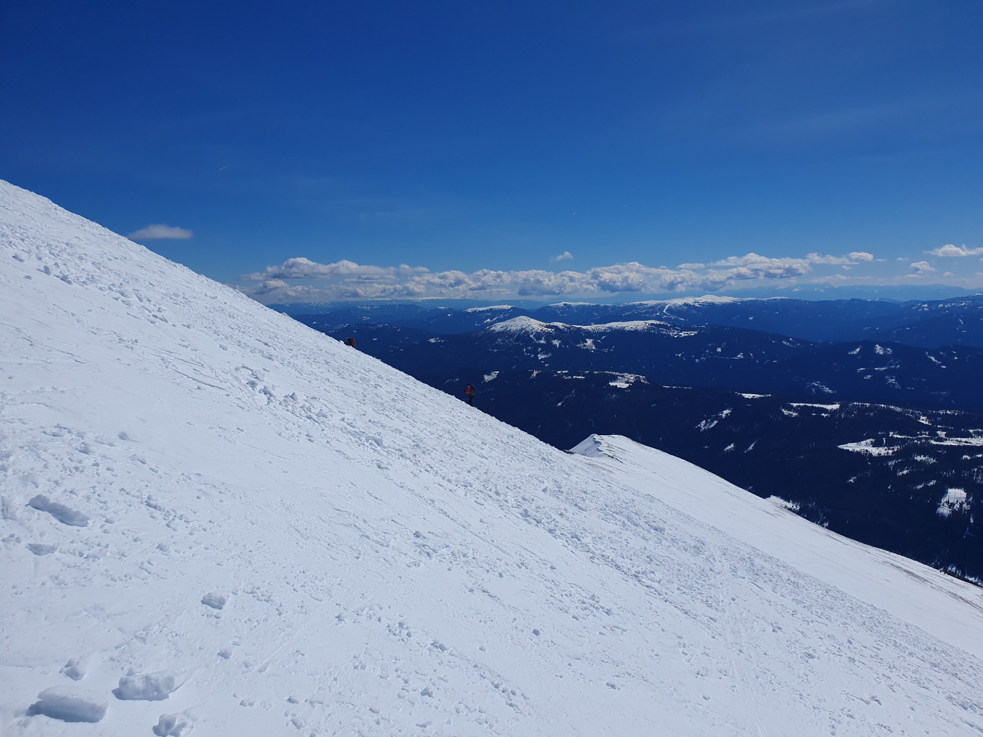 Der Wind war in der Zwischenzeit nahezu vollkommen eingeschlafen. Daher stand einer ausreichenden Gipfelrast mit viel in die nahe und fernere Bergwelt Schauen nichts im Wege. Während sich das Krakauer Hochtal bereits frühlingshaft zeigt, präsentieren sich die höheren Regionen noch im frischen Winterkleid. Eine Spur durch den Neuschnee wurde an diesem Tag auch durch das Moarkar in Richtung Roteck gezogen.