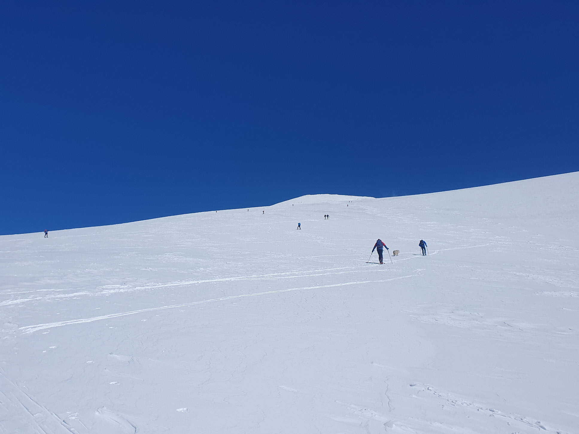 Die bei der Anfahrt den Gipfel noch umhüllende Restbewölkung hatte sich zu diesem Zeitpunkt bereits verzogen, Schneefahnen haben mir aber signalisiert, dass es zu diesem Zeitpunkt in der Gipfelregion noch sehr windig war. Entlang einer gut ausgetretenen, aber vom Wind stellenweise gleich wieder zugewehten, Spur ging es aufwärts.