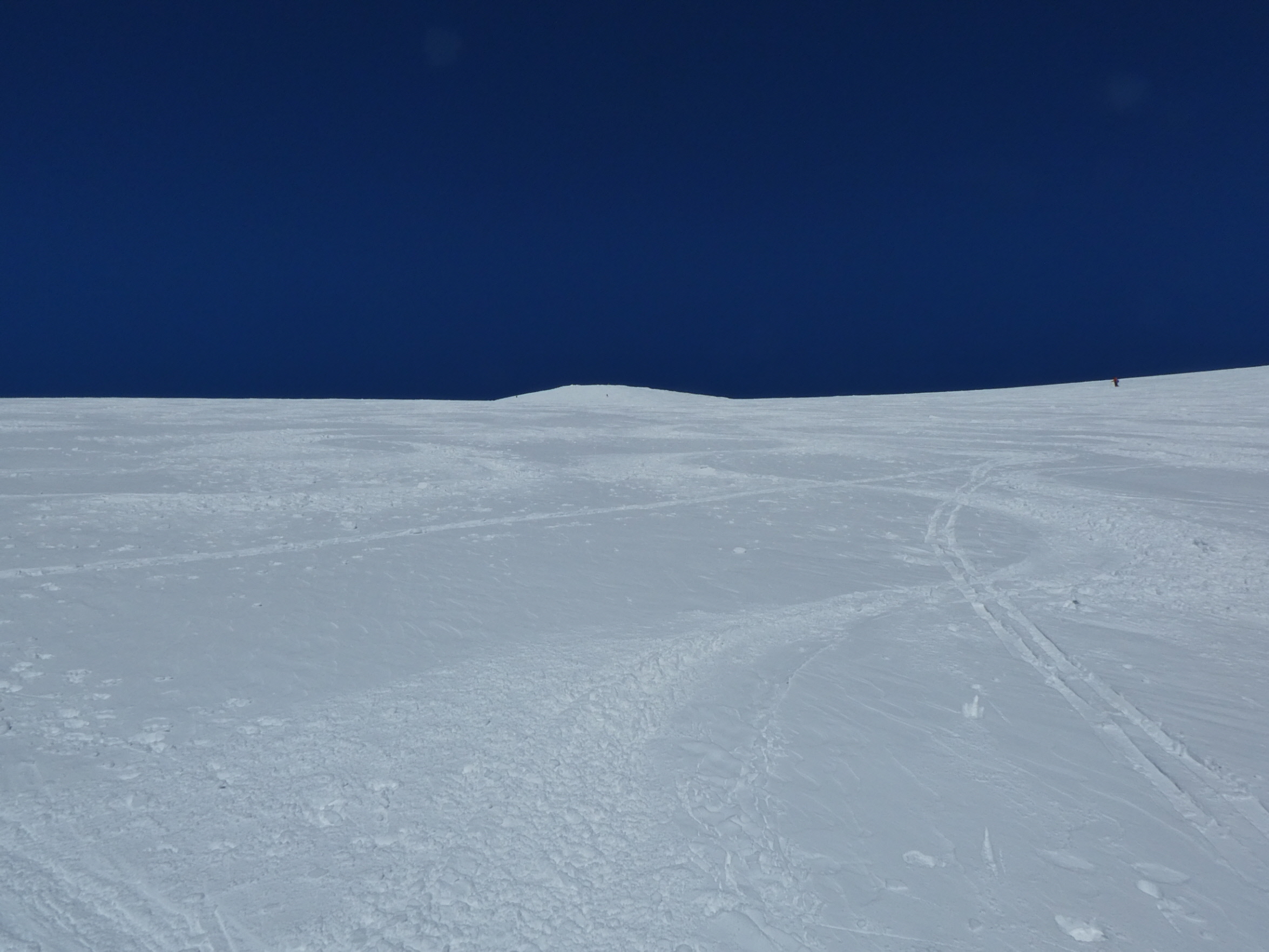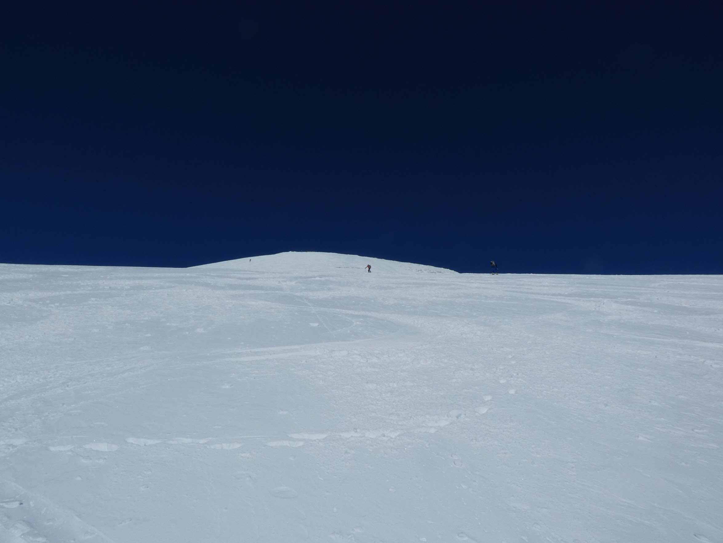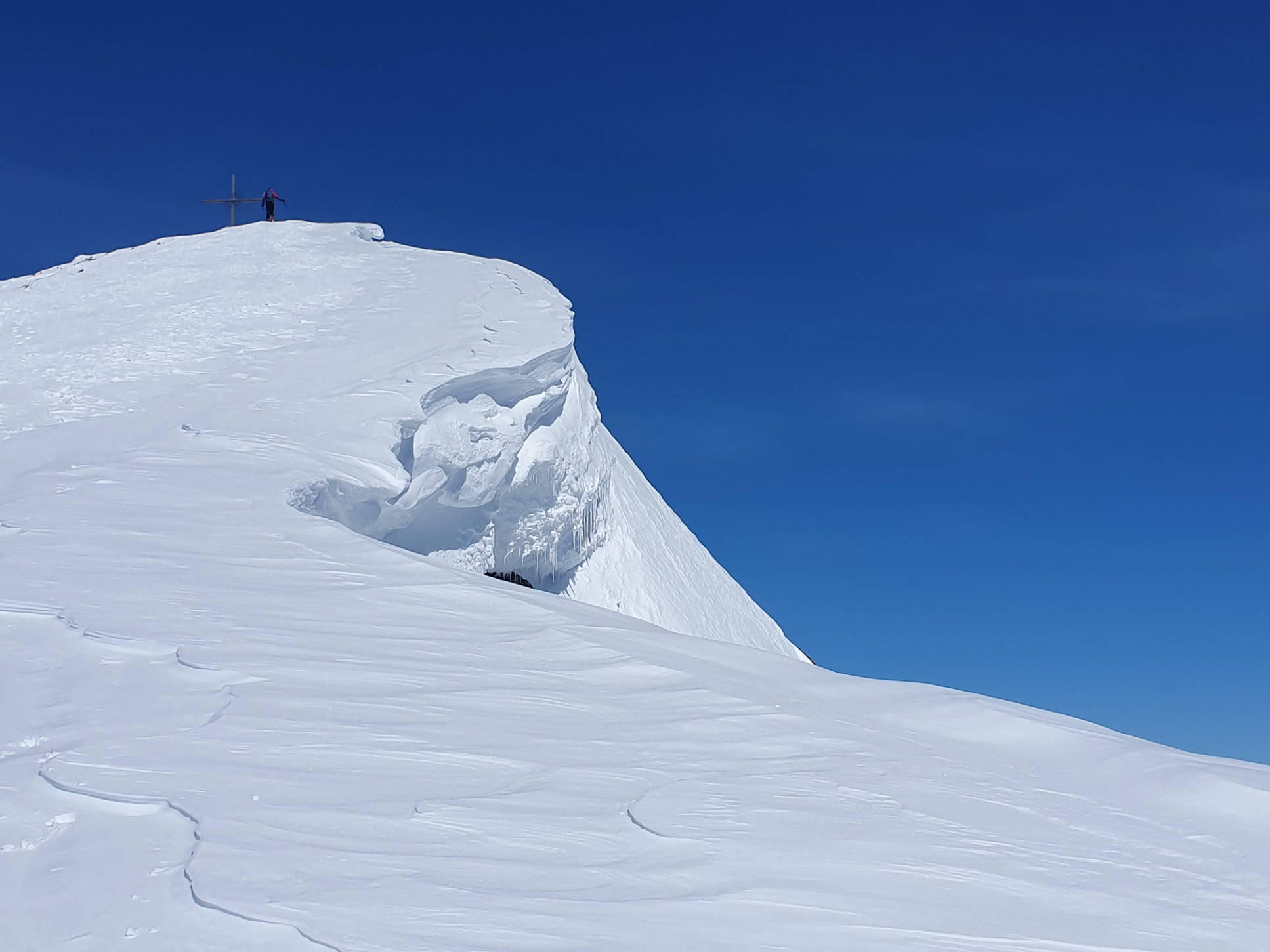 Schlussanstieg vorbei an der mächtigen Wechte unter dem Gipfelaufbau