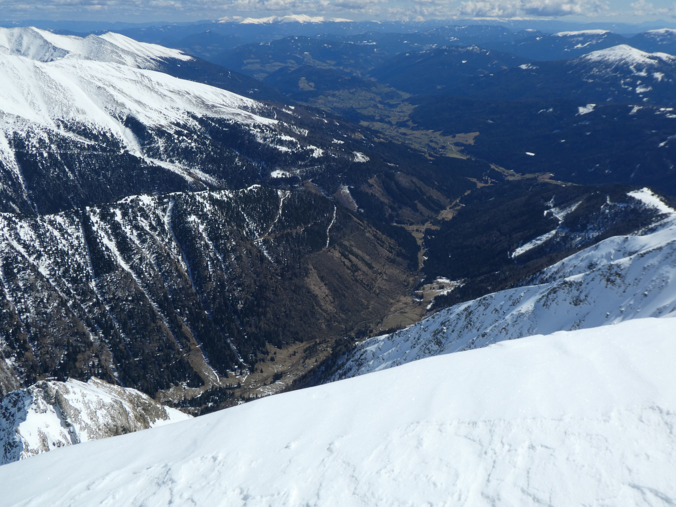 Der Schnee ist während der am Ende des letzten Tourenberichts angekündigten Pause ordentlich weggeschmolzen. Für die Osterwoche war die Wetterprognose für den heutigen Montag am allerbesten. Da hat es sehr gut gepasst, dass am gestrigen Palmsonntag zumindest ein bisschen Neuschnee dazu gekommen ist. Den vorösterlichen Grab- und Verwandtenbesuch in der Krakau konnte ich daher mit einer Skitour auf den Preber bei – für den zu Ende gehenden Winter – ausgezeichneten Schneeverhältnissen verbinden.