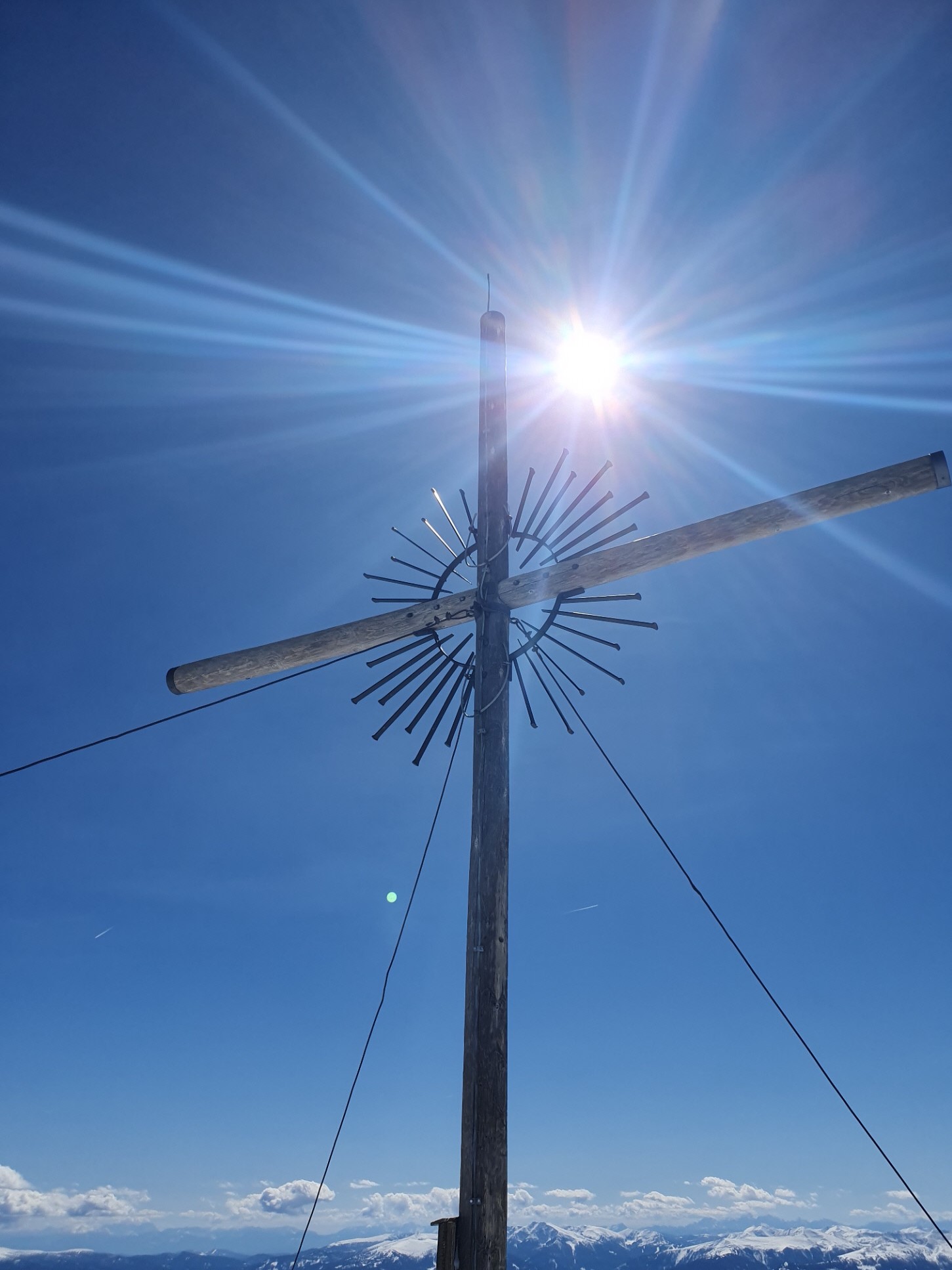 Nach dem Umrüsten habe ich meine Abfahrt direkt neben dem immer wieder schönen Gipfelkreuz mit dem Strahlenkranz begonnen. Über den Vorgipfel ging es hinunter in den ersten etwas ruppigen Hang bis hinunter auf Höhe der Roßscharte.