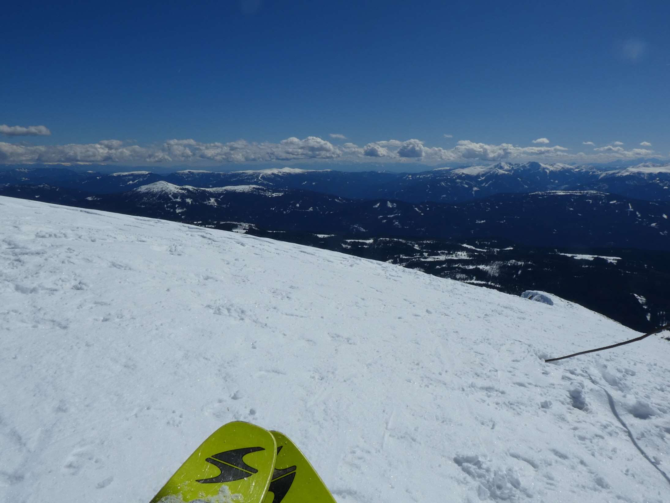 Oberhalb der Roßböden habe ich mir eine Trinkpause gegönnt und bei dieser Gelegenheit auch die Harscheisen montiert. Der Wind war gnädig und mit der Sonne im Rücken bin ich ohne die Oberbekleidung ergänzen zu müssen weiter angestiegen. Am Vorgipfel ist die Schneelage derzeit besser als beim letzten Anstieg vor knapp 2 Monaten. Daher konnte ich problemlos auf Skiern bis zum Gipfelkreuz ansteigen.