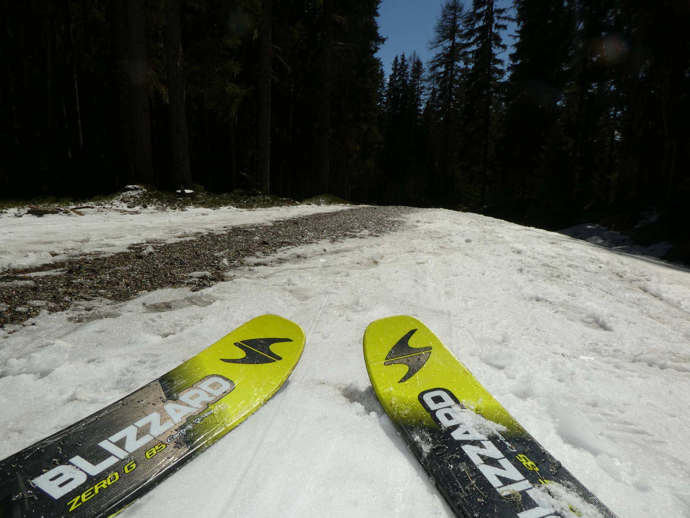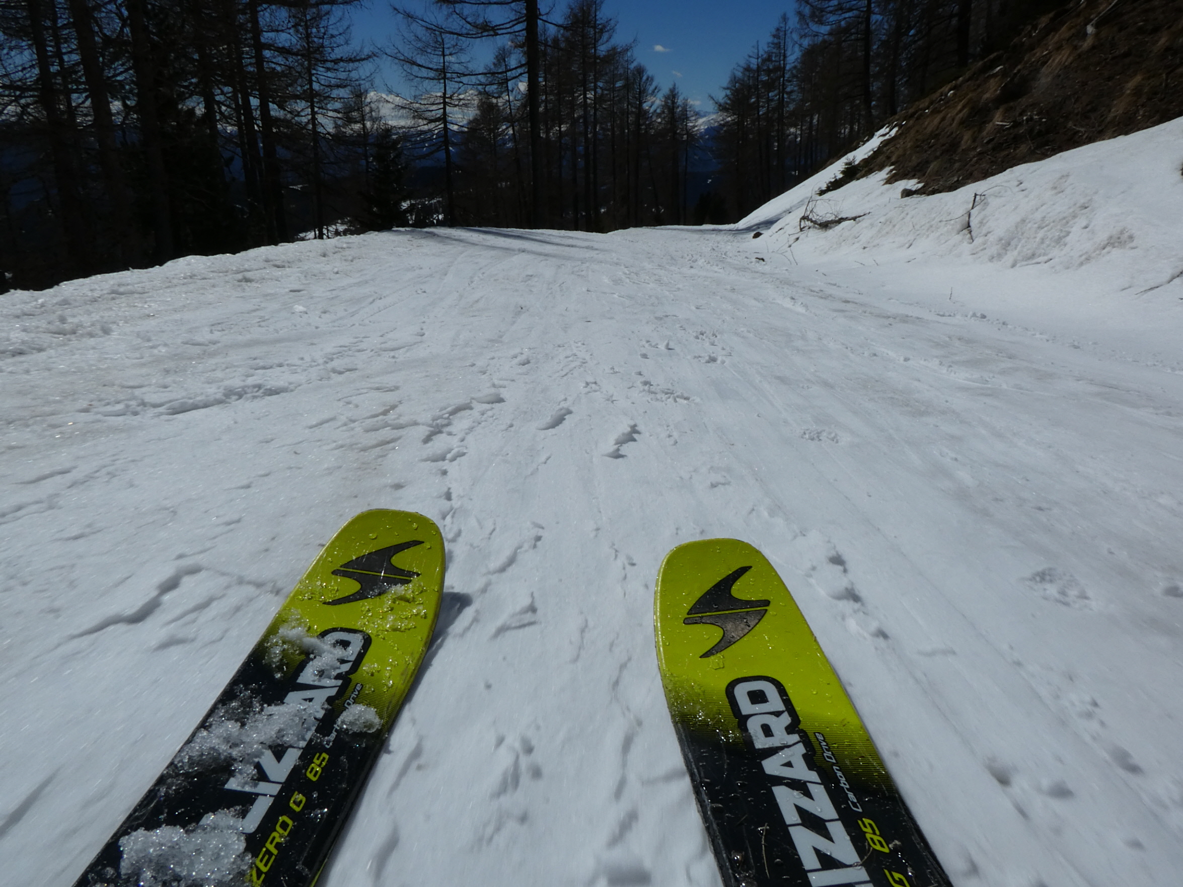 Auf den letzten Hängen hinunter bis zur Halterhütte hat sich die Neuschneeauflage auf der darunterliegenden festen Altschneeschicht schon geschmiert. Ein wahrer Genuss! Danach galt es nur mehr, am Weg – wieder mit einem kurzen Abschneider bei der Prodingerhütte – abzufahren. Sehr flott war dieser Teil erledigt. Erst ganz zum Schluss, dort wo man auf Höhe des Weg–S bei guter Schneelage im Aufstieg über einen kurzen Hohlweg abkürzt. Habe ich einmal für 100 m abgeschnallt, weil der Neuschnee inzwischen schon wieder weggetaut war. Danach bin ich noch bis zu jenem Punkt abgefahren, wo ich in der Früh angeschnallt hatte.