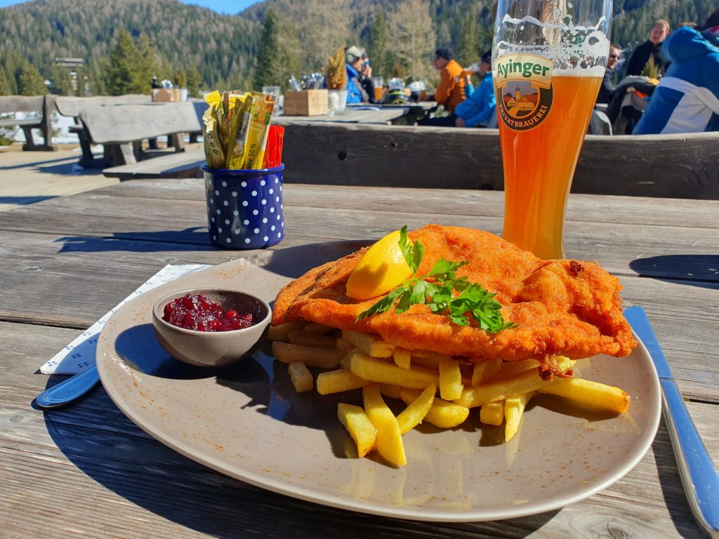 Mit geschulterten Skiern bin ich dann zum Auto zurückgegangen, habe die Ausrüstung darin verstaut, mich umgezogen und bin auf der Sonnenterrasse der Ludlalm eingekehrt. Mit einem knusprigen Schnitzel, Pommes und dazu einem bayrischen Weizenbier habe ich mir die verbrannte Energie wieder zurückgeholt. Der Heinrich darf wie gewohnt natürlich virtuell mitnaschen.