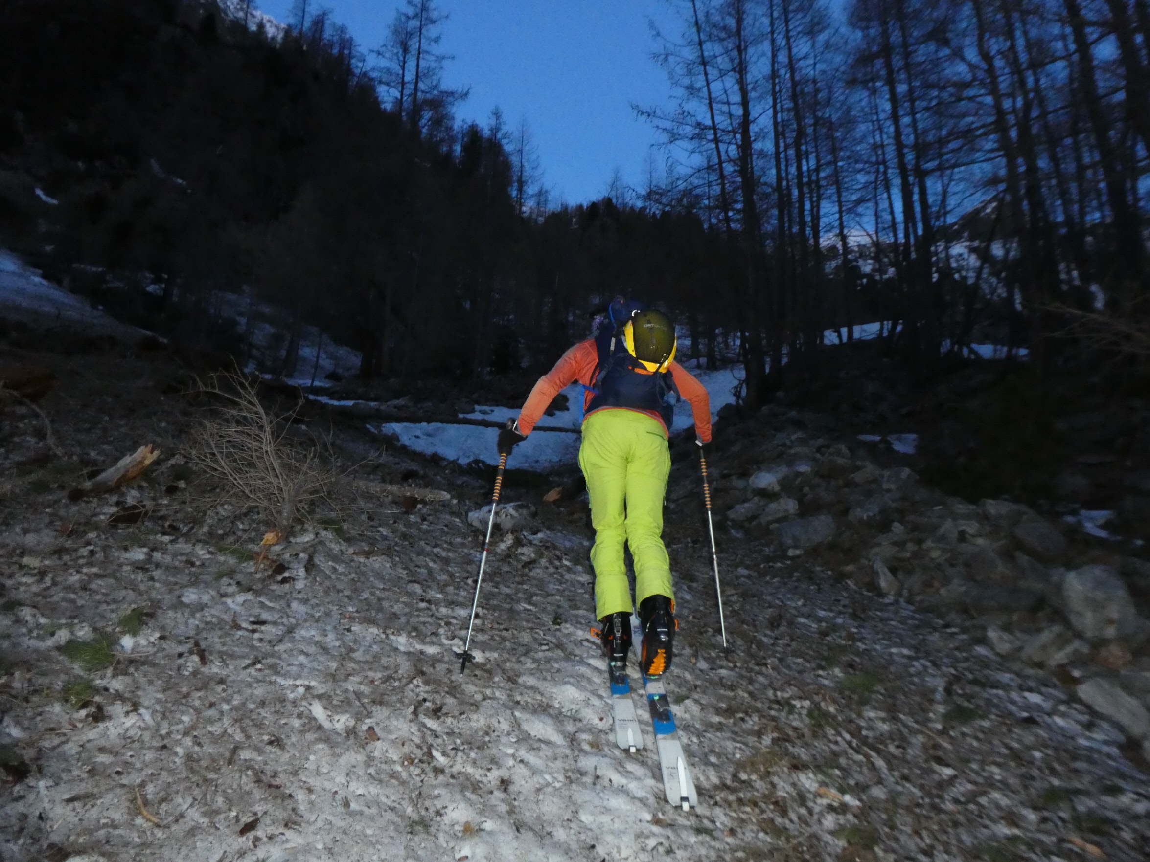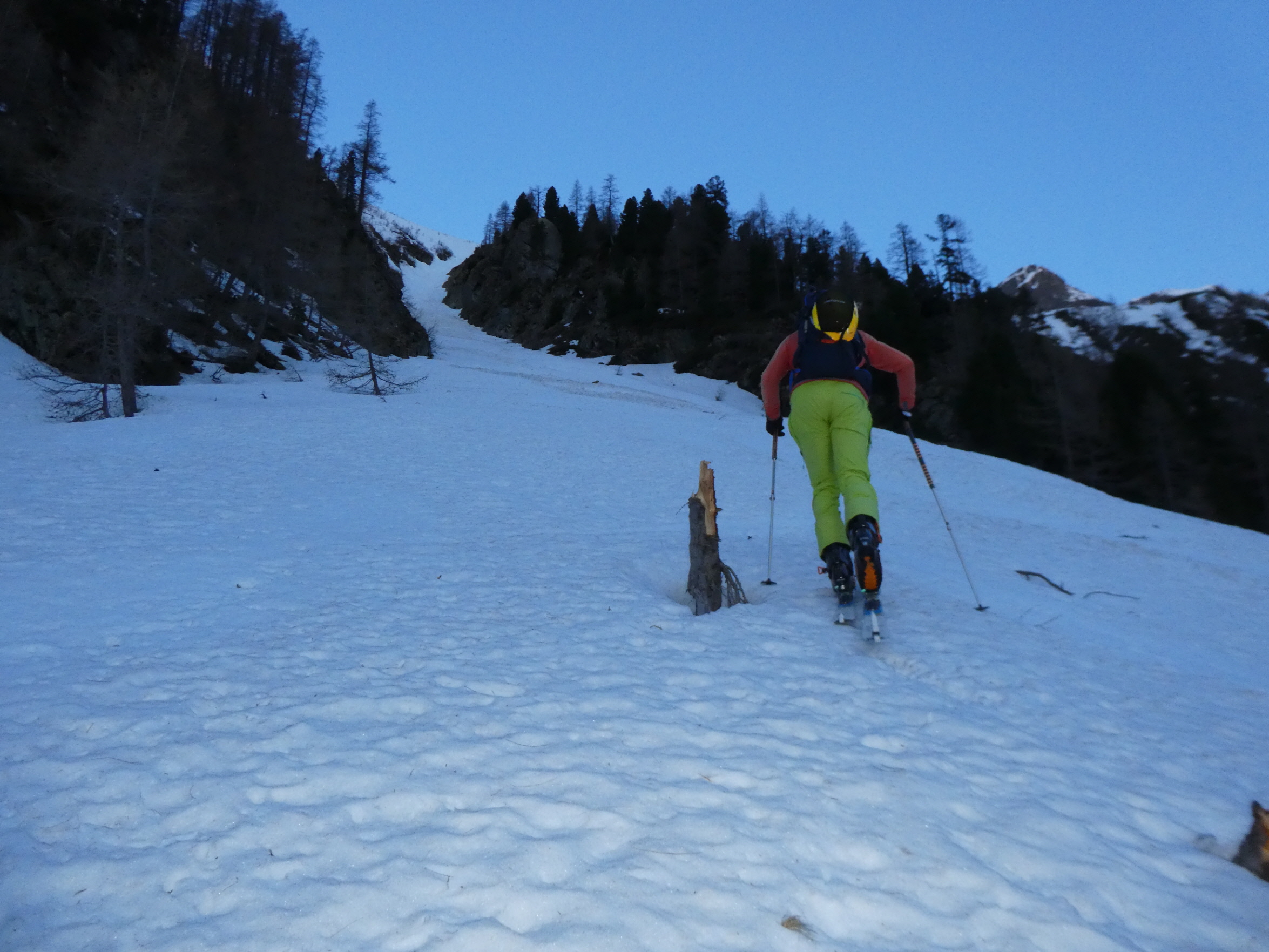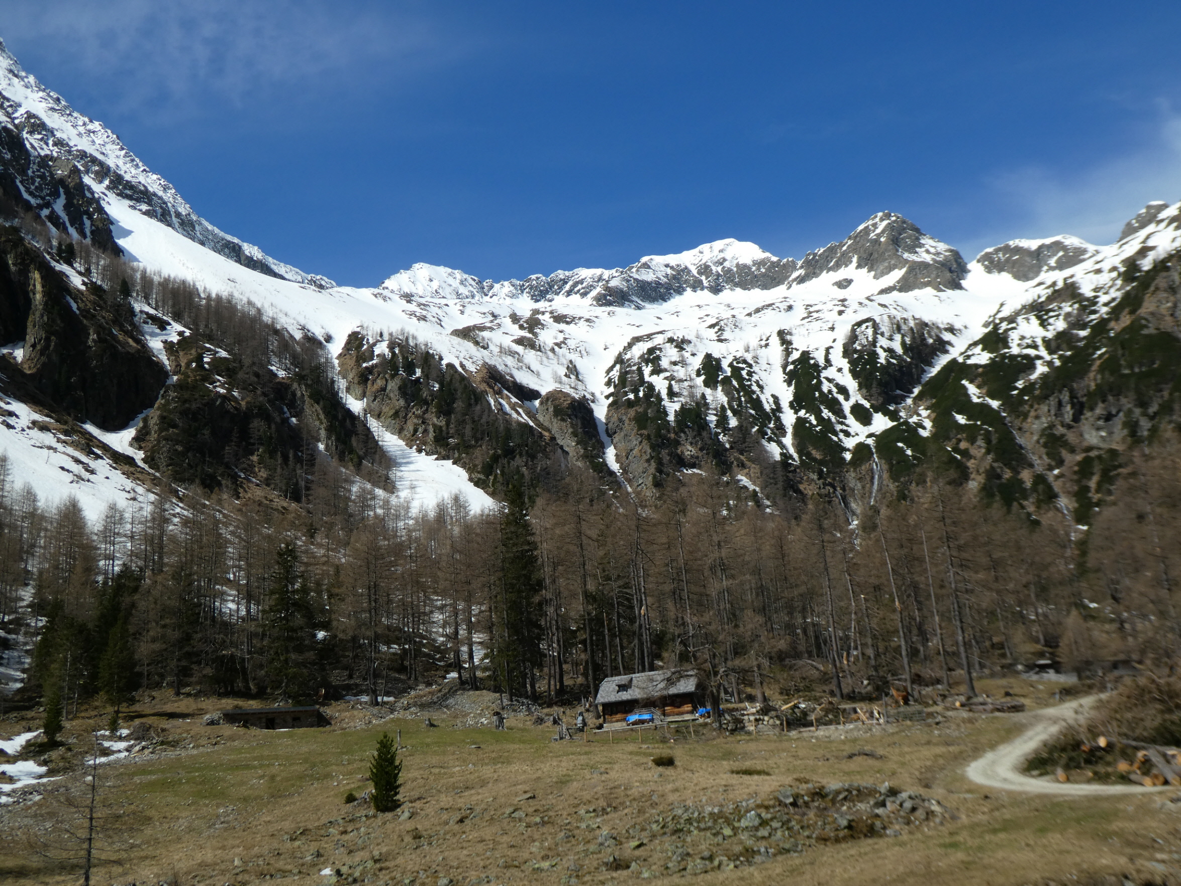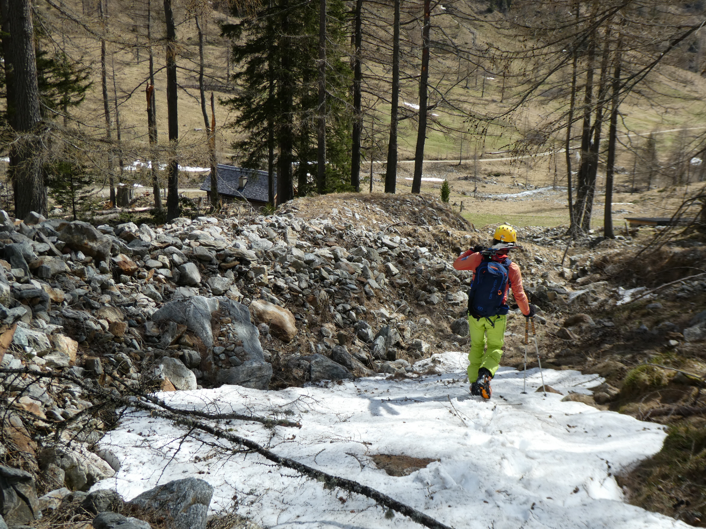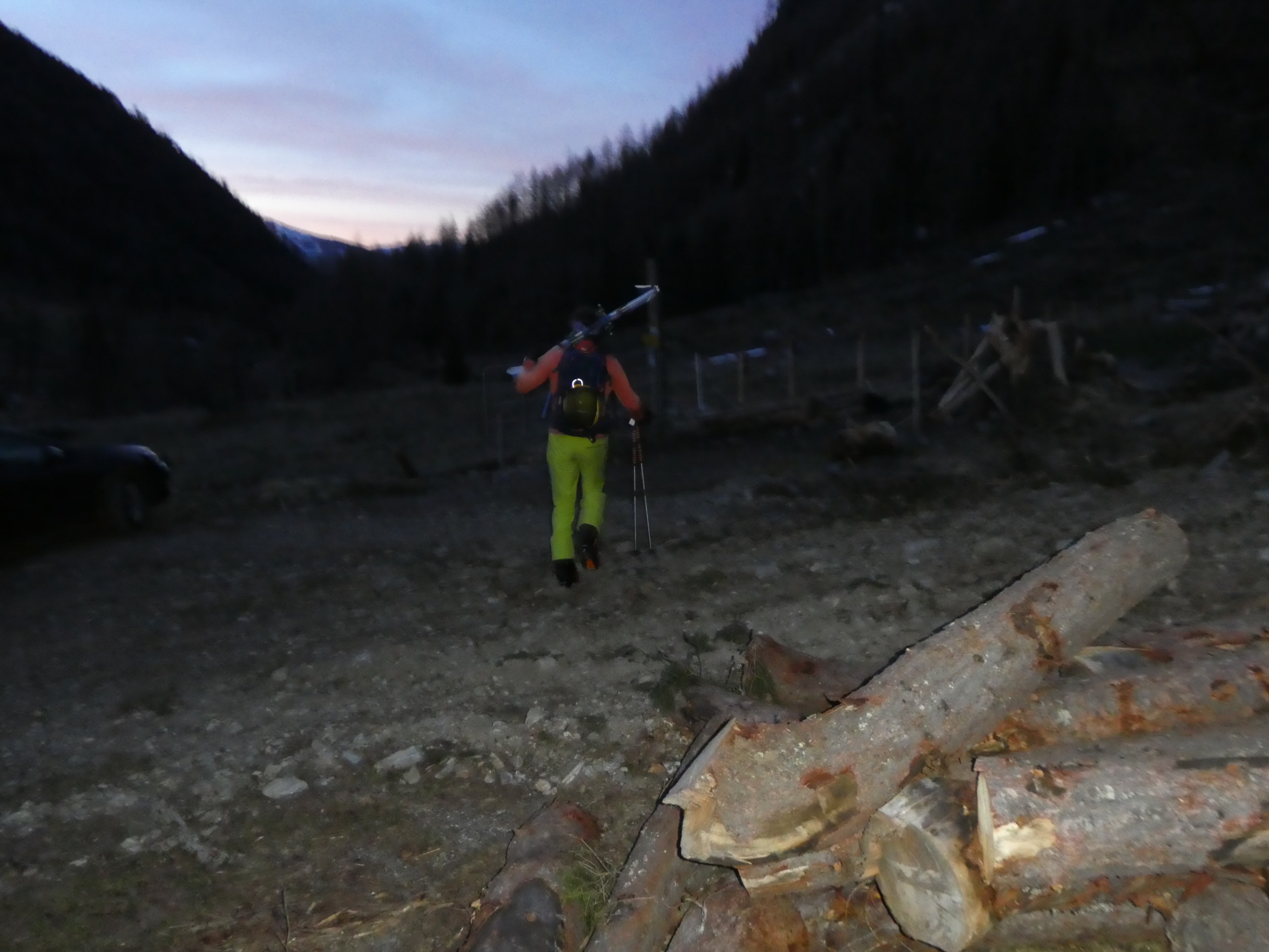 Im Frühjahr werden die Tage länger und die Nächte kürzer. Wenn die Nachttemperatur am Ausgangspunkt der Tour nicht unter 5 Gard abfällt, dann braucht es schon eine sternenklare Nacht, damit sich die Schneedecke abstrahlungsbedingt verfestigen kann und einen sehr frühen Tourenstart. Die Nacht vor der Tour wird daher noch einmal kürzer. Bereits bei Tageanbruch sind wir mit geschulterten Skiern bei der Moarhütte am Ende des Prebertals gestartet.