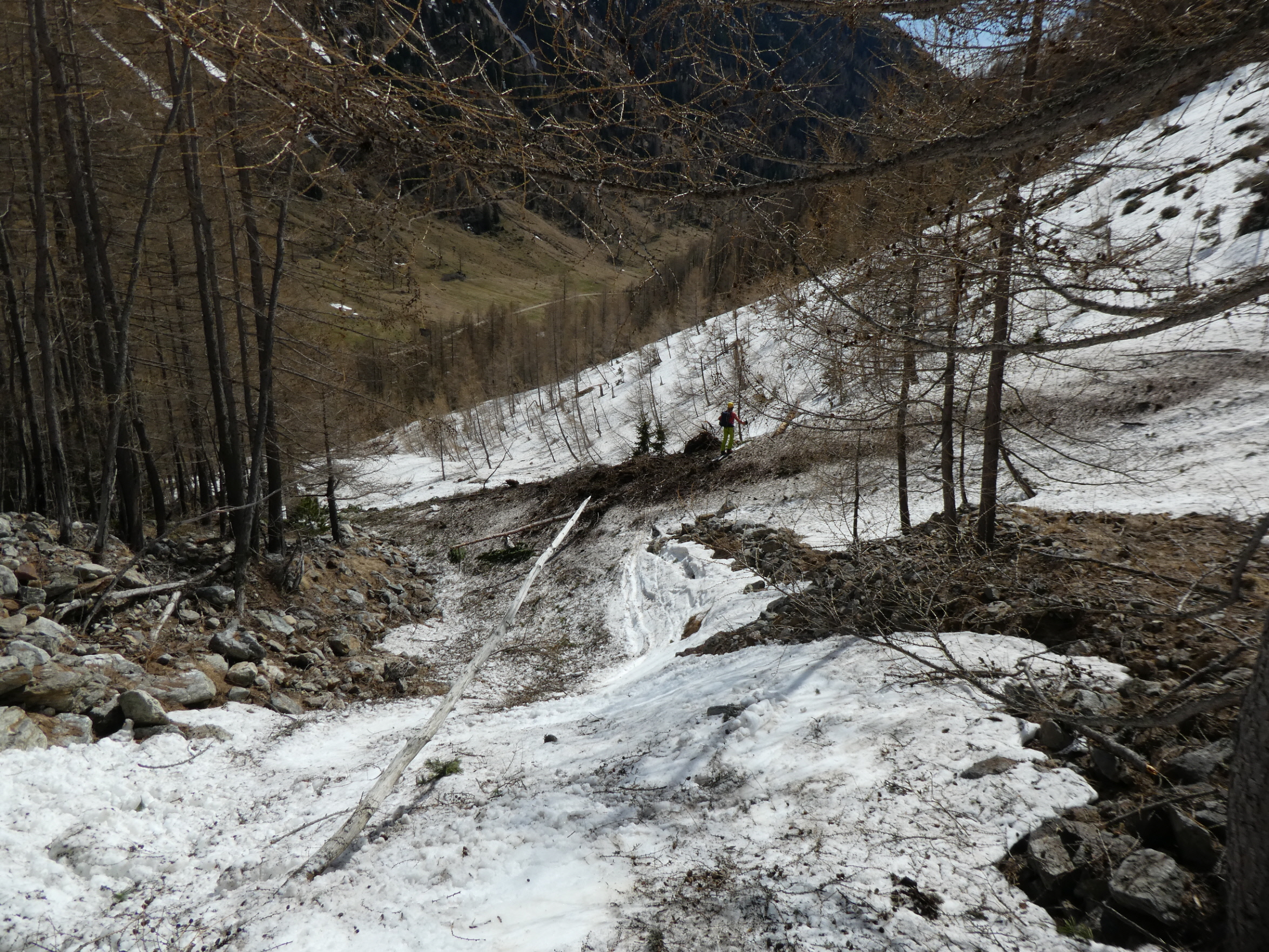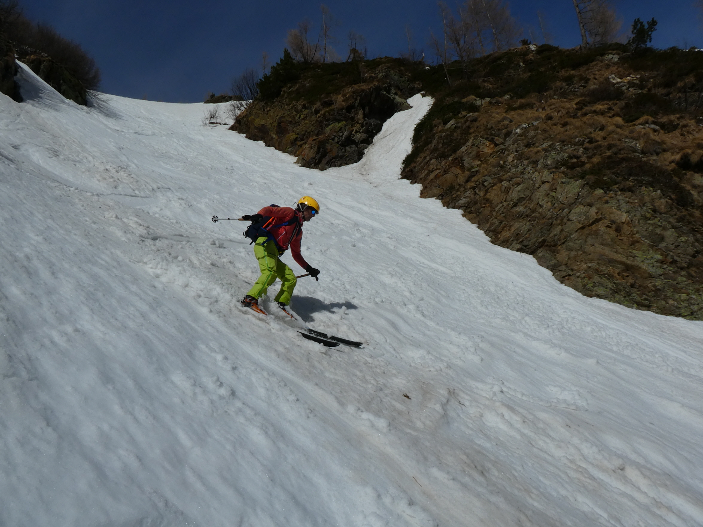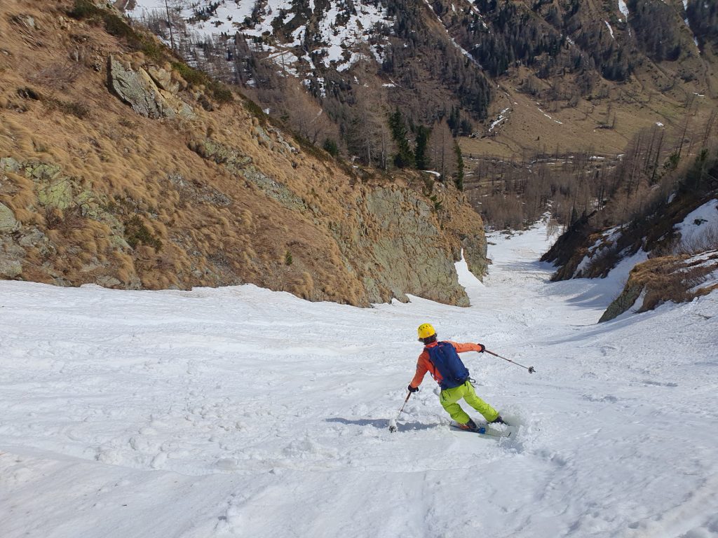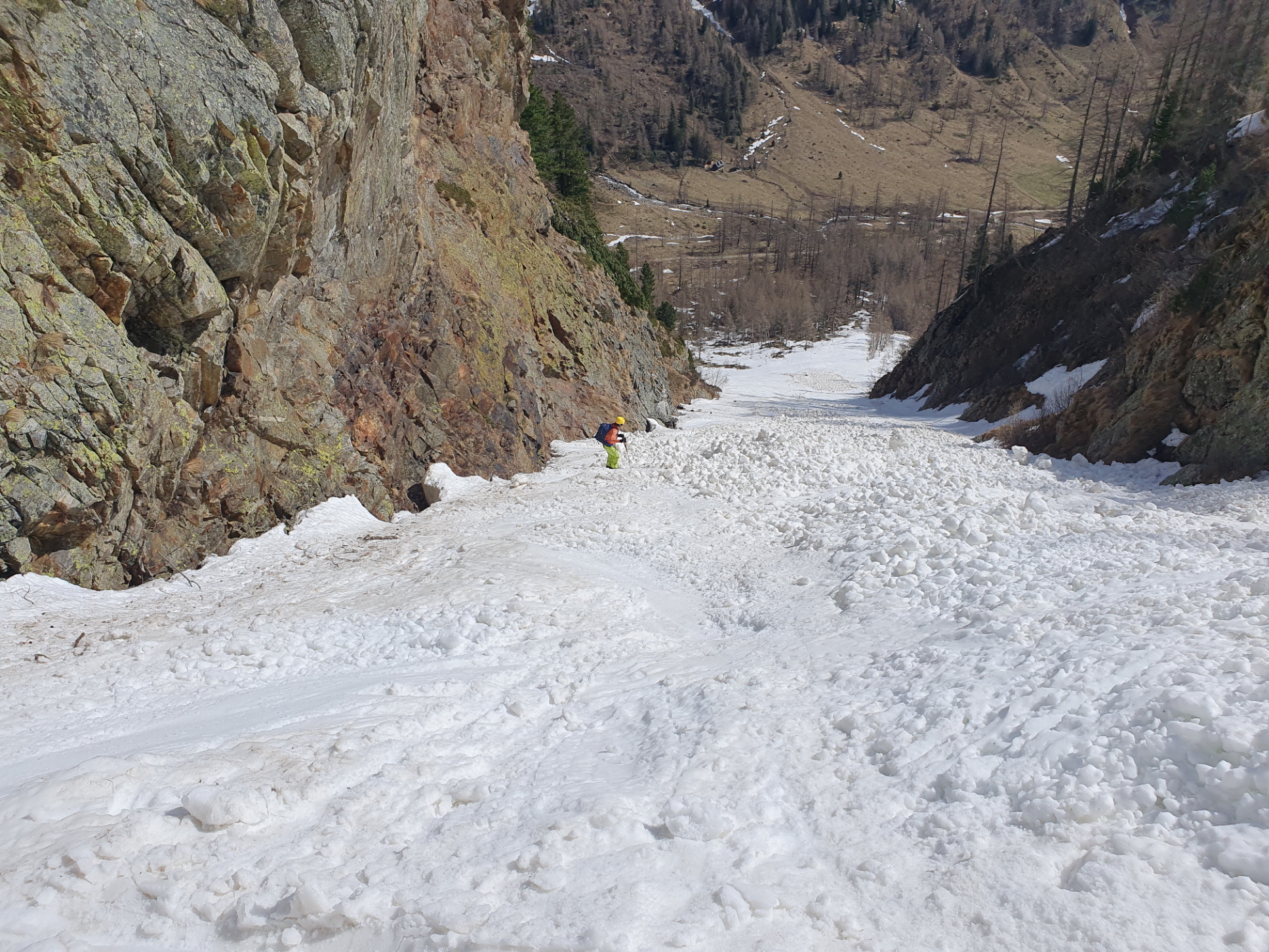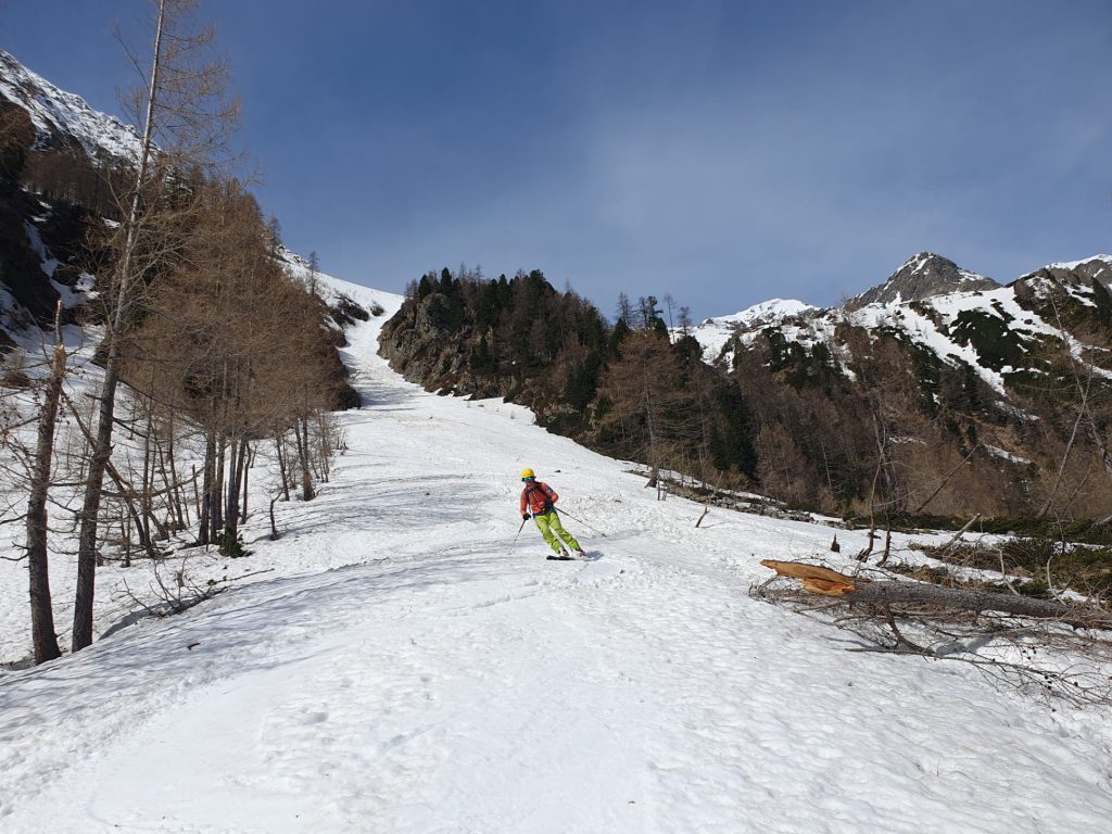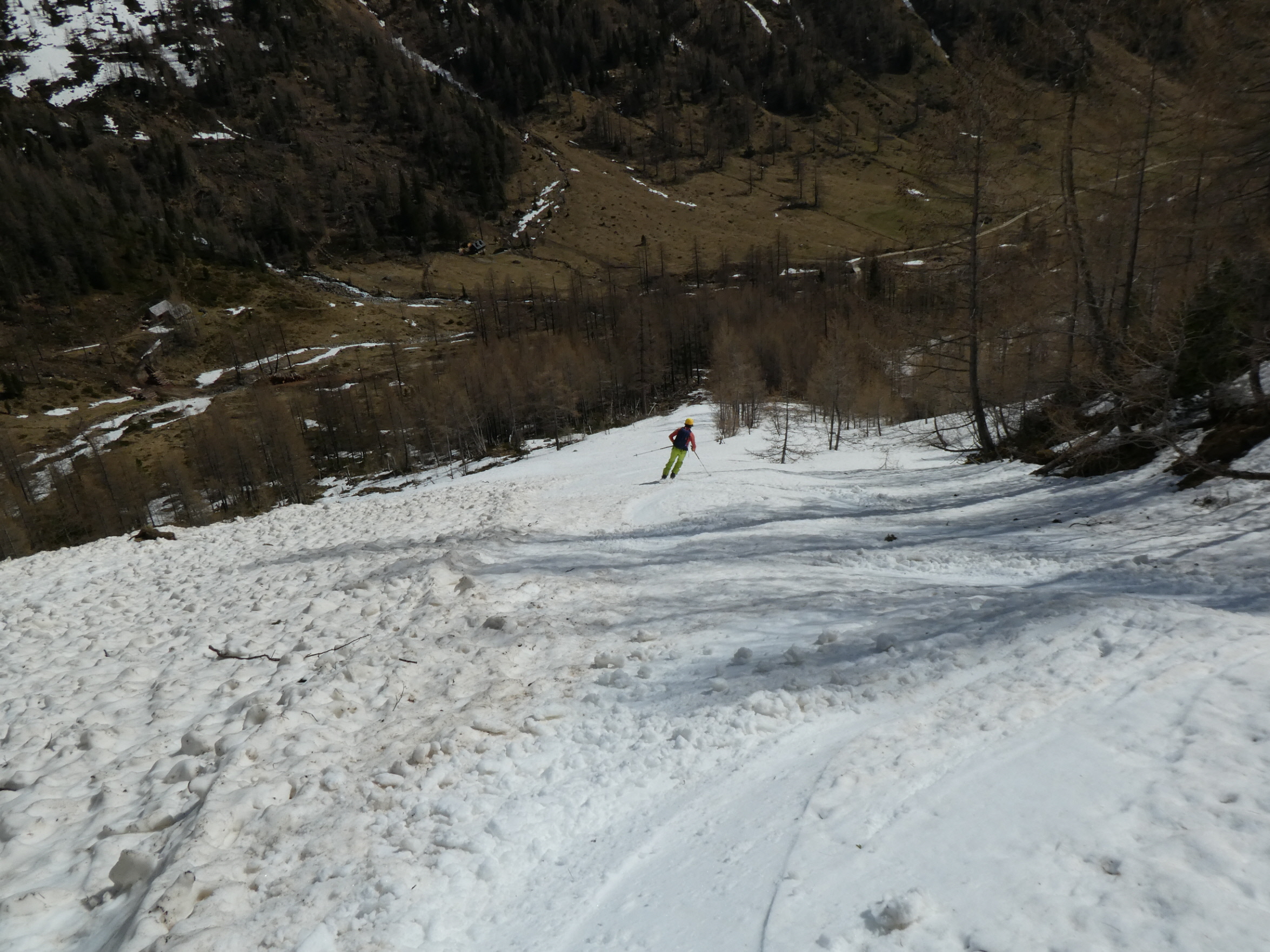 Im Mittelteil der Rinne sind wir den großen Knollen am Lawinenkegel mit einigen sehr kurzen Richtungsänderungen am äußersten linken Rand des Schneebandes ausgewichen. Danach war dann aber wieder genug Platz für Schwünge im tiefen Firnschnee. Über die enge Rinne ging es dann entlang unseres Aufstiegsweges nach rechts hinunter und nach dem Queren des stark verschmutzten Lawinenkegels noch bis 200 Meter oberhalb des bei der Moarhütte geparkten Autos.