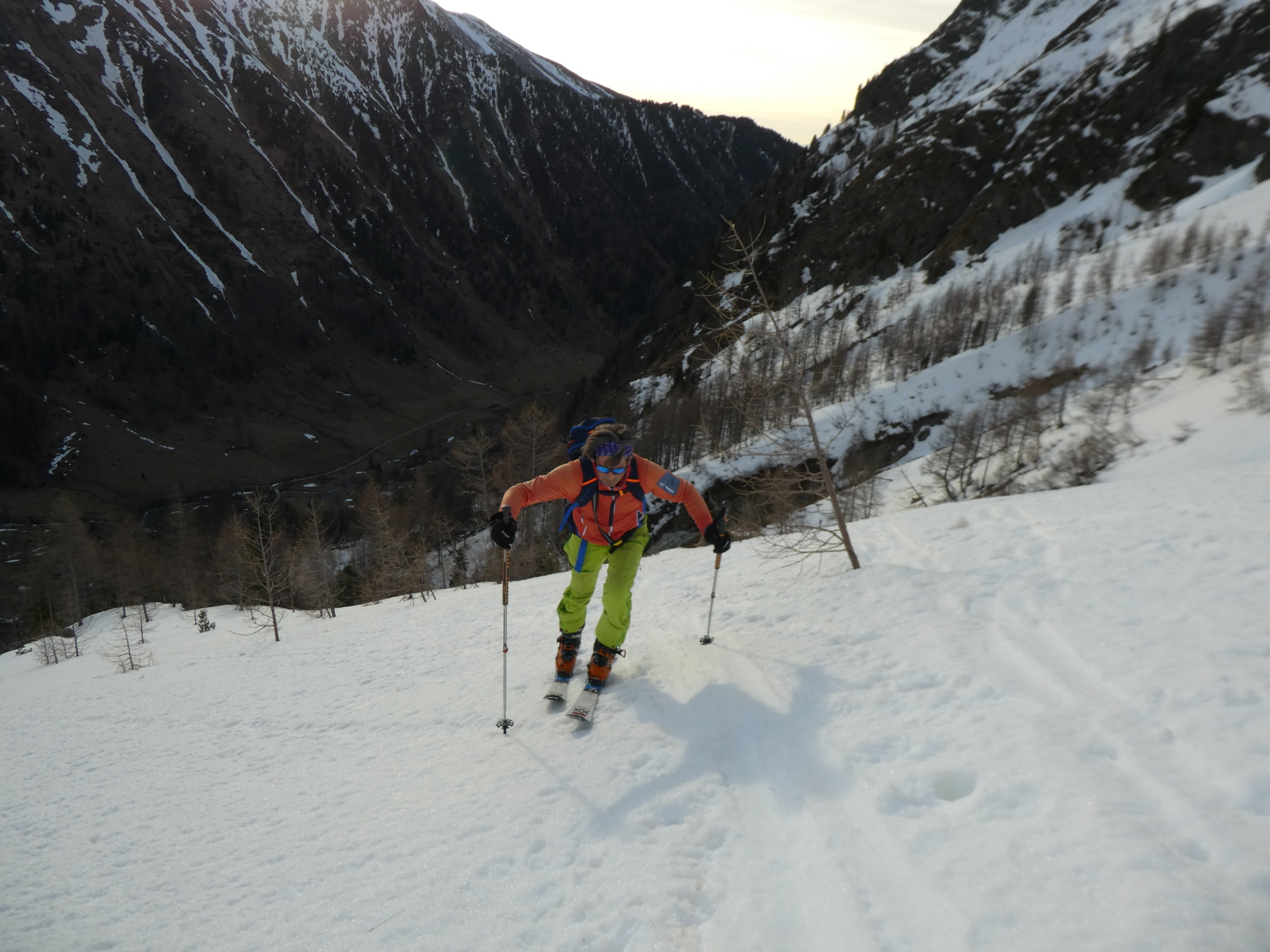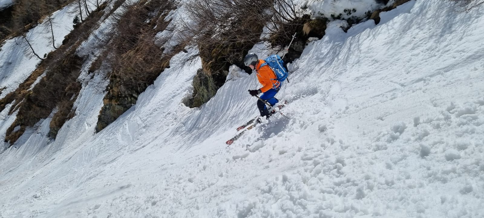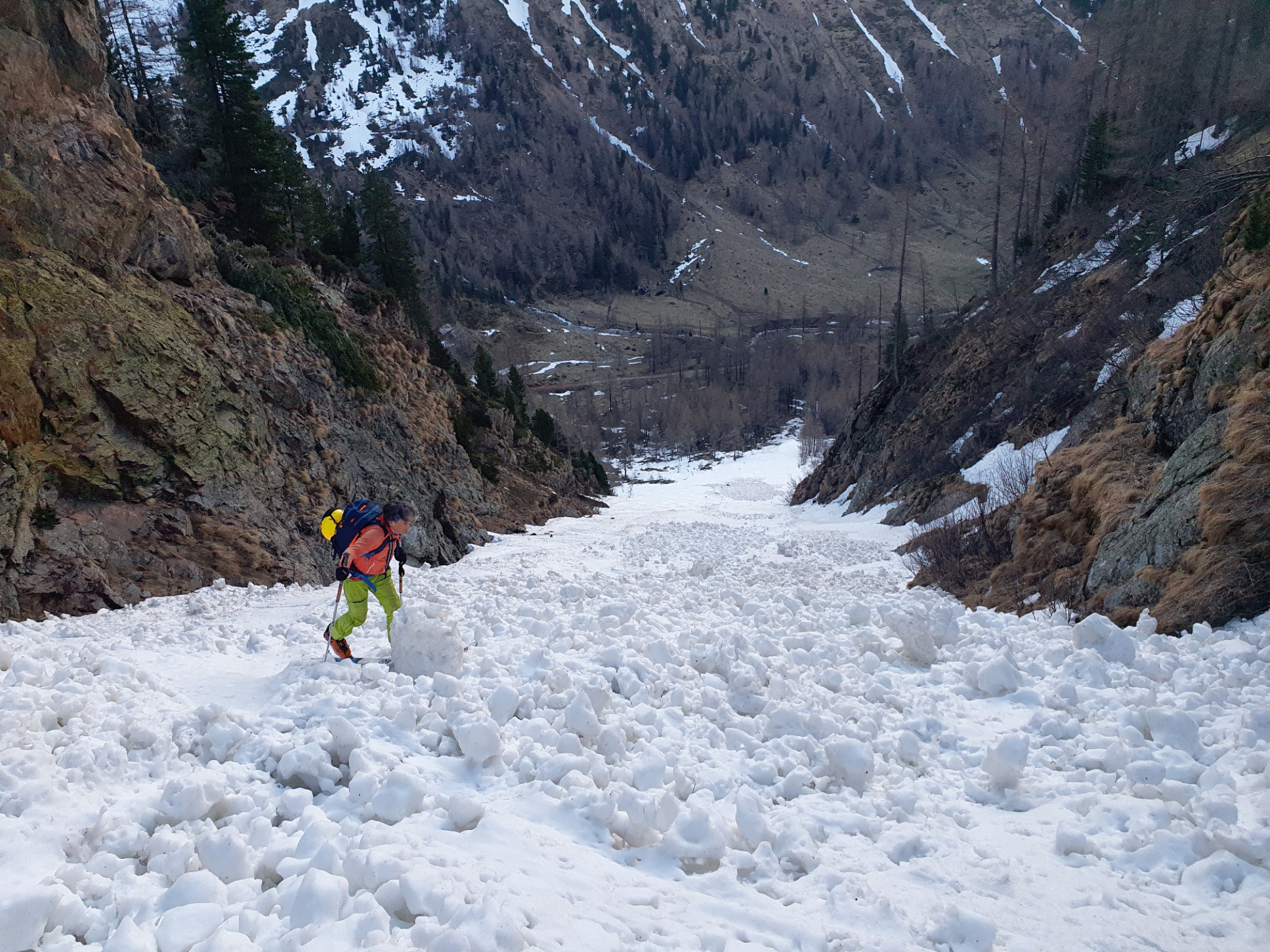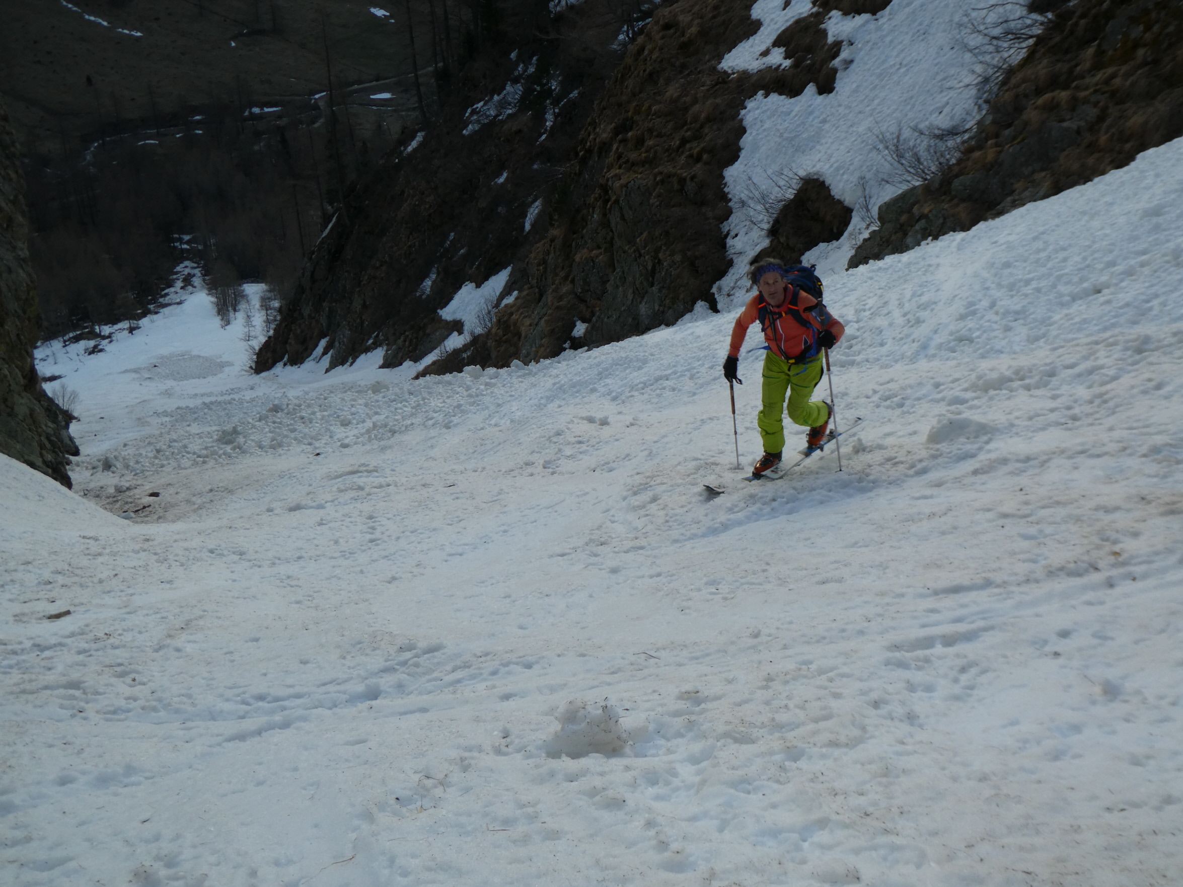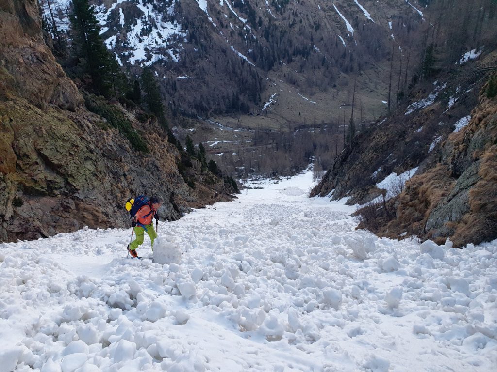 Im Mittelteil der Rinne sind wir den großen Knollen am Lawinenkegel mit einigen sehr kurzen Richtungsänderungen am äußersten linken Rand des Schneebandes ausgewichen. Danach war dann aber wieder genug Platz für Schwünge im tiefen Firnschnee. Über die enge Rinne ging es dann entlang unseres Aufstiegsweges nach rechts hinunter und nach dem Queren des stark verschmutzten Lawinenkegels noch bis 200 Meter oberhalb des bei der Moarhütte geparkten Autos.