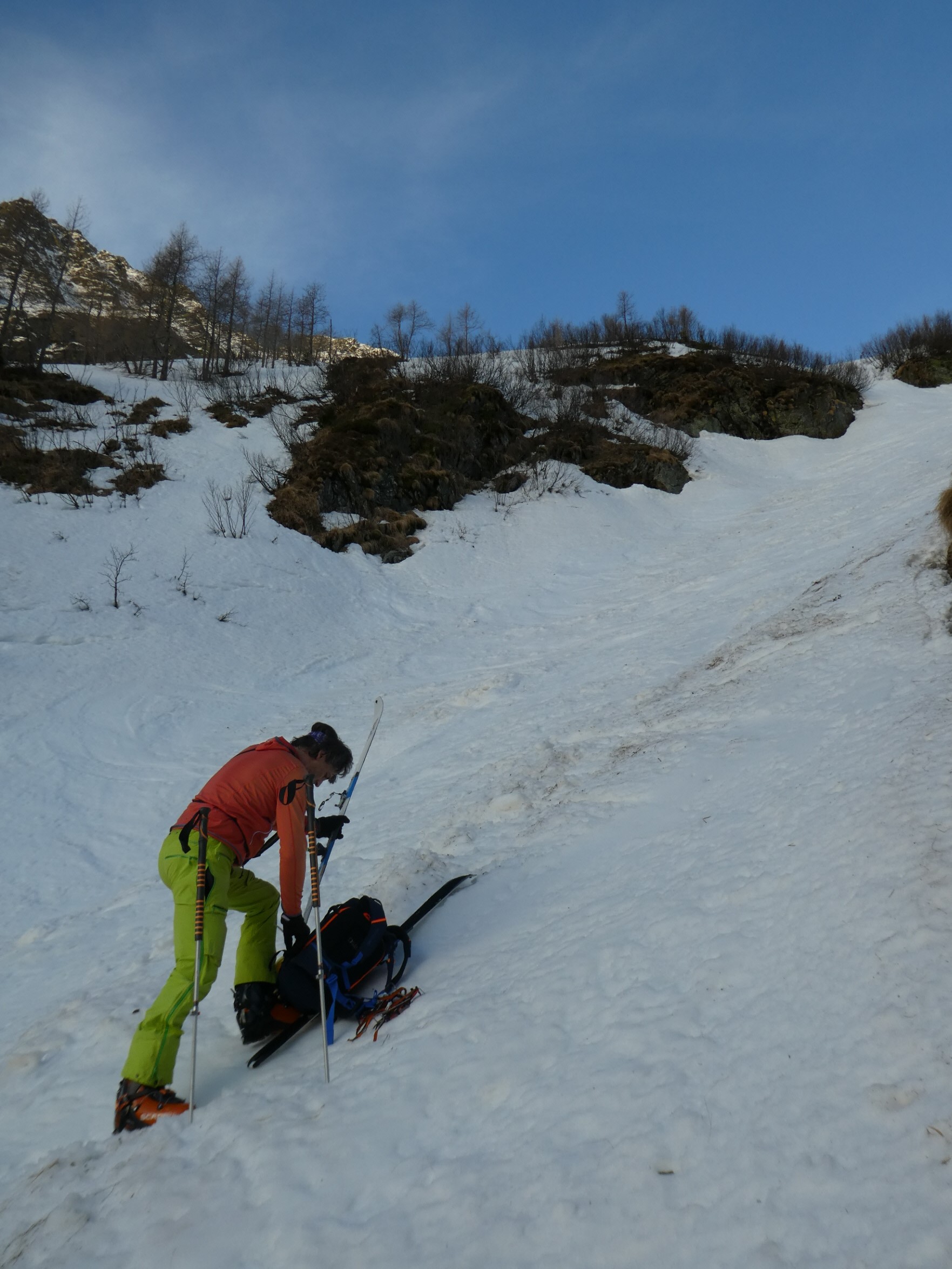 Dieses haben wir mit geschulterten Skiern, vorbei an unzähligen blühenden Krokussen, wenig später erreicht. Mit der Wechselkleidung im Gepäck sind wir aber gleich weiter zum Bach gegangen. Dort wurde nicht nur die Ausrüstung ordentlich gesäubert, sondern auch der Schweiß abgewaschen. Und weil es neben dem Bach auch noch einen Schneefleck gab, konnten wir uns, für den Fall, dass das Bachwasser zu nass war 😉, auch darauf noch abkühlen.