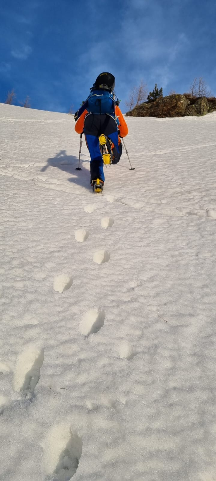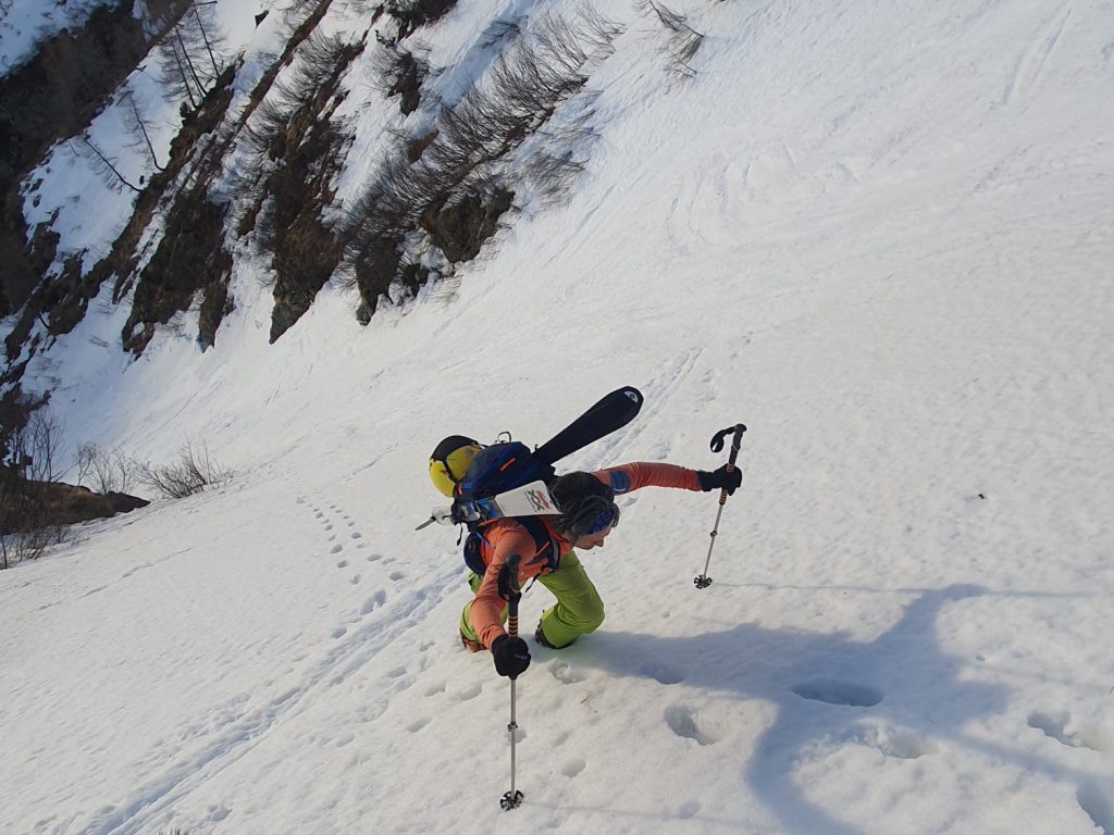 Mit zunehmender Steilheit stellt sich jedes Mal die Frage, ob man weiter mit vielen Spitzkehren über mehr als 40 Grad steiles Gelände hinaufzirkeln will – was wir auch schon gemacht haben – oder ob man abschnallt und die Skier aufpackt. Dafür haben wir uns diesmal wieder entschieden. Mit den Steigeisen an den Schuhen steht man dabei jedenfalls besser, als in einer glatten Abfahrtsspur vom Vortag, in der man geländebedingt seine Kehre ansetzen müsste.