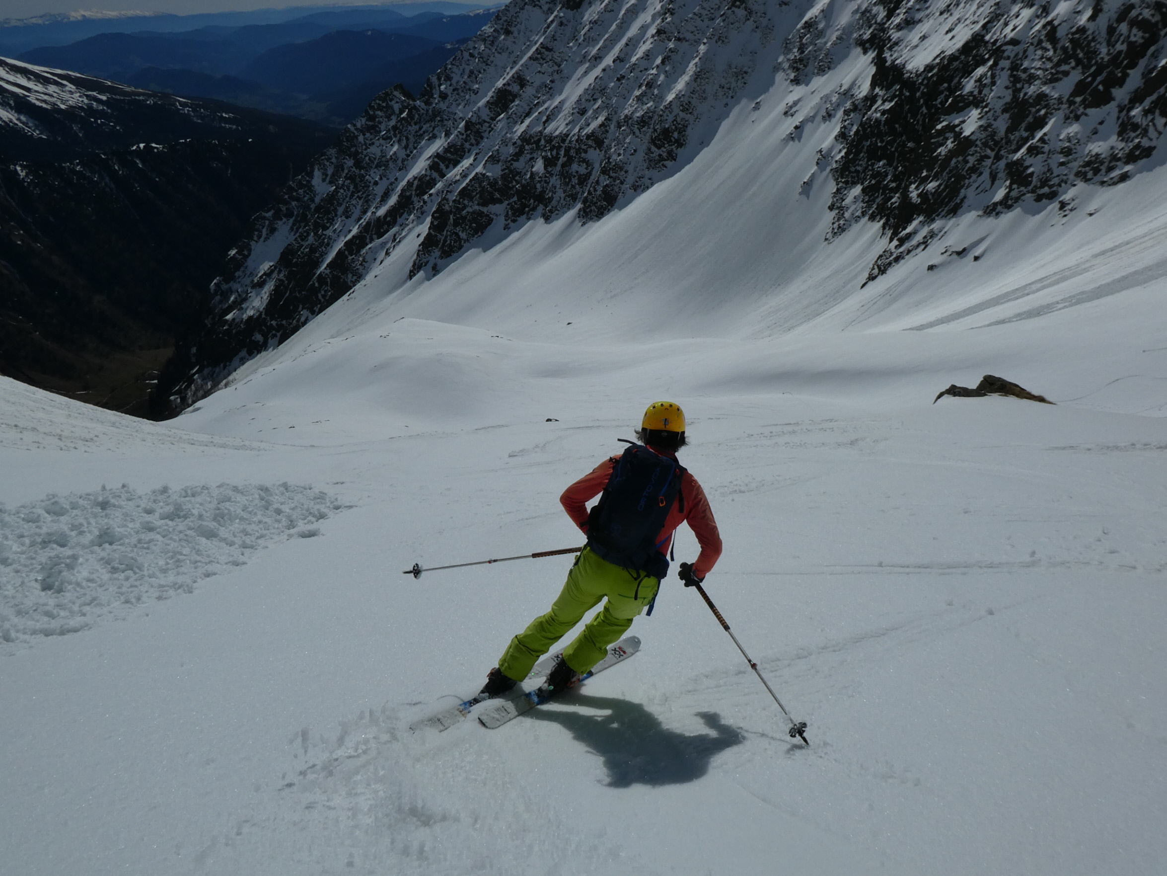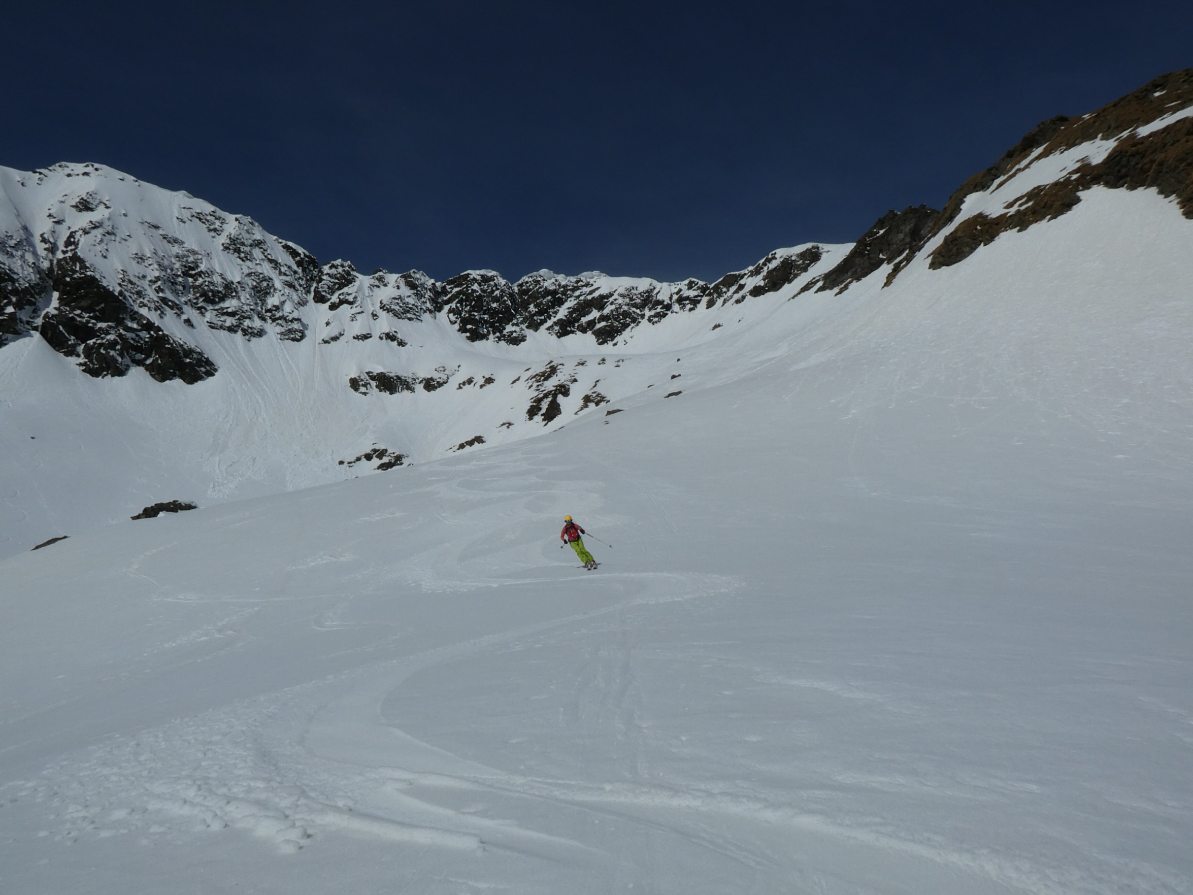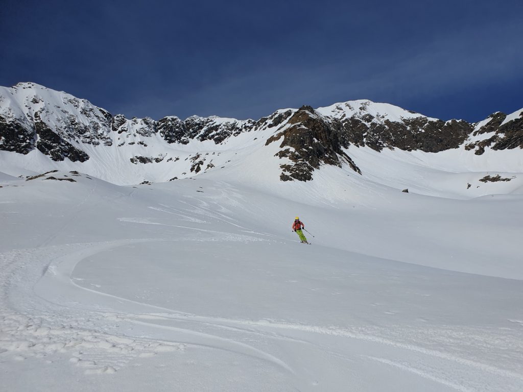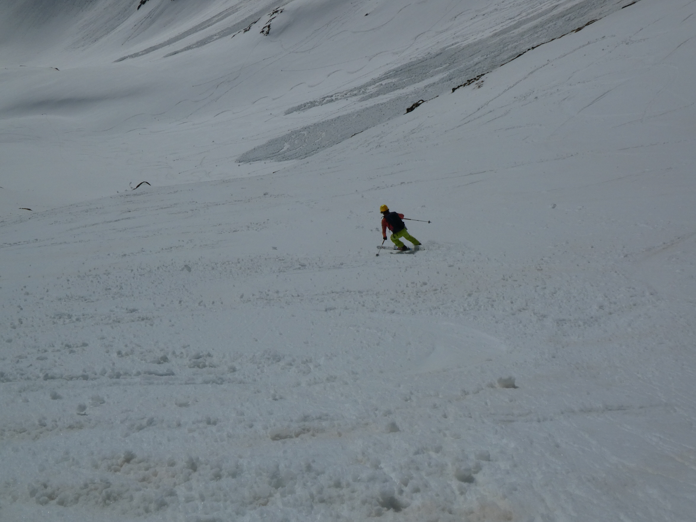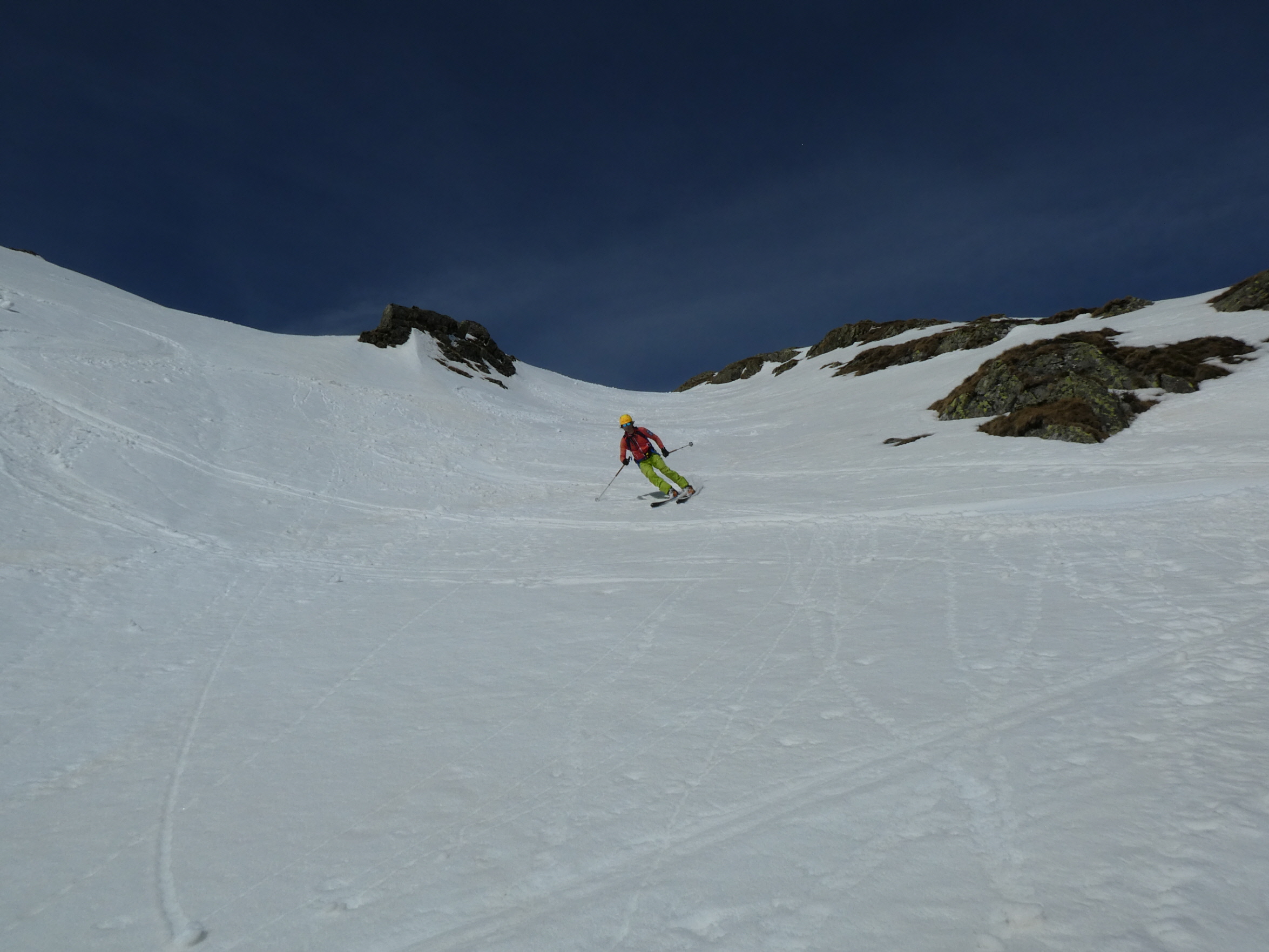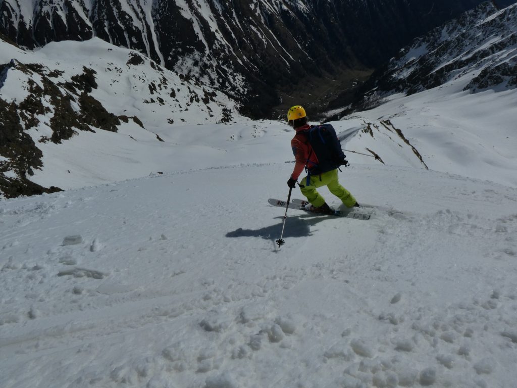 Mit abnehmender Steilheit hat das Abfahrtsvergügen schlagartig zugenommen. Der schmierige Firnschnee ist seitlich weggespritzt und jeder Schwung war ein Genuss. Das ist auch bei der weiteren Abfahrt aus dem Kar über die ersten weiten Flächen so geblieben. Mit zunehmender Steilheit in der Rinne war dann nicht zu vermeiden, dass der eine oder andere Schwung zum Balanceakt mutiert ist. Da habe ich mir dann schon ein paar Mal gewünscht, ich hätte bei der Skiwahl vor der Tour doch ein breiteres Modell eingepackt.