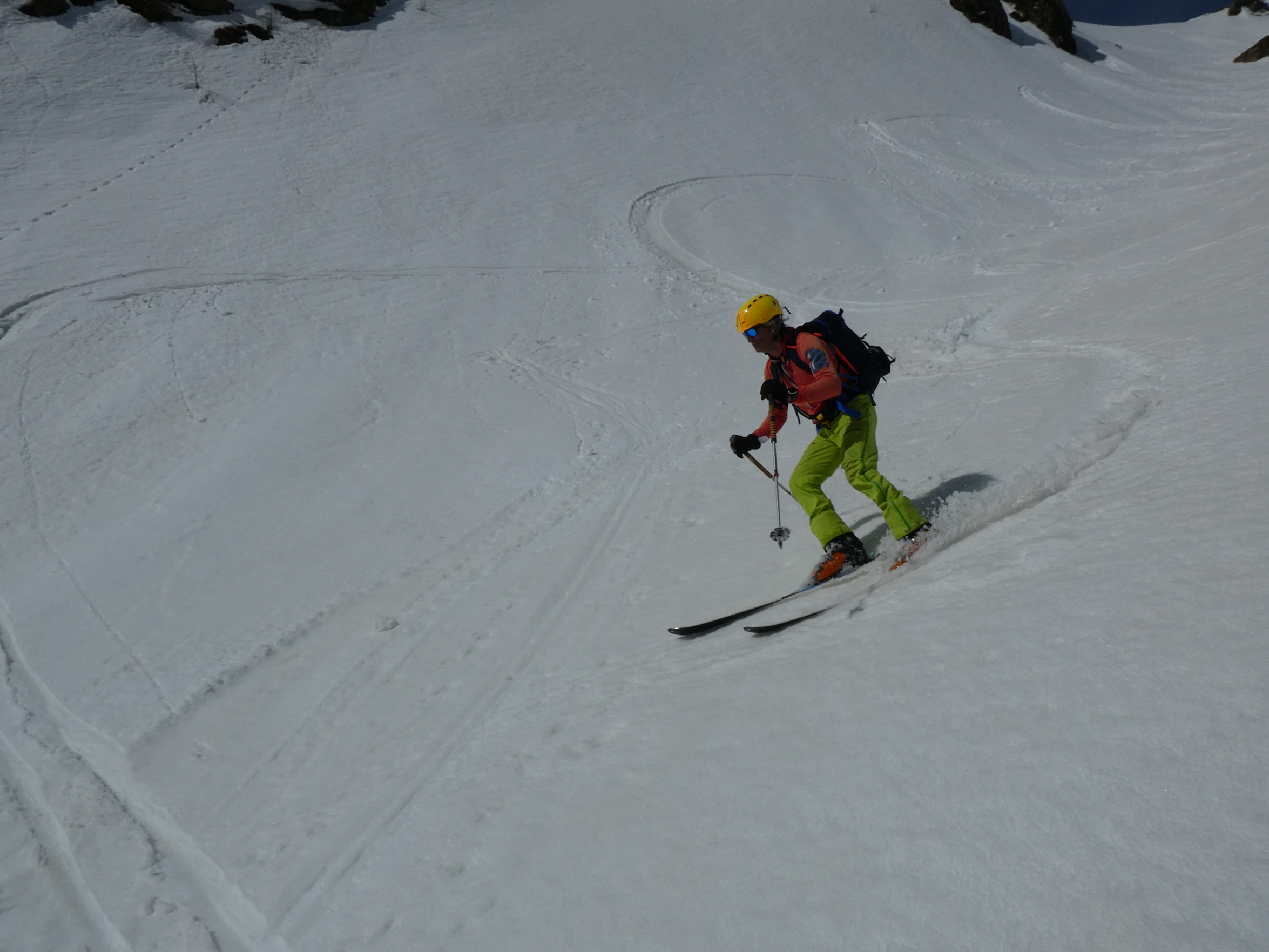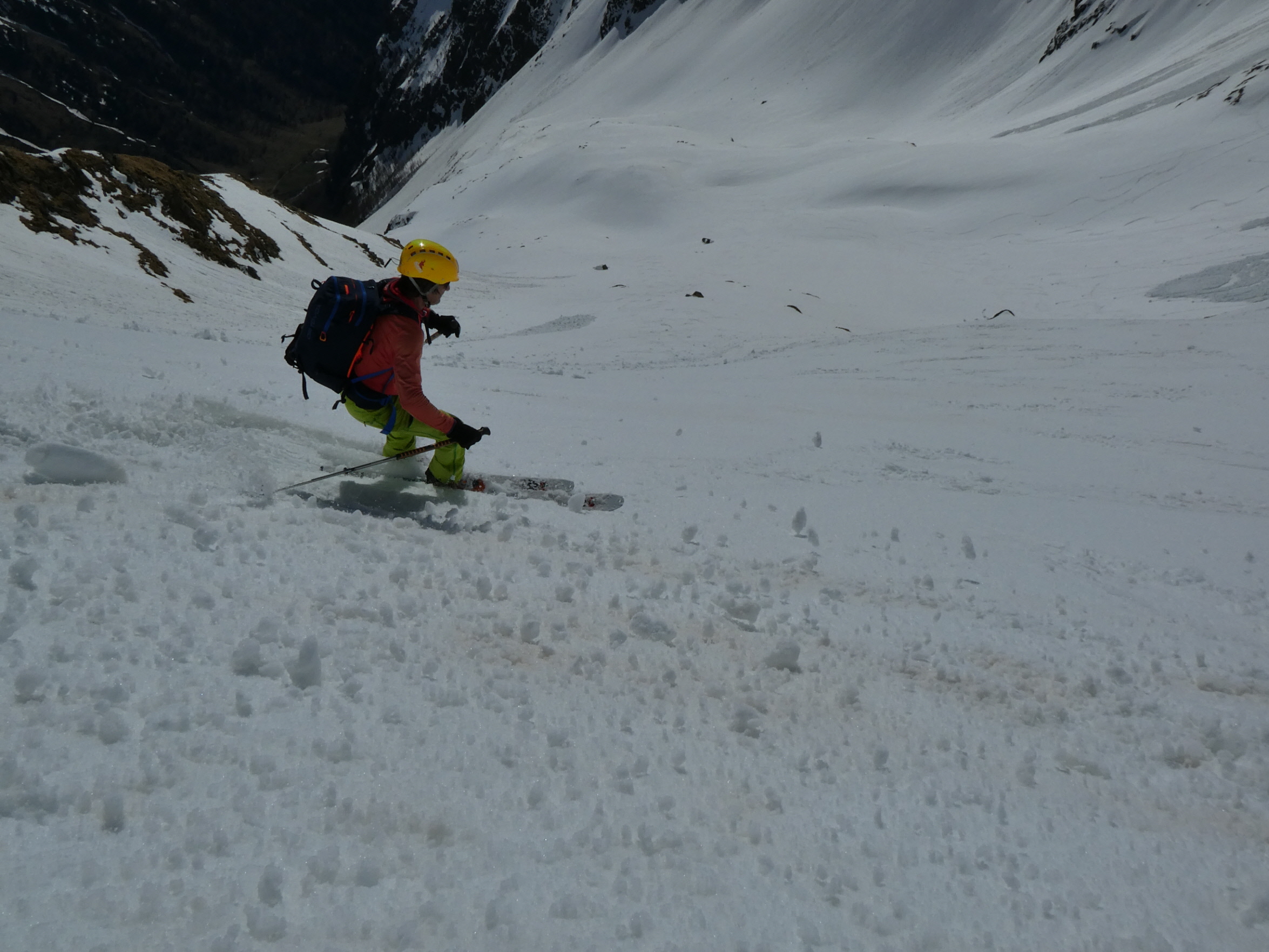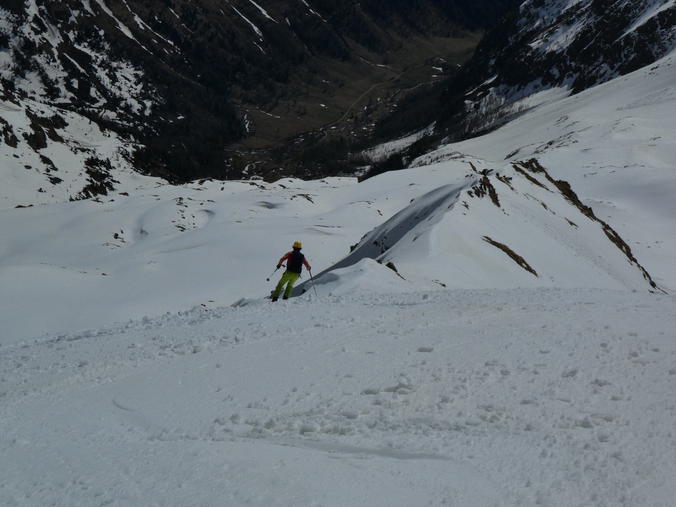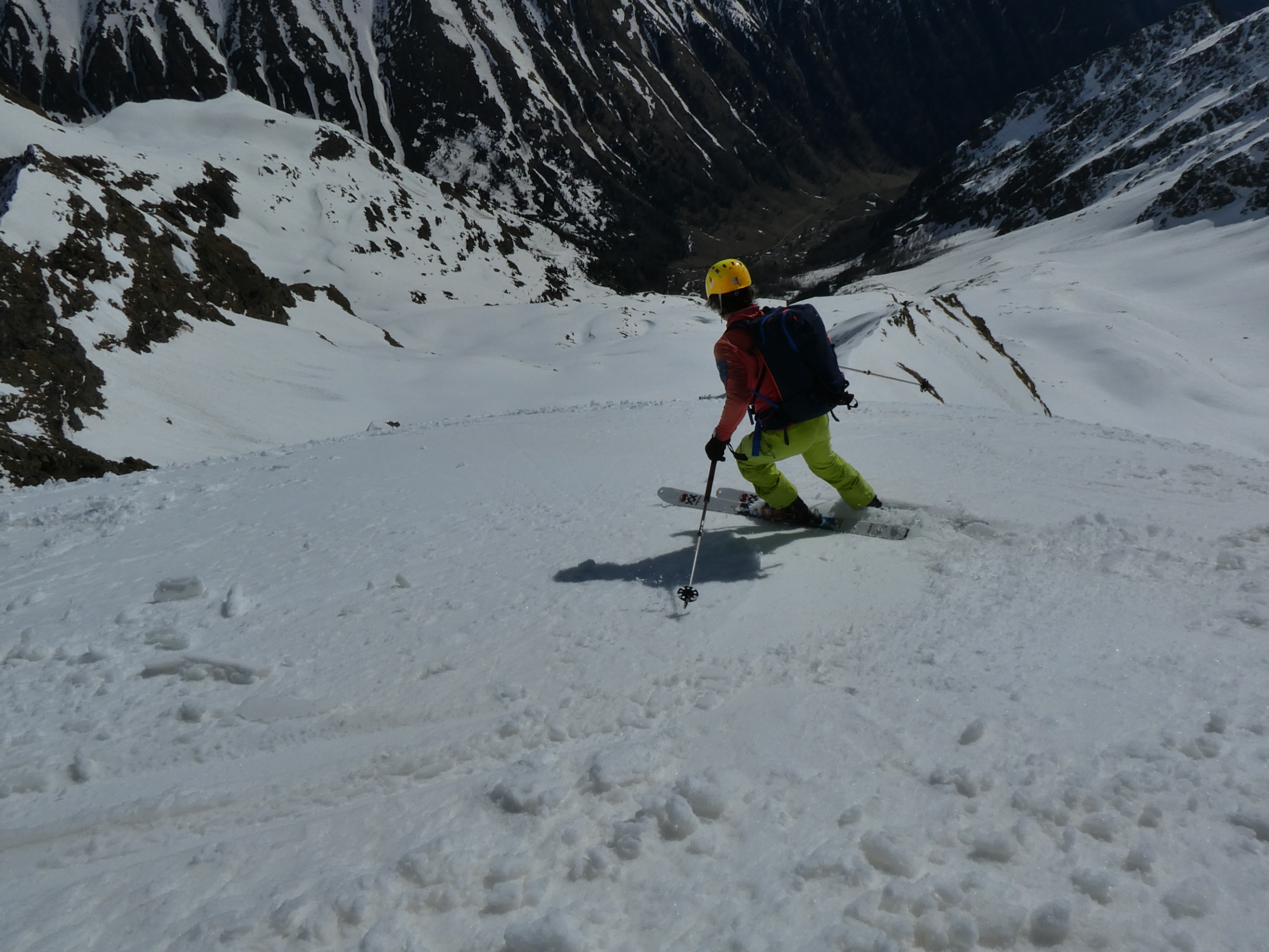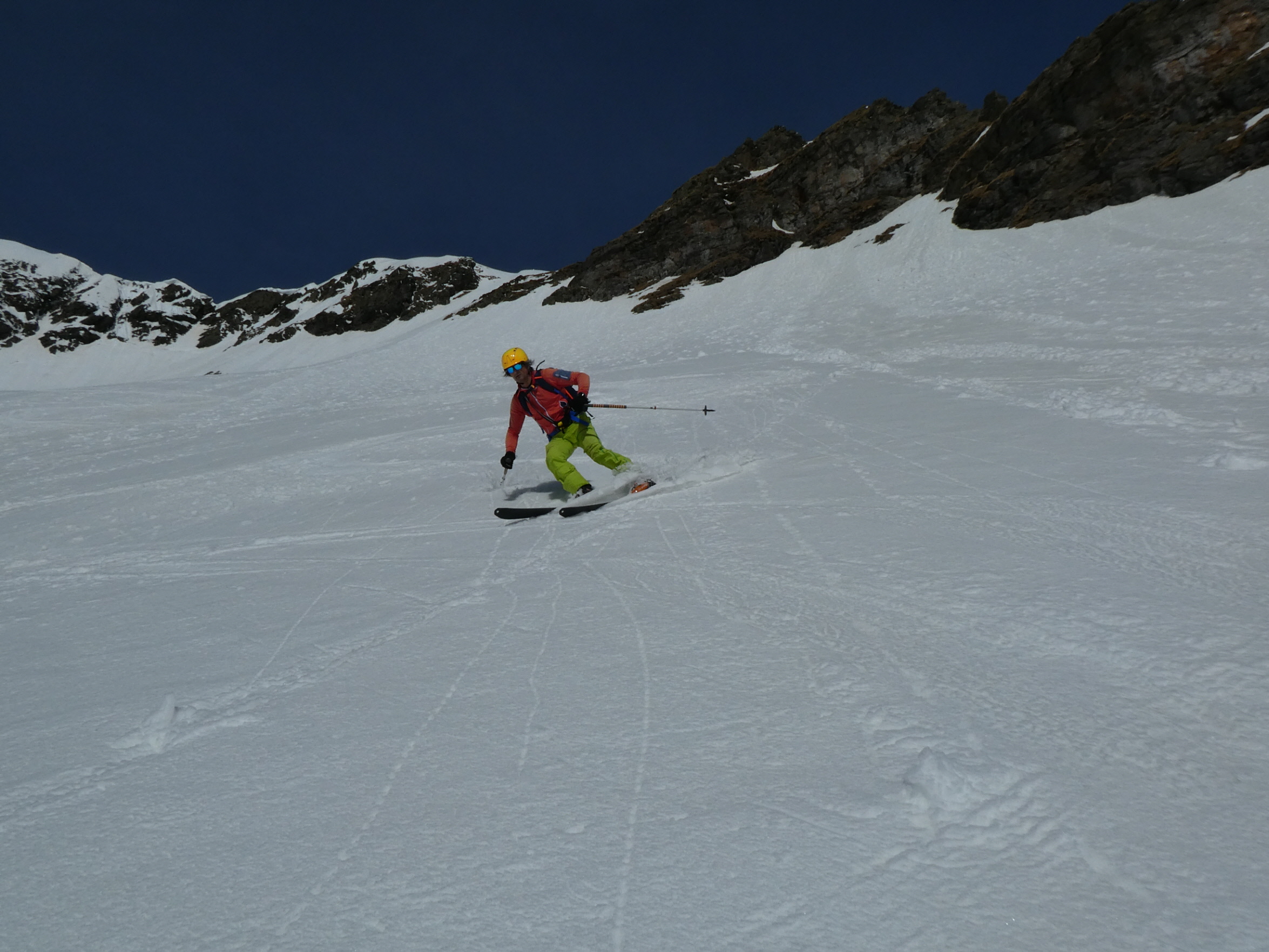 Mit abnehmender Steilheit hat das Abfahrtsvergügen schlagartig zugenommen. Der schmierige Firnschnee ist seitlich weggespritzt und jeder Schwung war ein Genuss. Das ist auch bei der weiteren Abfahrt aus dem Kar über die ersten weiten Flächen so geblieben. Mit zunehmender Steilheit in der Rinne war dann nicht zu vermeiden, dass der eine oder andere Schwung zum Balanceakt mutiert ist. Da habe ich mir dann schon ein paar Mal gewünscht, ich hätte bei der Skiwahl vor der Tour doch ein breiteres Modell eingepackt.