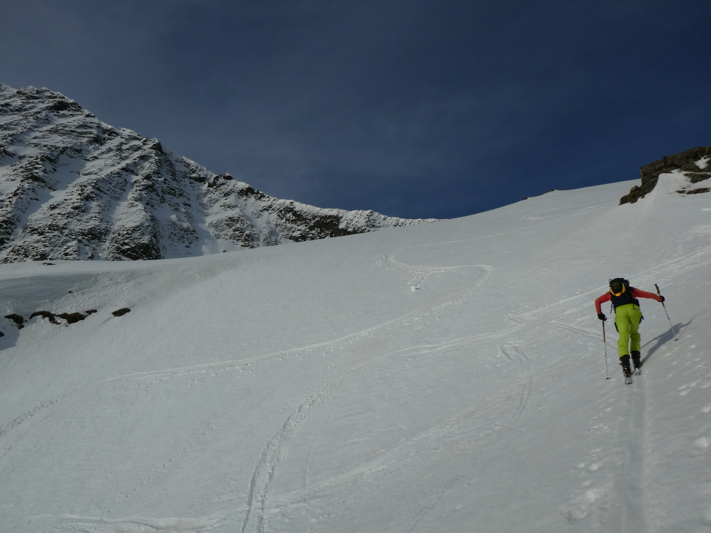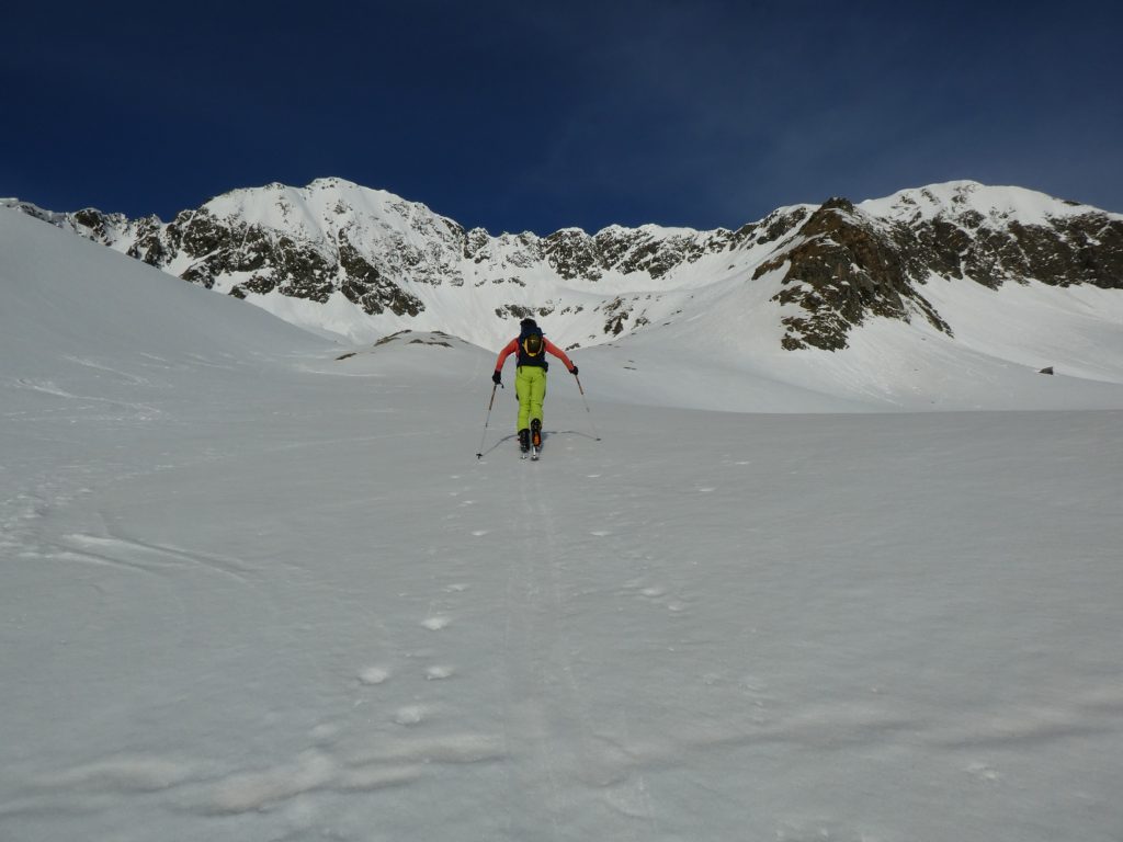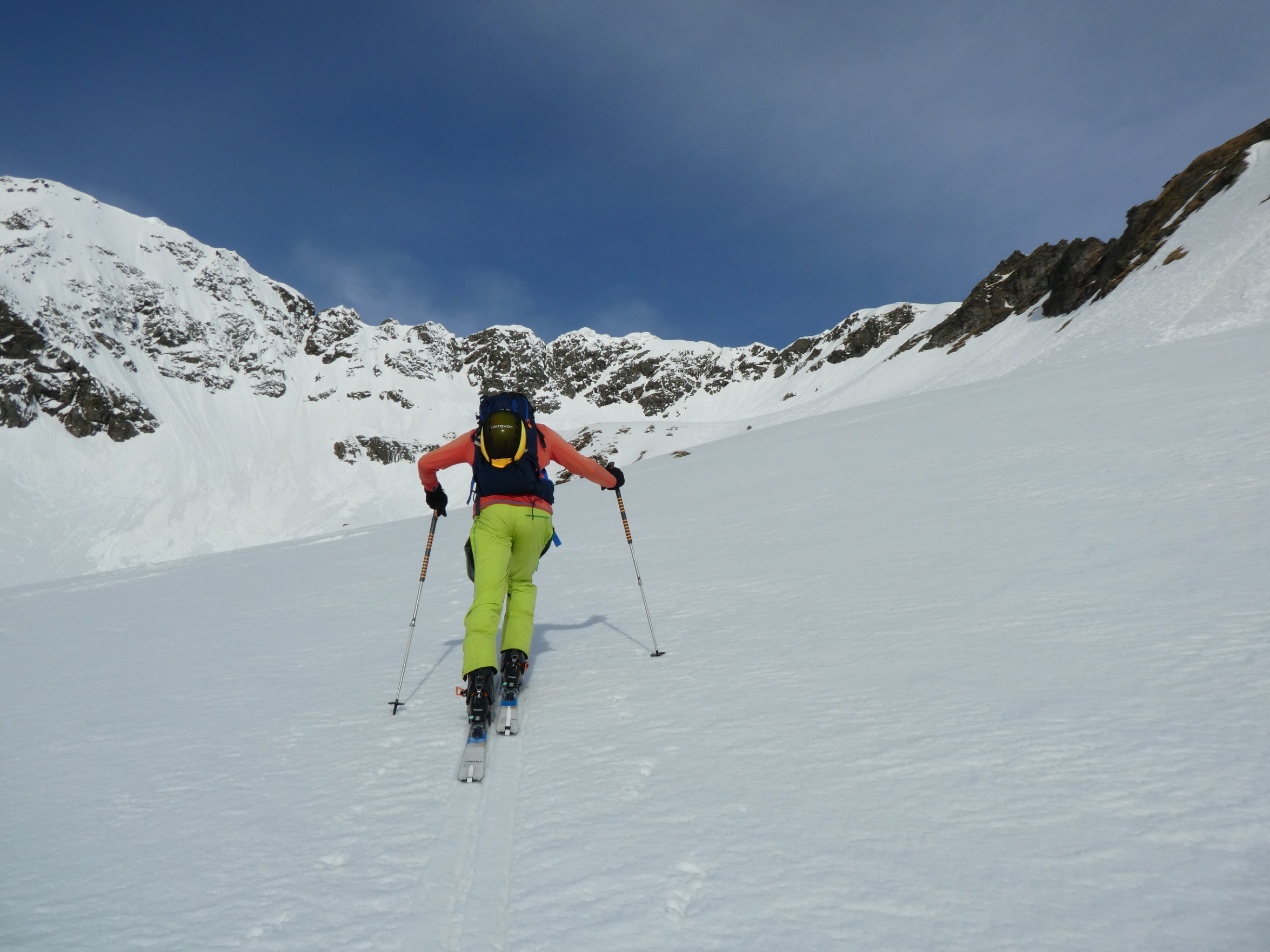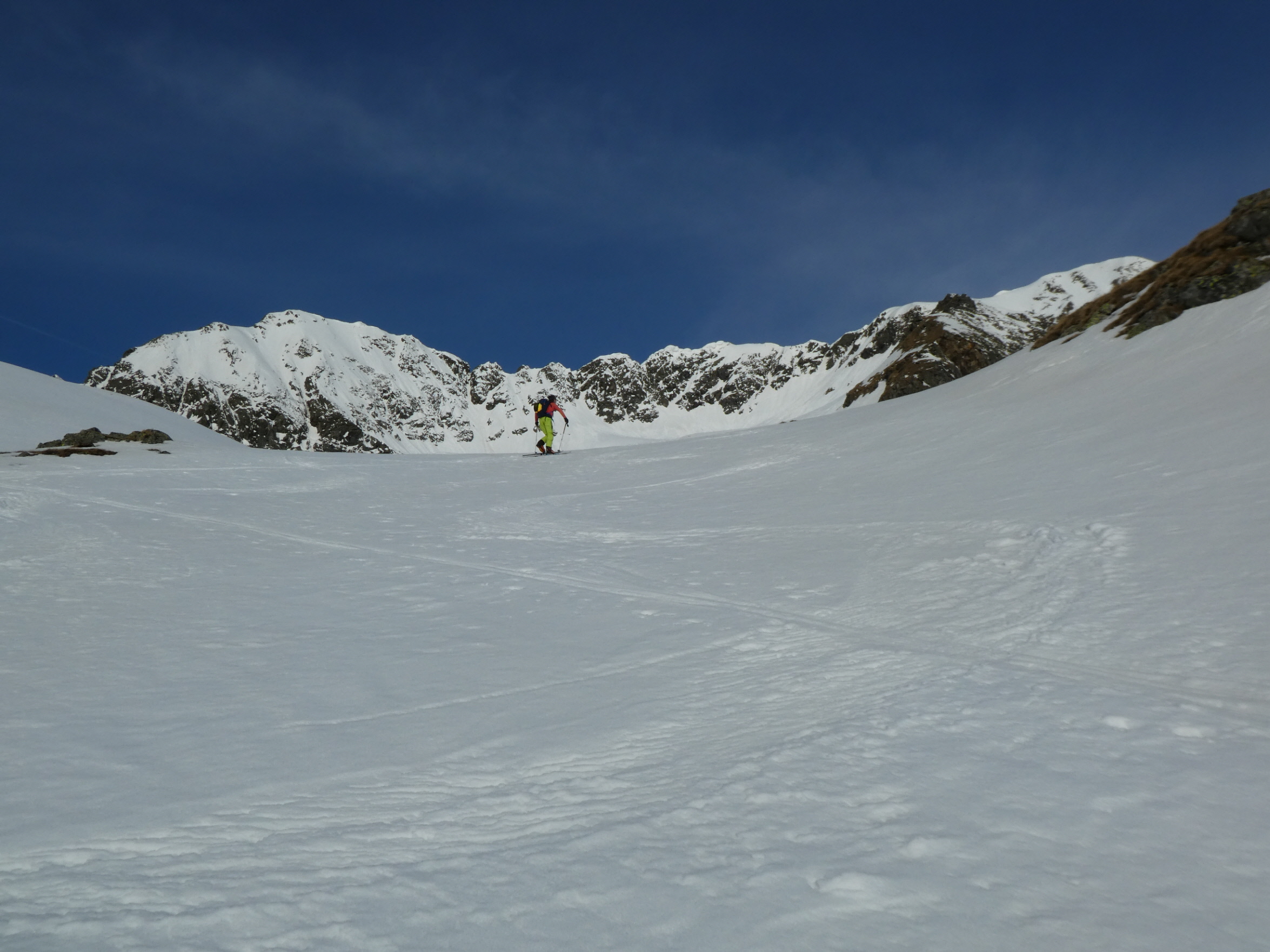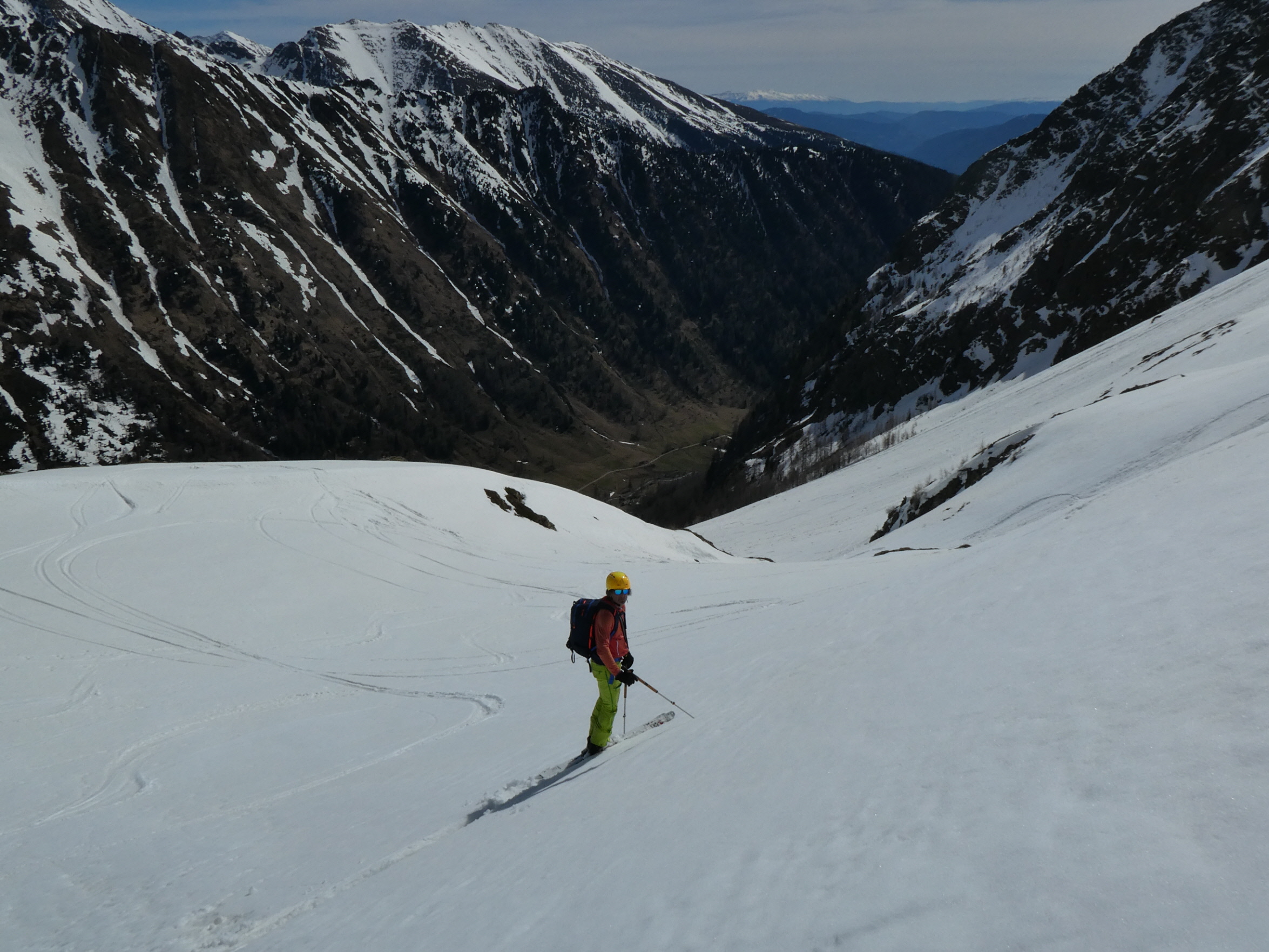 Mit abnehmender Steilheit hat das Abfahrtsvergügen schlagartig zugenommen. Der schmierige Firnschnee ist seitlich weggespritzt und jeder Schwung war ein Genuss. Das ist auch bei der weiteren Abfahrt aus dem Kar über die ersten weiten Flächen so geblieben. Mit zunehmender Steilheit in der Rinne war dann nicht zu vermeiden, dass der eine oder andere Schwung zum Balanceakt mutiert ist. Da habe ich mir dann schon ein paar Mal gewünscht, ich hätte bei der Skiwahl vor der Tour doch ein breiteres Modell eingepackt.
