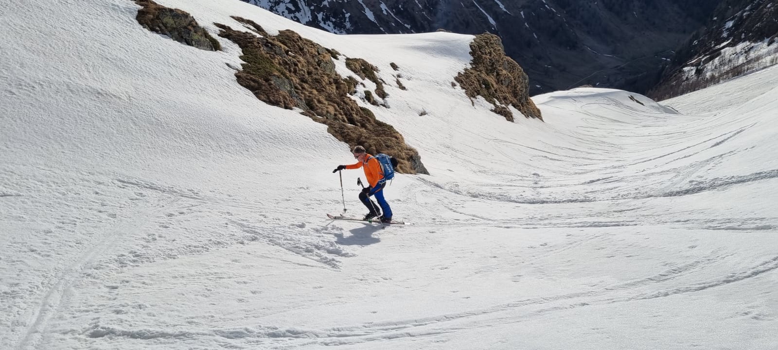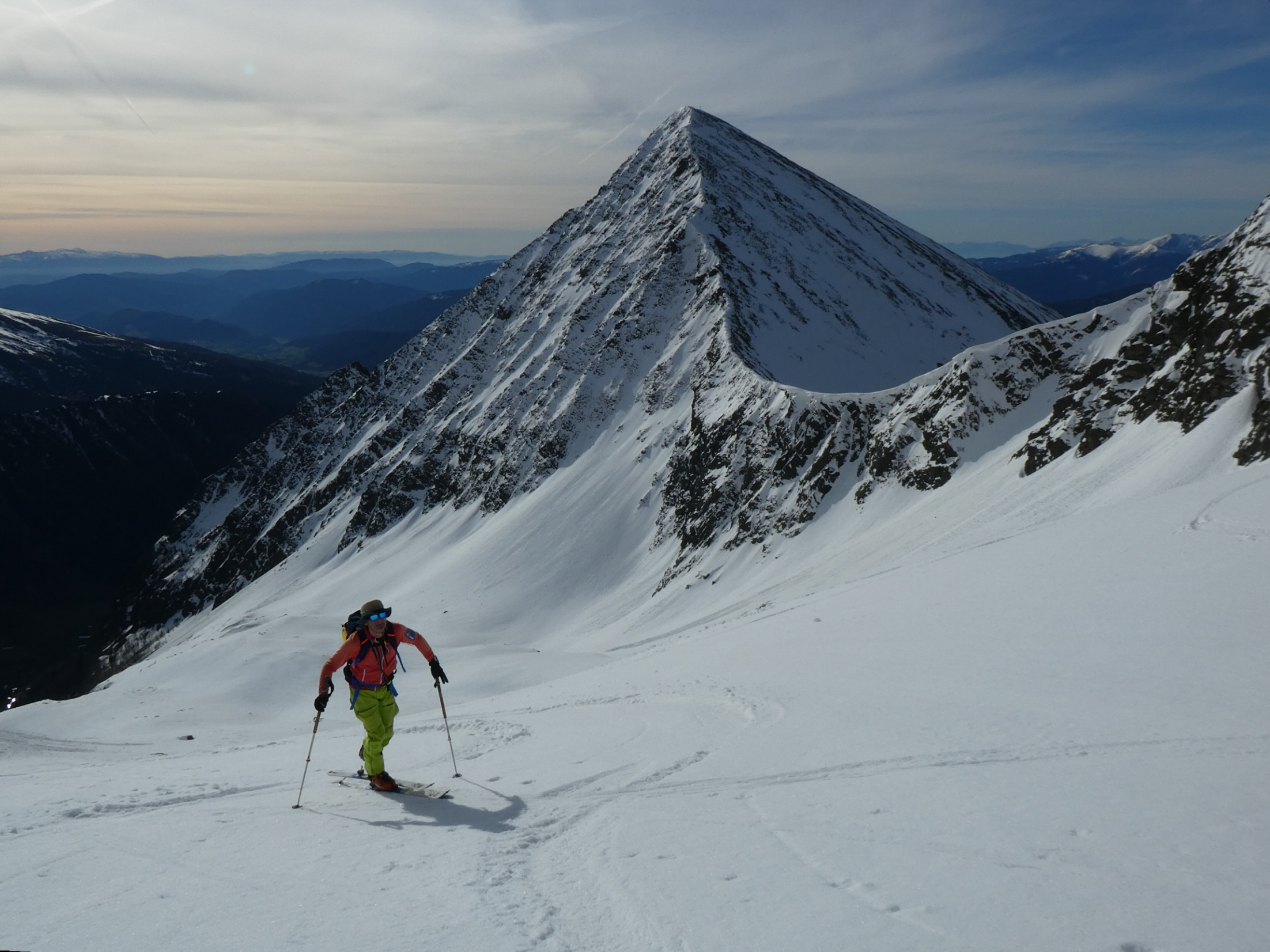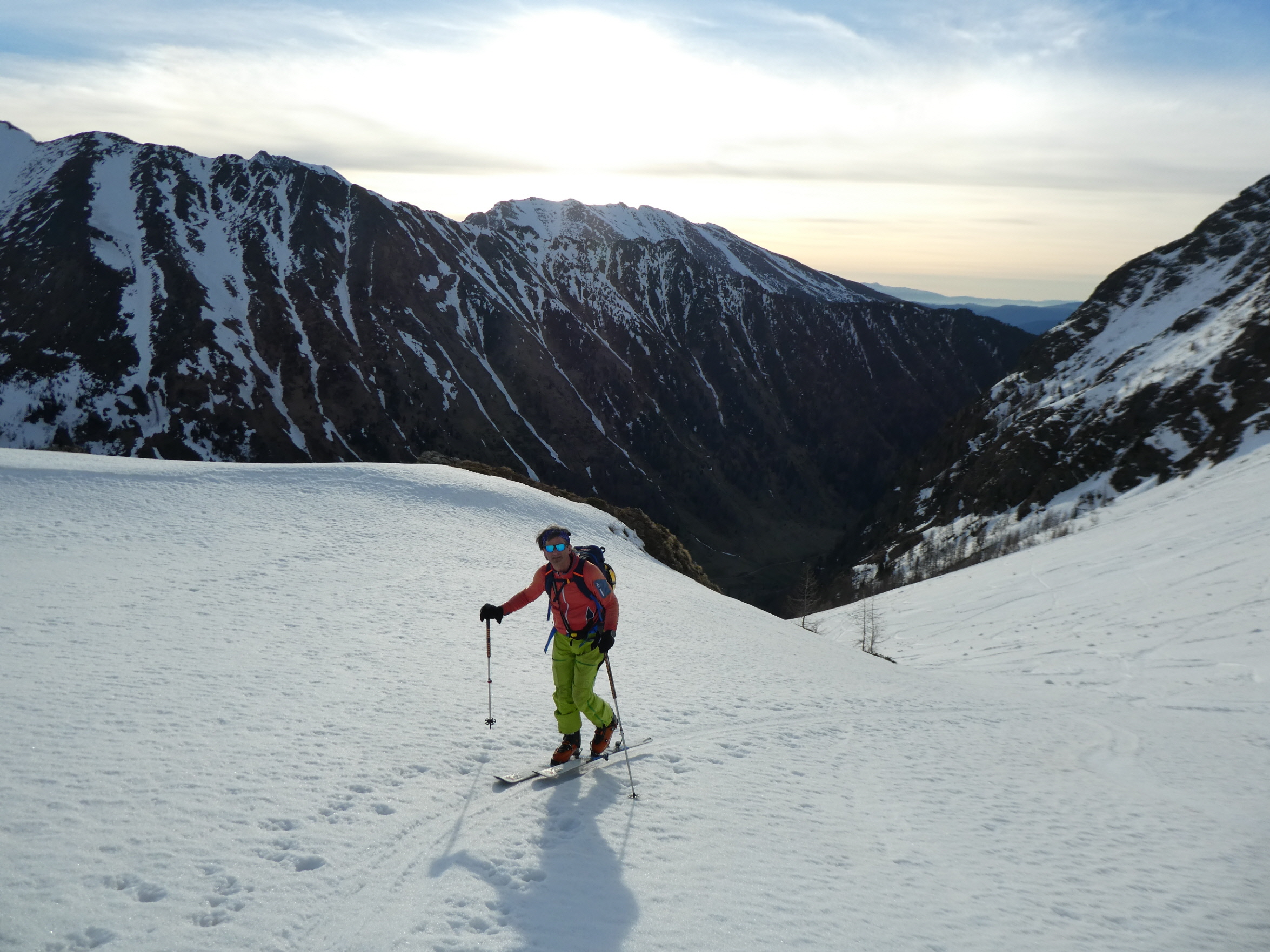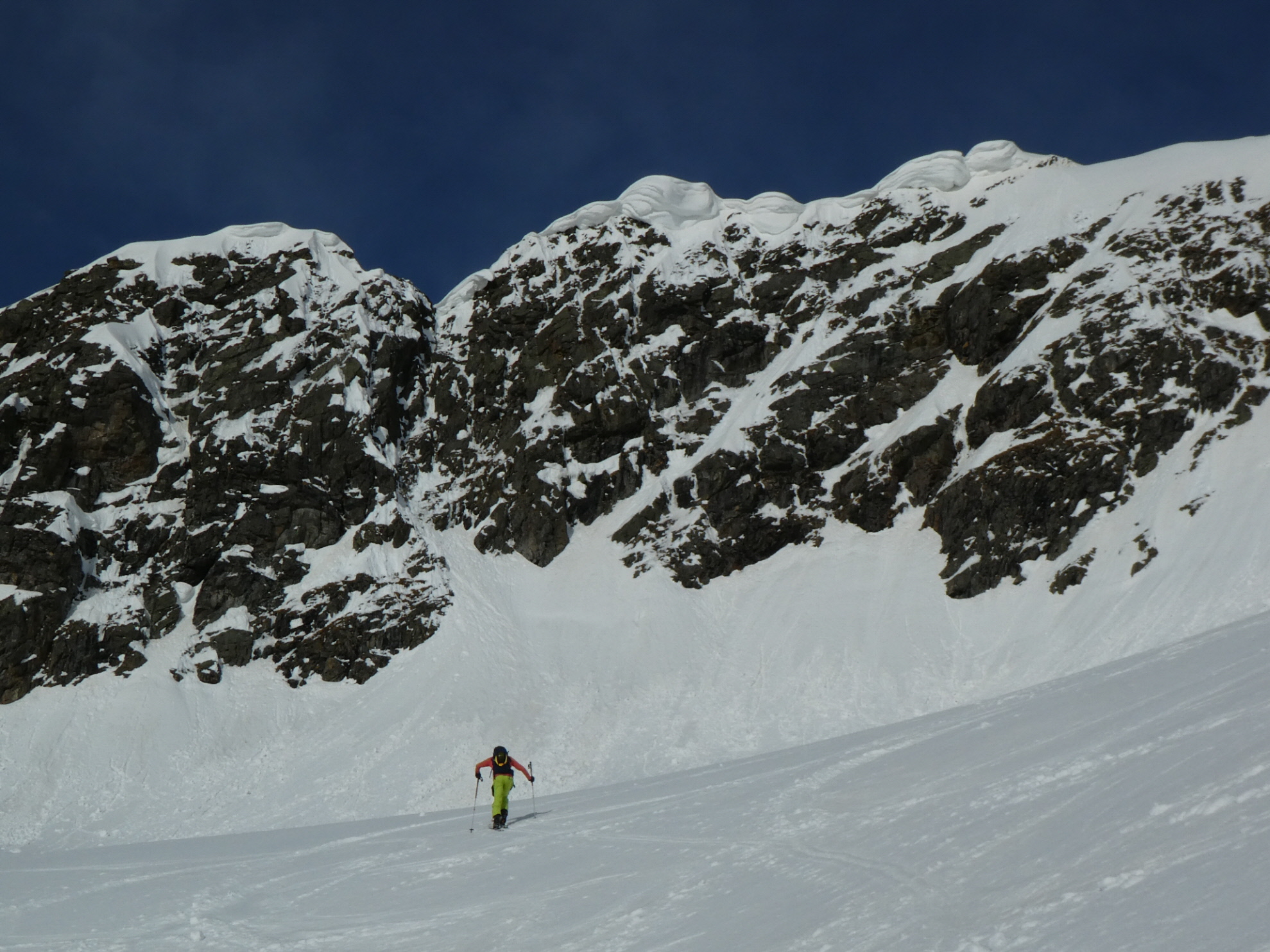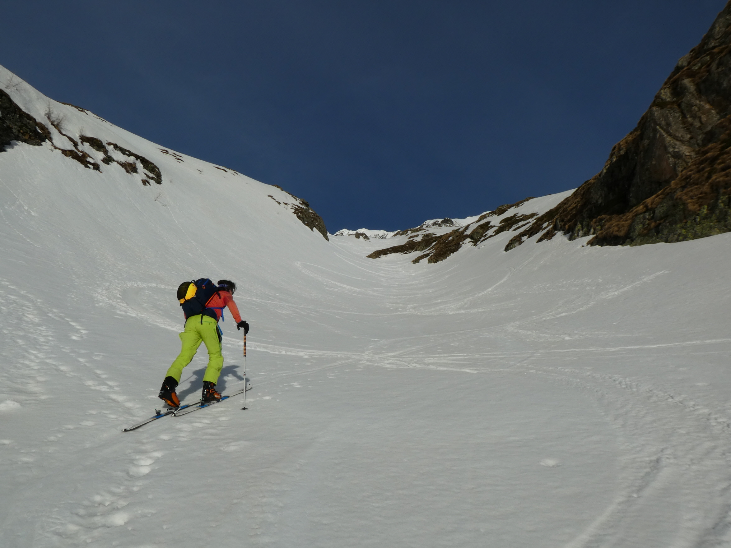 Mit abnehmender Steilheit hat das Abfahrtsvergügen schlagartig zugenommen. Der schmierige Firnschnee ist seitlich weggespritzt und jeder Schwung war ein Genuss. Das ist auch bei der weiteren Abfahrt aus dem Kar über die ersten weiten Flächen so geblieben. Mit zunehmender Steilheit in der Rinne war dann nicht zu vermeiden, dass der eine oder andere Schwung zum Balanceakt mutiert ist. Da habe ich mir dann schon ein paar Mal gewünscht, ich hätte bei der Skiwahl vor der Tour doch ein breiteres Modell eingepackt.