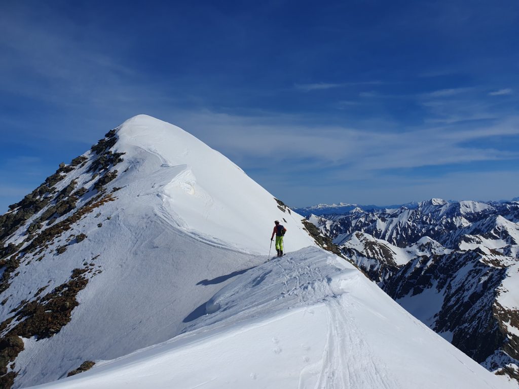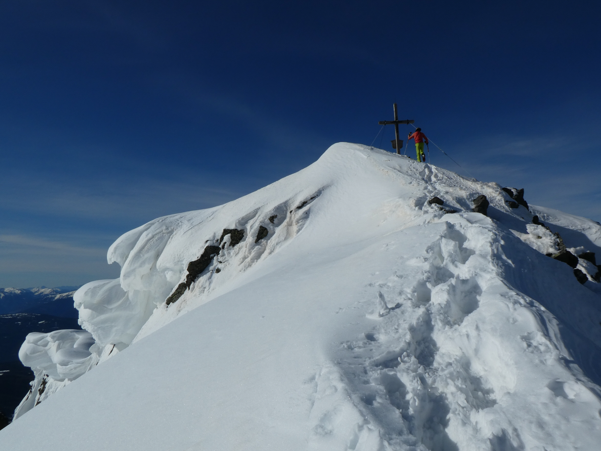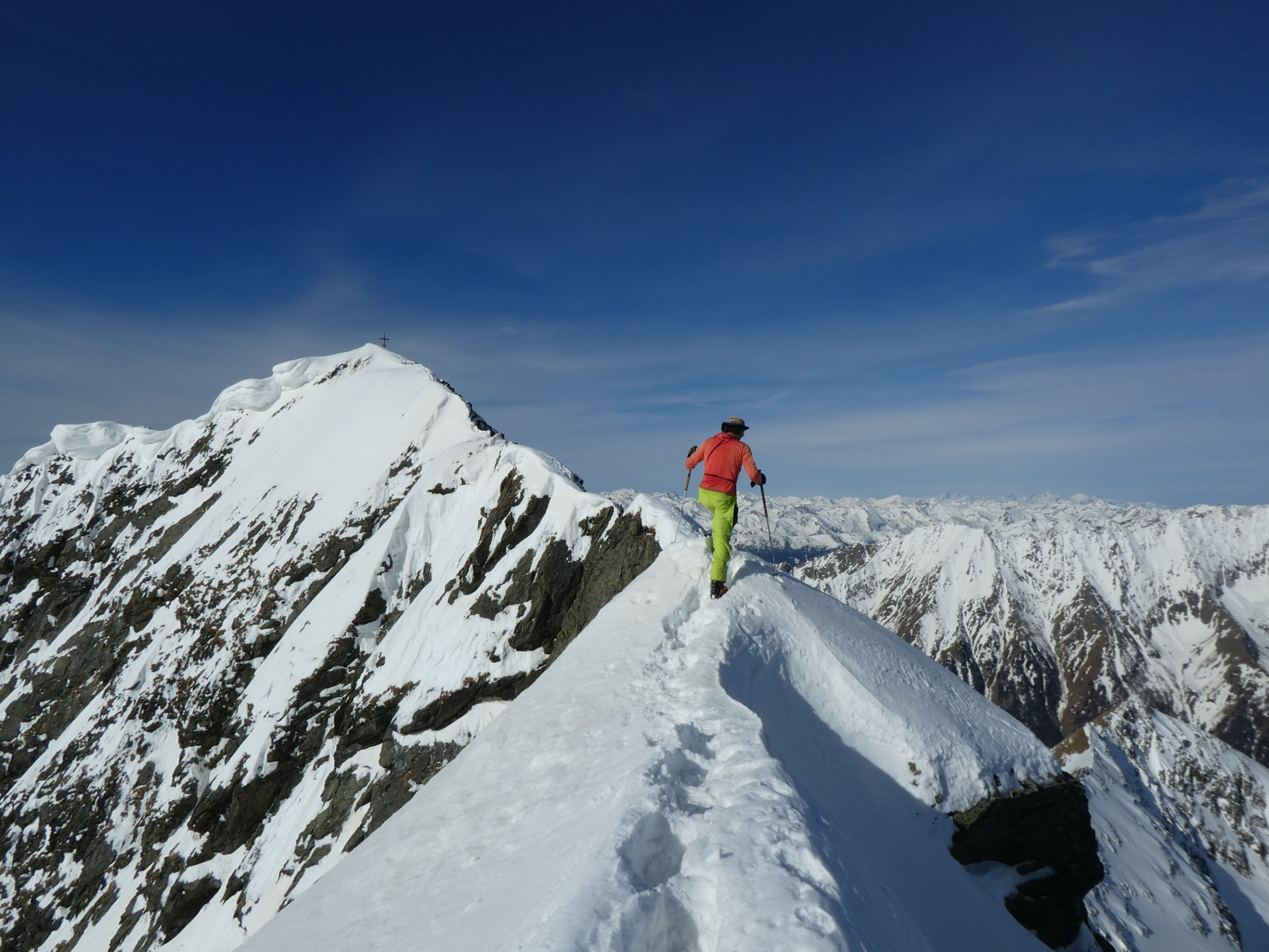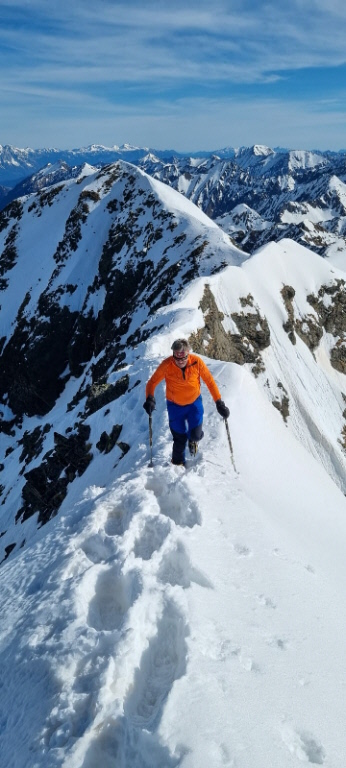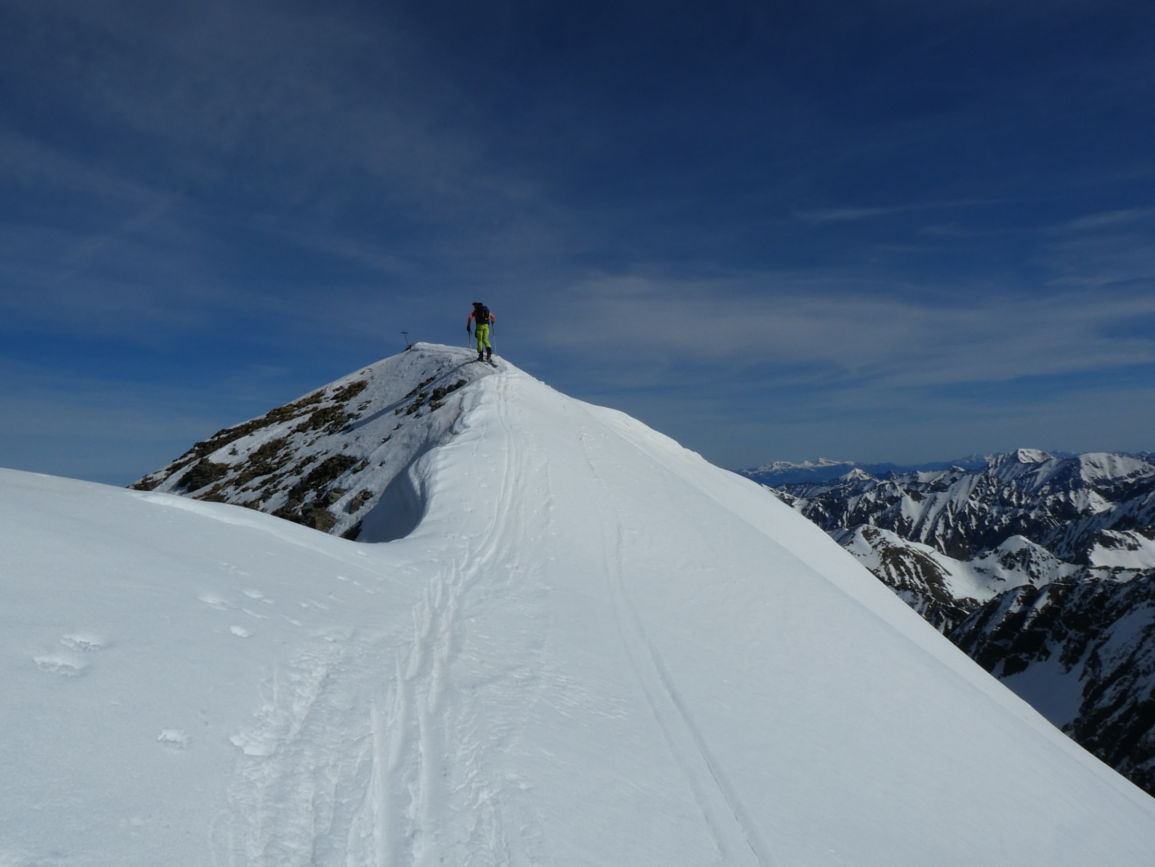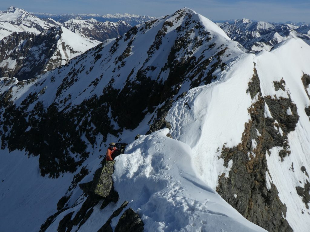 Nur eine leichte Brise hat geblasen und die herrliche Fernsicht in alle Richtungen hätte zum langen Verweilen eingeladen. Die durch den vielen Saharastaub in der Luft zwar leicht abgedämpfte Sonneneinstrahlung hat aber unaufhörlich die Schneeflächen, über die wir genussvoll abfahren wollten, aufgeheizt. Daher haben wir uns gesputet und sind über den Grat wieder abgestiegen.