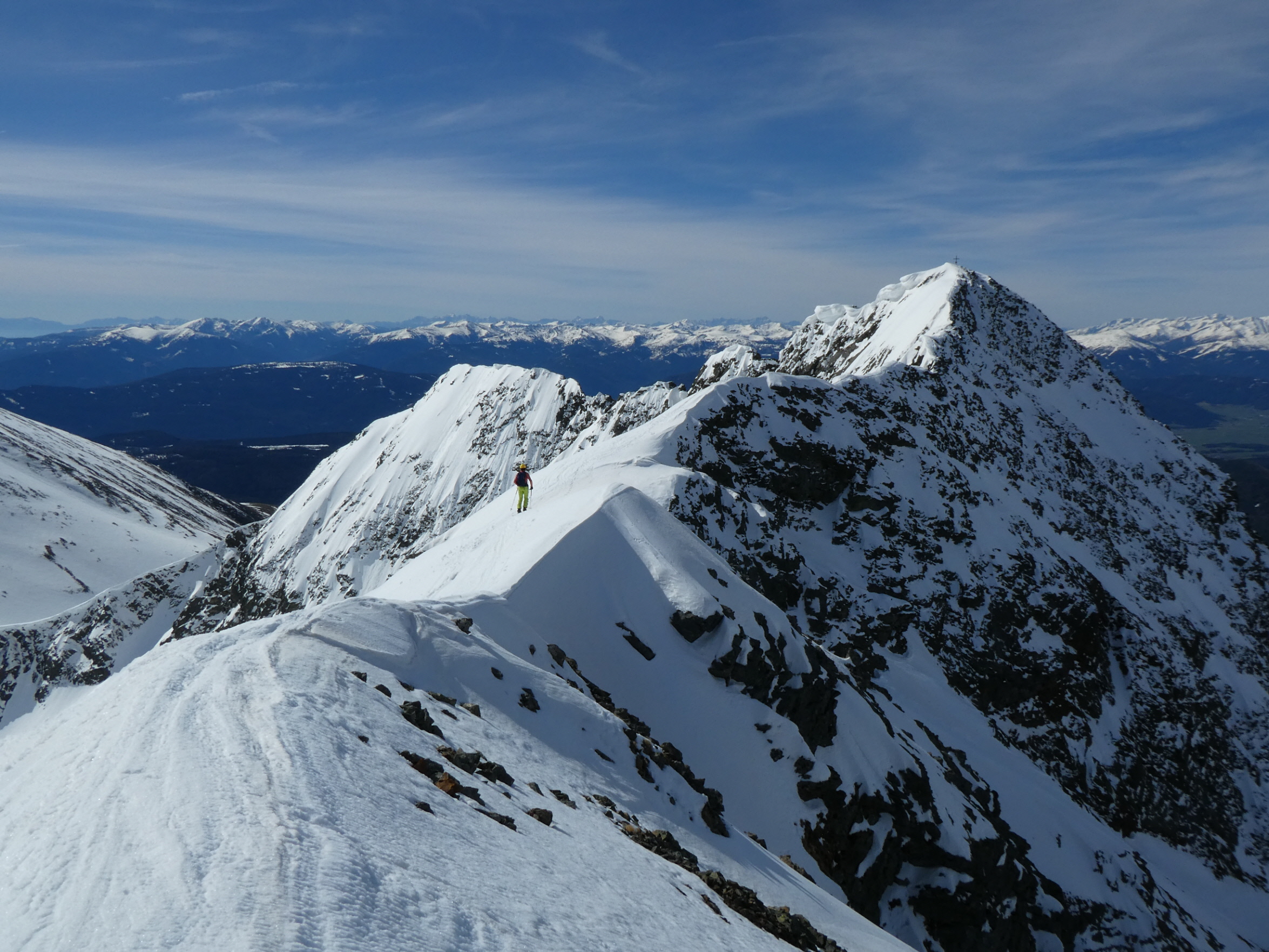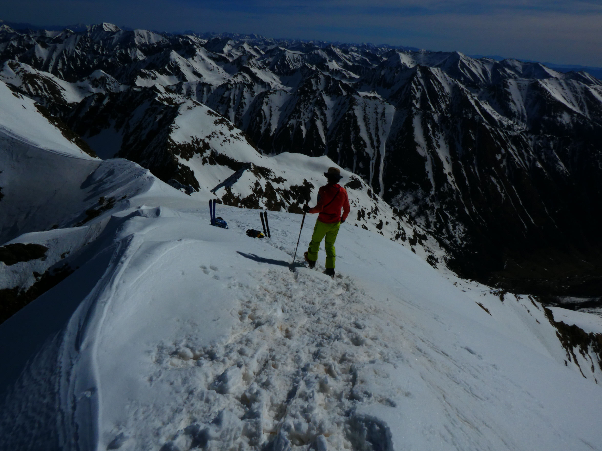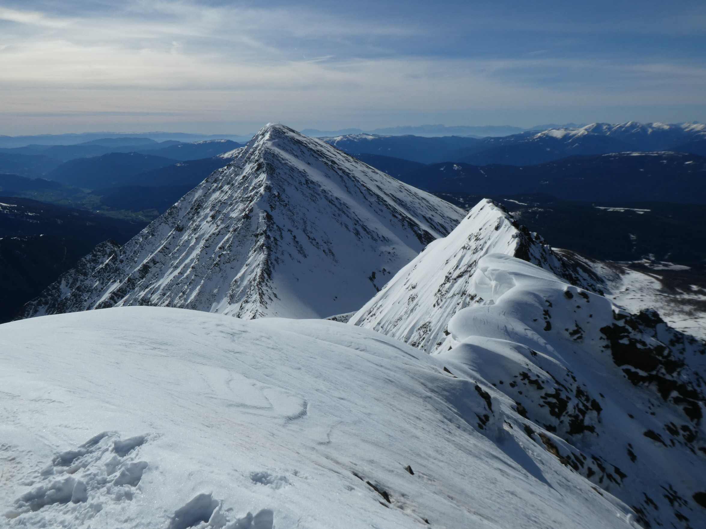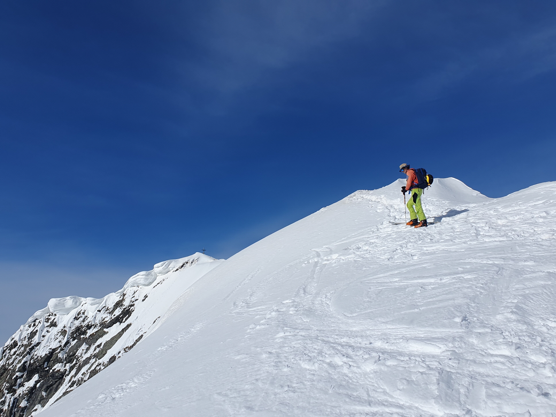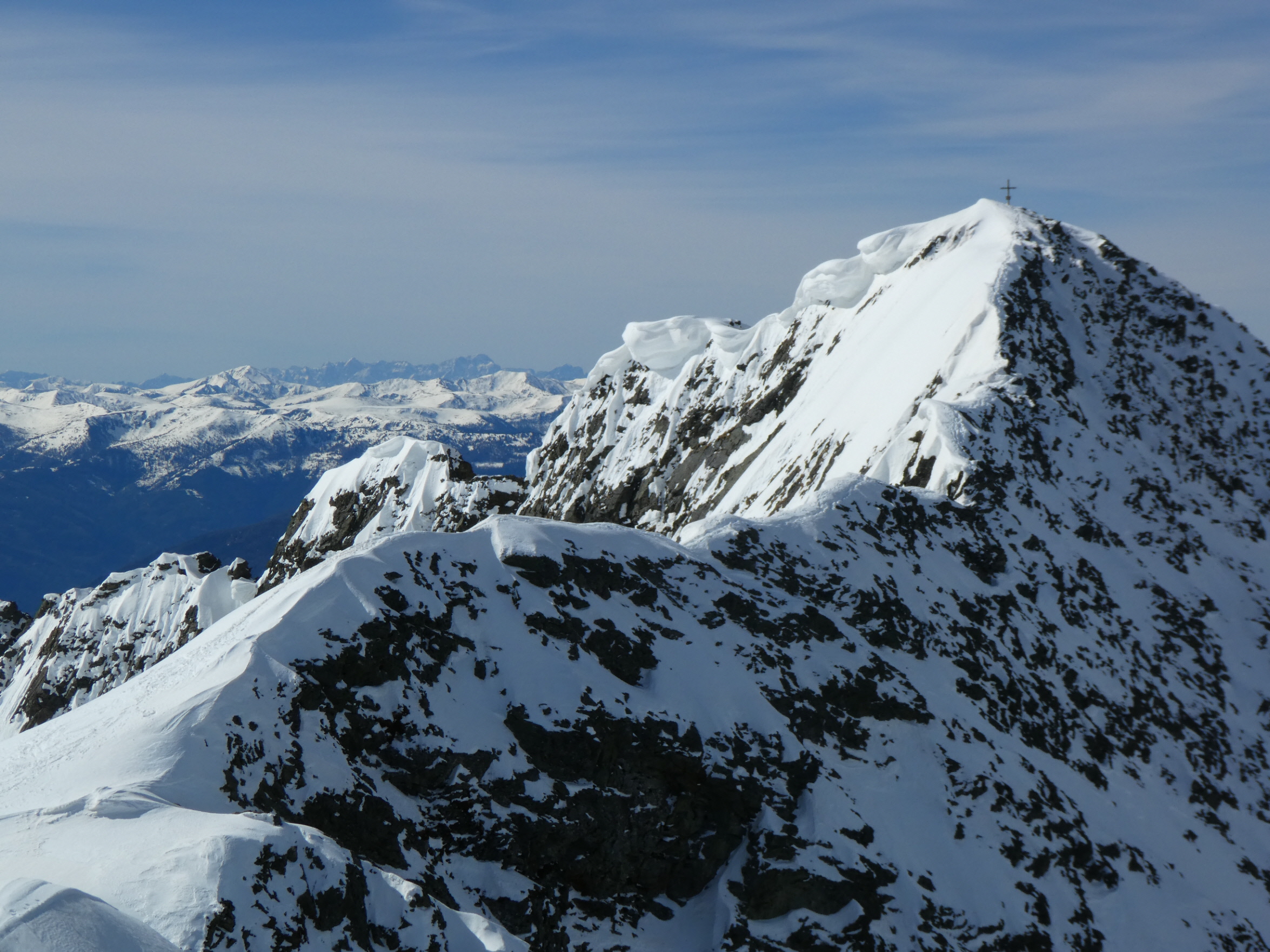 Nur eine leichte Brise hat geblasen und die herrliche Fernsicht in alle Richtungen hätte zum langen Verweilen eingeladen. Die durch den vielen Saharastaub in der Luft zwar leicht abgedämpfte Sonneneinstrahlung hat aber unaufhörlich die Schneeflächen, über die wir genussvoll abfahren wollten, aufgeheizt. Daher haben wir uns gesputet und sind über den Grat wieder abgestiegen.