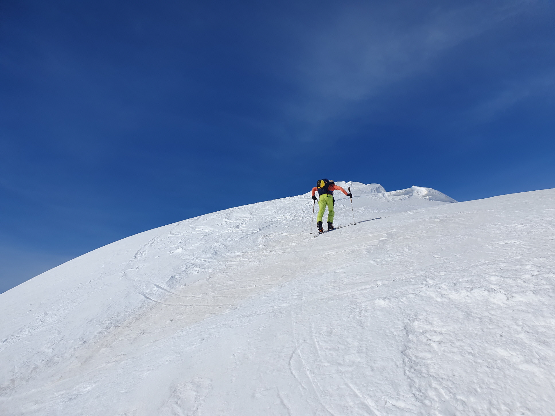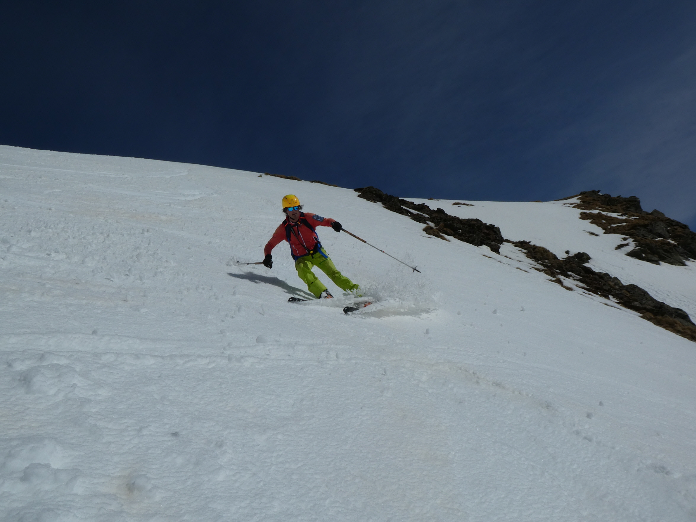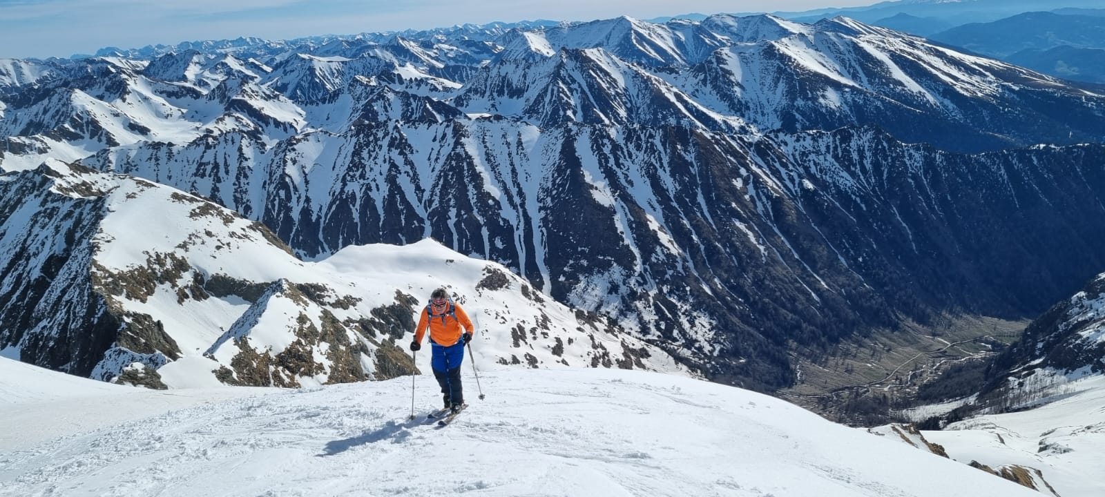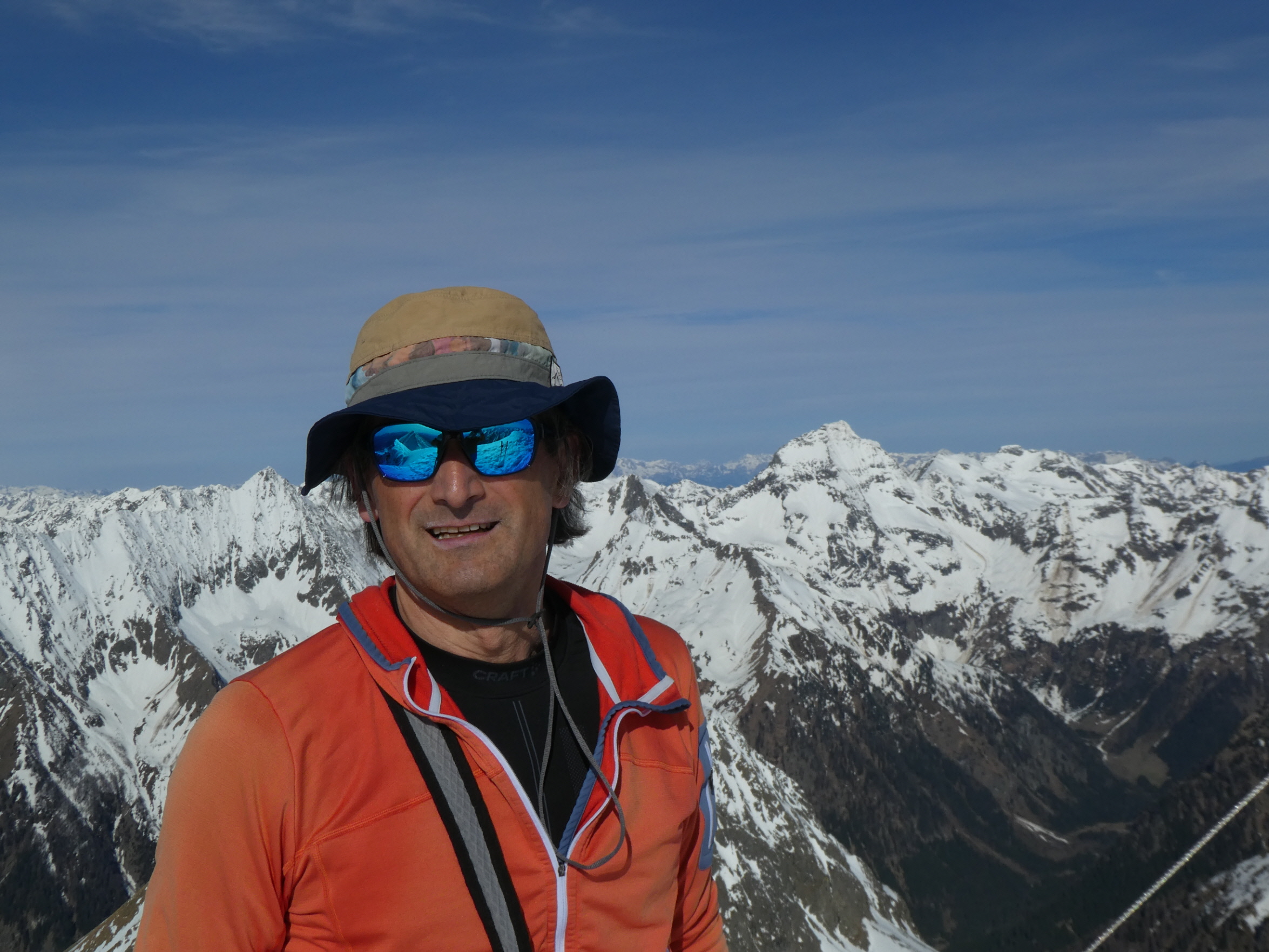 Nur eine leichte Brise hat geblasen und die herrliche Fernsicht in alle Richtungen hätte zum langen Verweilen eingeladen. Die durch den vielen Saharastaub in der Luft zwar leicht abgedämpfte Sonneneinstrahlung hat aber unaufhörlich die Schneeflächen, über die wir genussvoll abfahren wollten, aufgeheizt. Daher haben wir uns gesputet und sind über den Grat wieder abgestiegen.