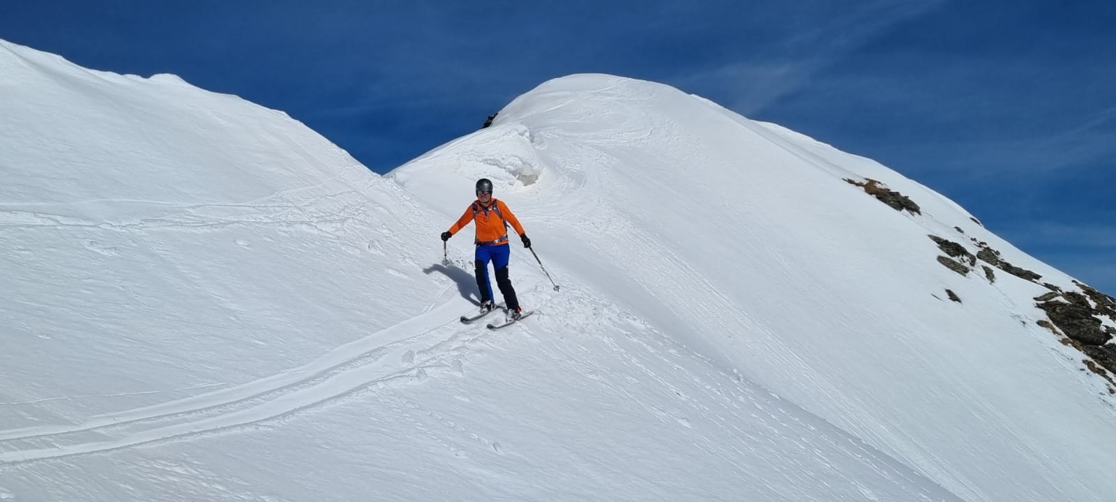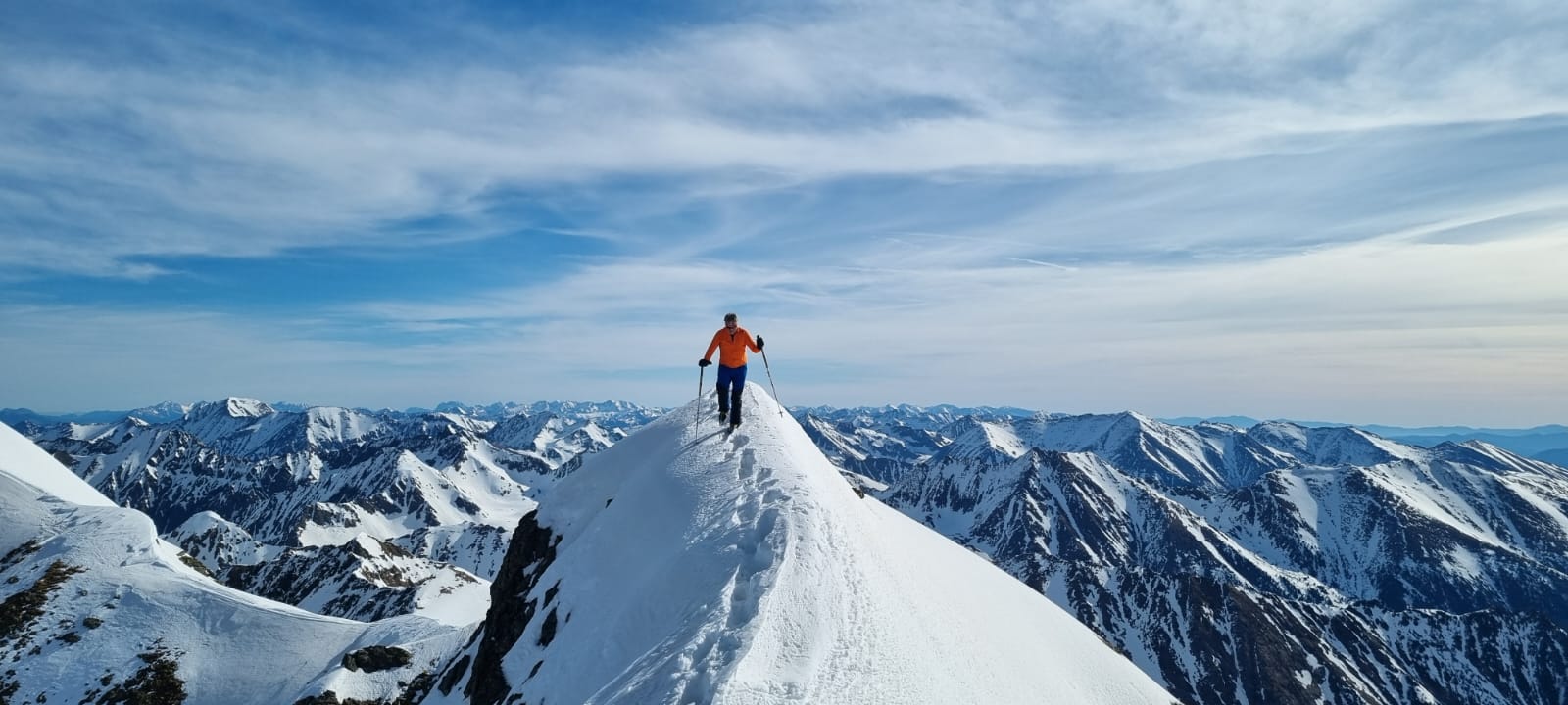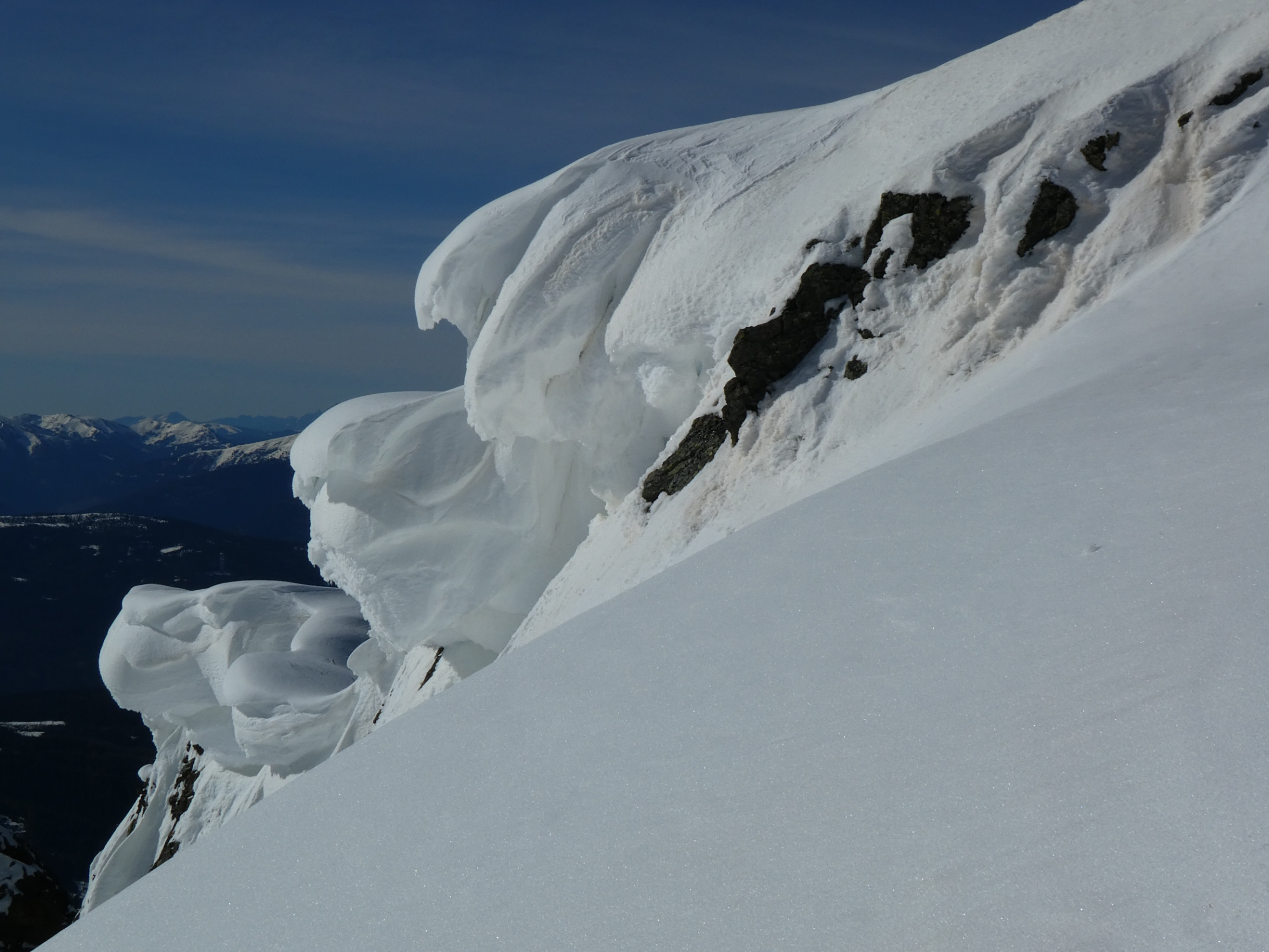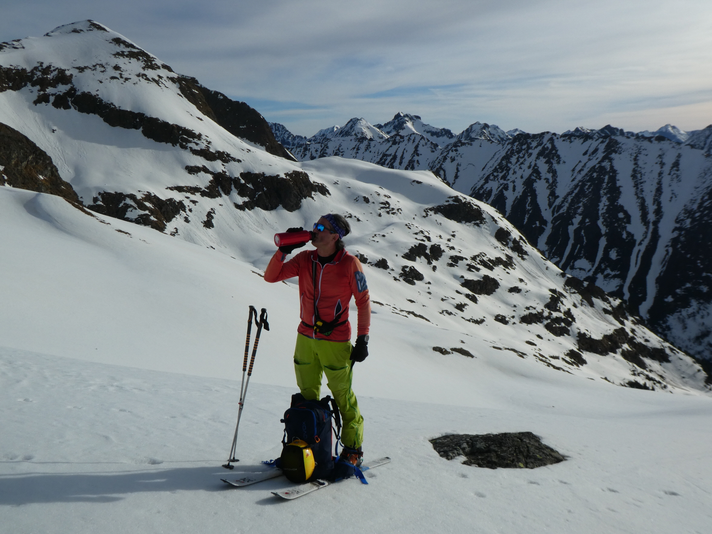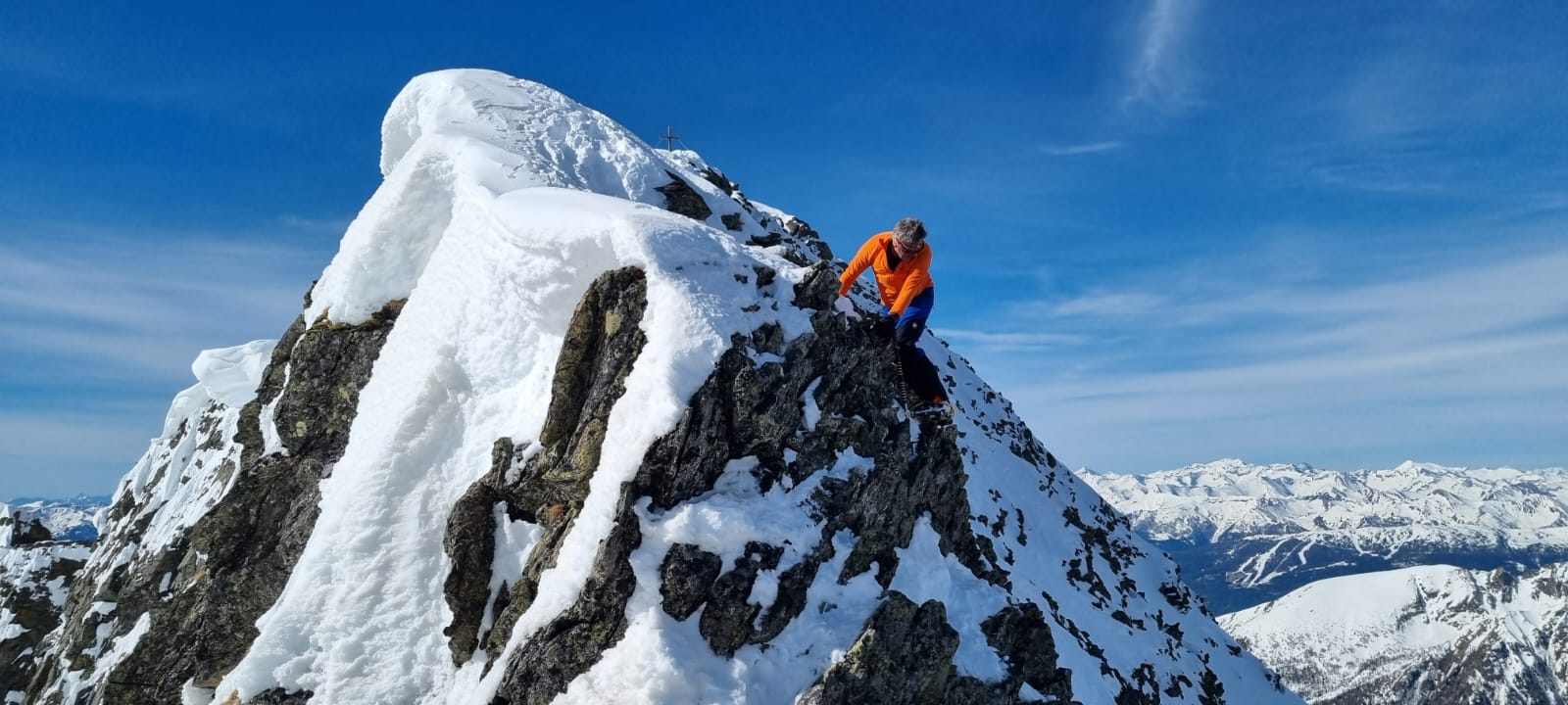 Nur eine leichte Brise hat geblasen und die herrliche Fernsicht in alle Richtungen hätte zum langen Verweilen eingeladen. Die durch den vielen Saharastaub in der Luft zwar leicht abgedämpfte Sonneneinstrahlung hat aber unaufhörlich die Schneeflächen, über die wir genussvoll abfahren wollten, aufgeheizt. Daher haben wir uns gesputet und sind über den Grat wieder abgestiegen.