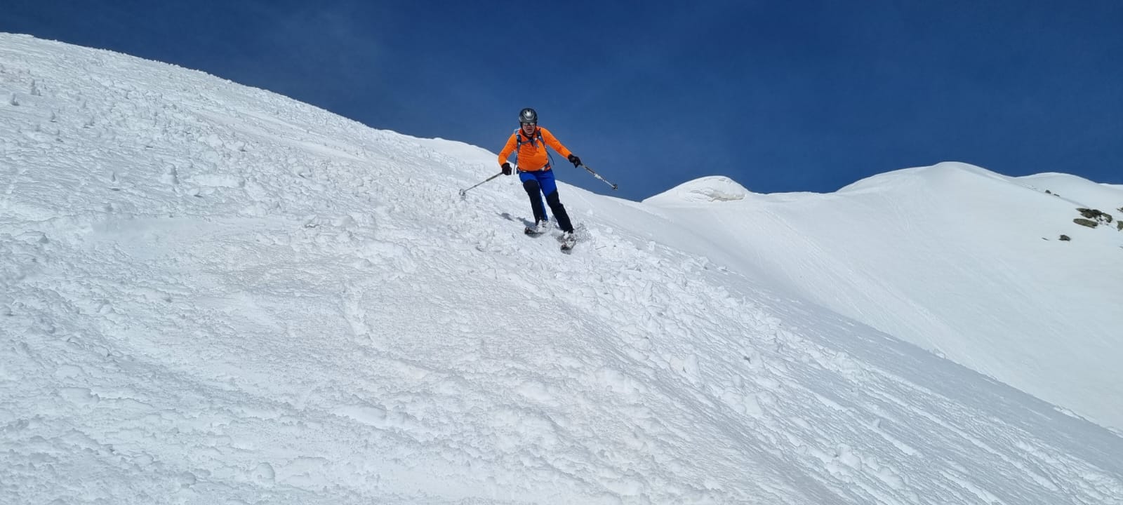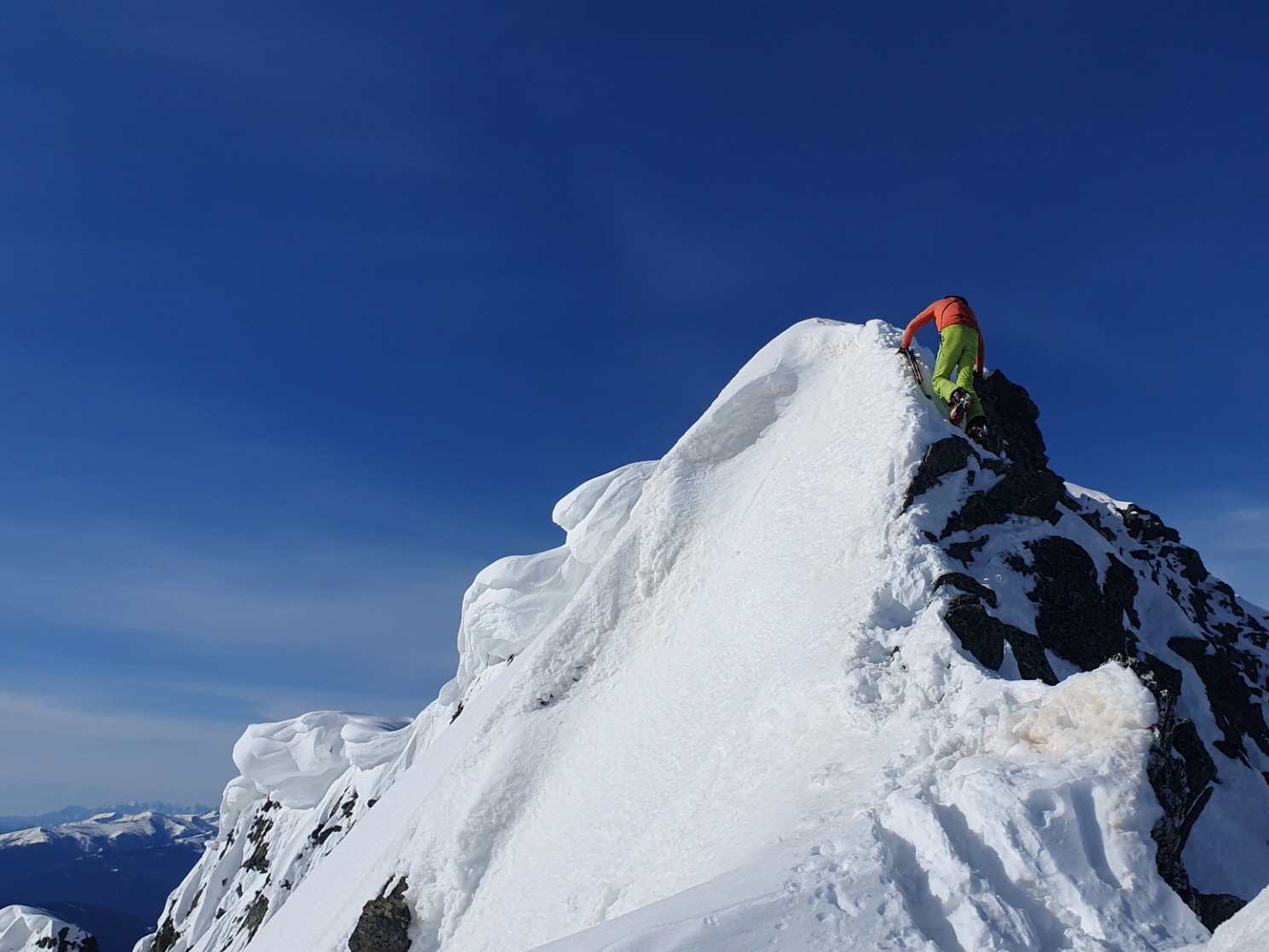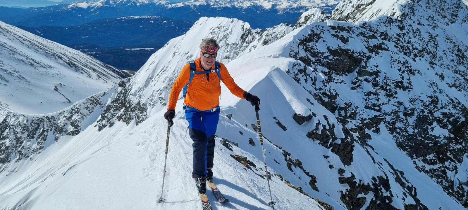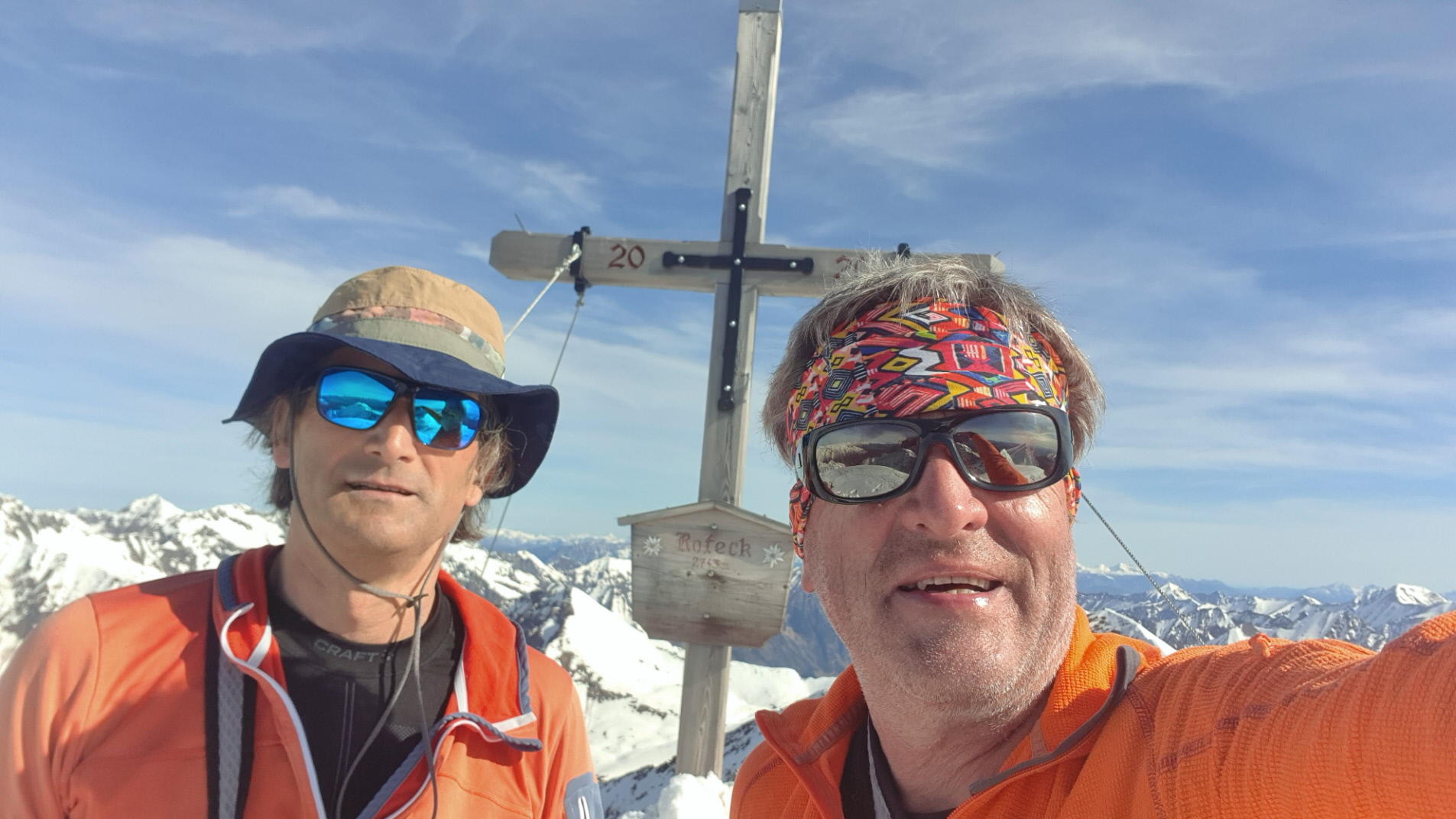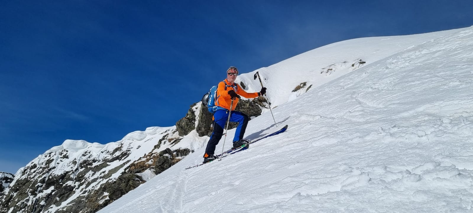 Nur eine leichte Brise hat geblasen und die herrliche Fernsicht in alle Richtungen hätte zum langen Verweilen eingeladen. Die durch den vielen Saharastaub in der Luft zwar leicht abgedämpfte Sonneneinstrahlung hat aber unaufhörlich die Schneeflächen, über die wir genussvoll abfahren wollten, aufgeheizt. Daher haben wir uns gesputet und sind über den Grat wieder abgestiegen.