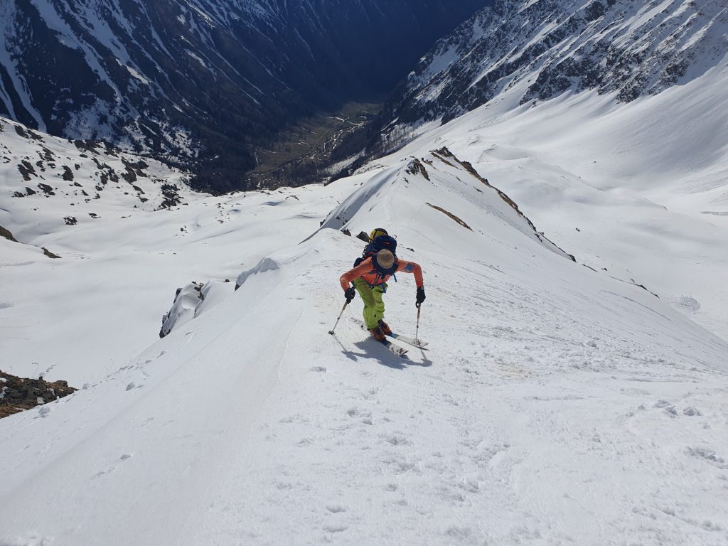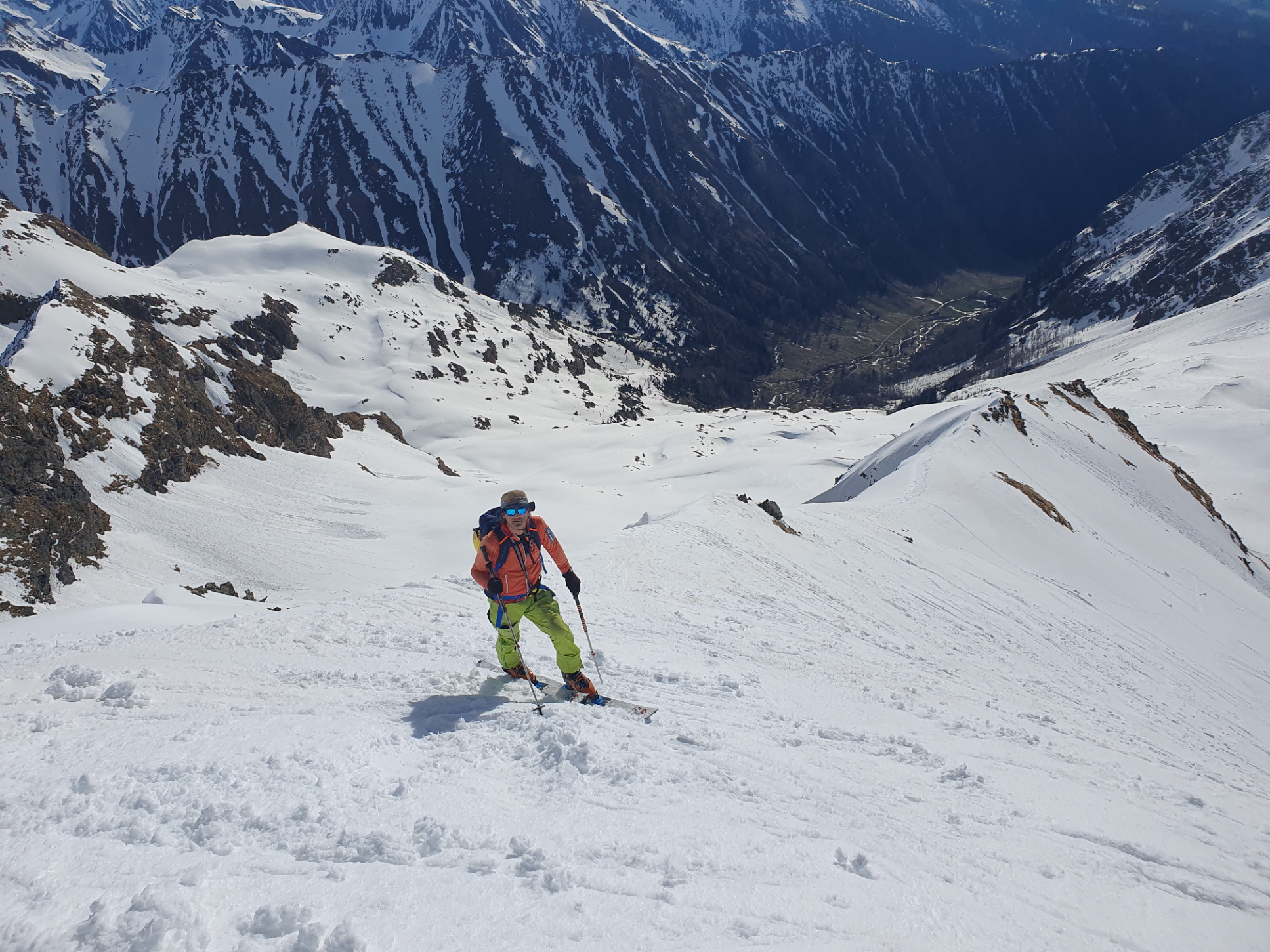 Nach der nötigen Zeit für das Abfellen und Umrüsten in den Abfahrtsmodus sind wir direkt vom Gipfel losgefahren. Gleich einmal war klar, dass die im Anstieg noch harte Schneedecke mittlerweile voll aufgegangen war. Vom Sattel zwischen den beiden Tagesgipfeln sind wir in etwa entlang unseres Aufstiegsweges ins Moarkar abgefahren. Dort war die Schneedecke etwas indifferent, abhängig von der Hangexposition und der Höhe des noch nicht vollständig umgewandelten Neuschnees aus der Osterwoche.