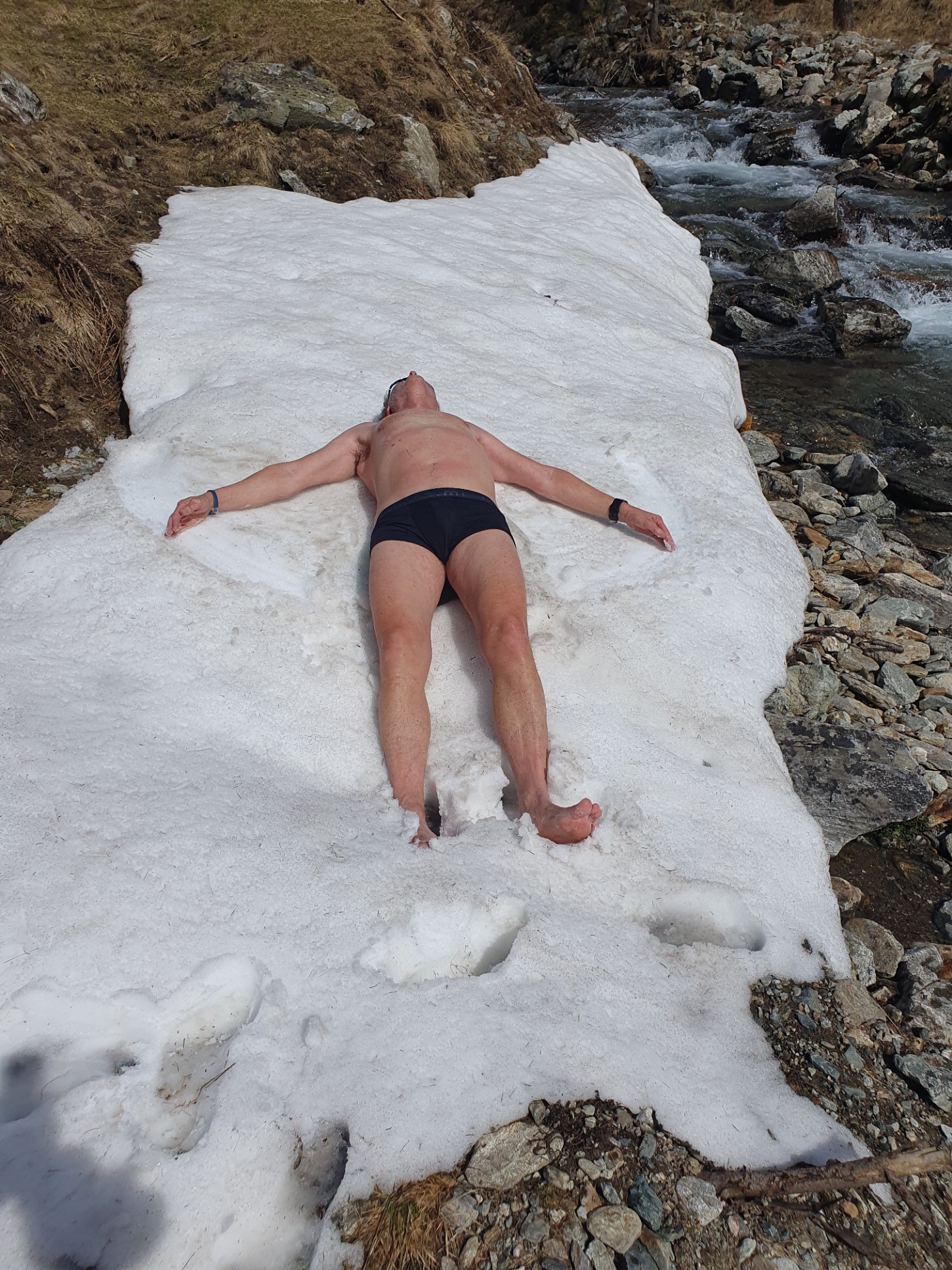 Abkühlen im Schneefeld neben dem Bach