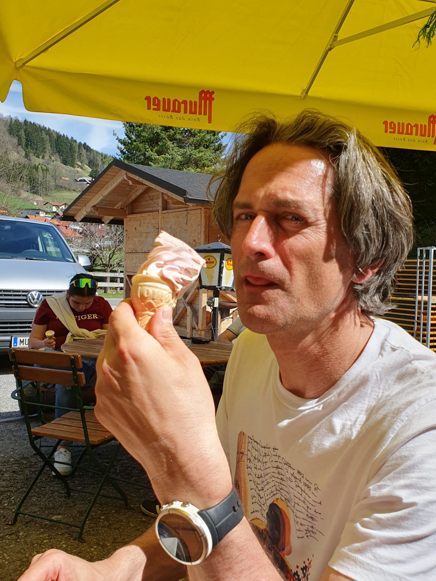 Im Sommeroutfit ging es dann zurück in die Krakau und nach dem Friedhofs- und einem kurzen Verwandtenbesuch weiter in Richtung Graz. Die Heimfahrt haben wir aber unterwegs noch für eine kurze Einkehr unterbrochen. Der dem „Suppenzeugs“ nicht so sehr zugeneigte Heinrich wird stöhnen, wenn er erfährt, dass es nur Suppen und hinterher ein von Andreas so besonders geschätztes Softeis gegeben hat. Aber angesichts der weiteren kulinarischen Pläne für den Nachmittag, sollte auch dafür noch Platz gelassen werden. Das ist aber eine andere Geschichte.