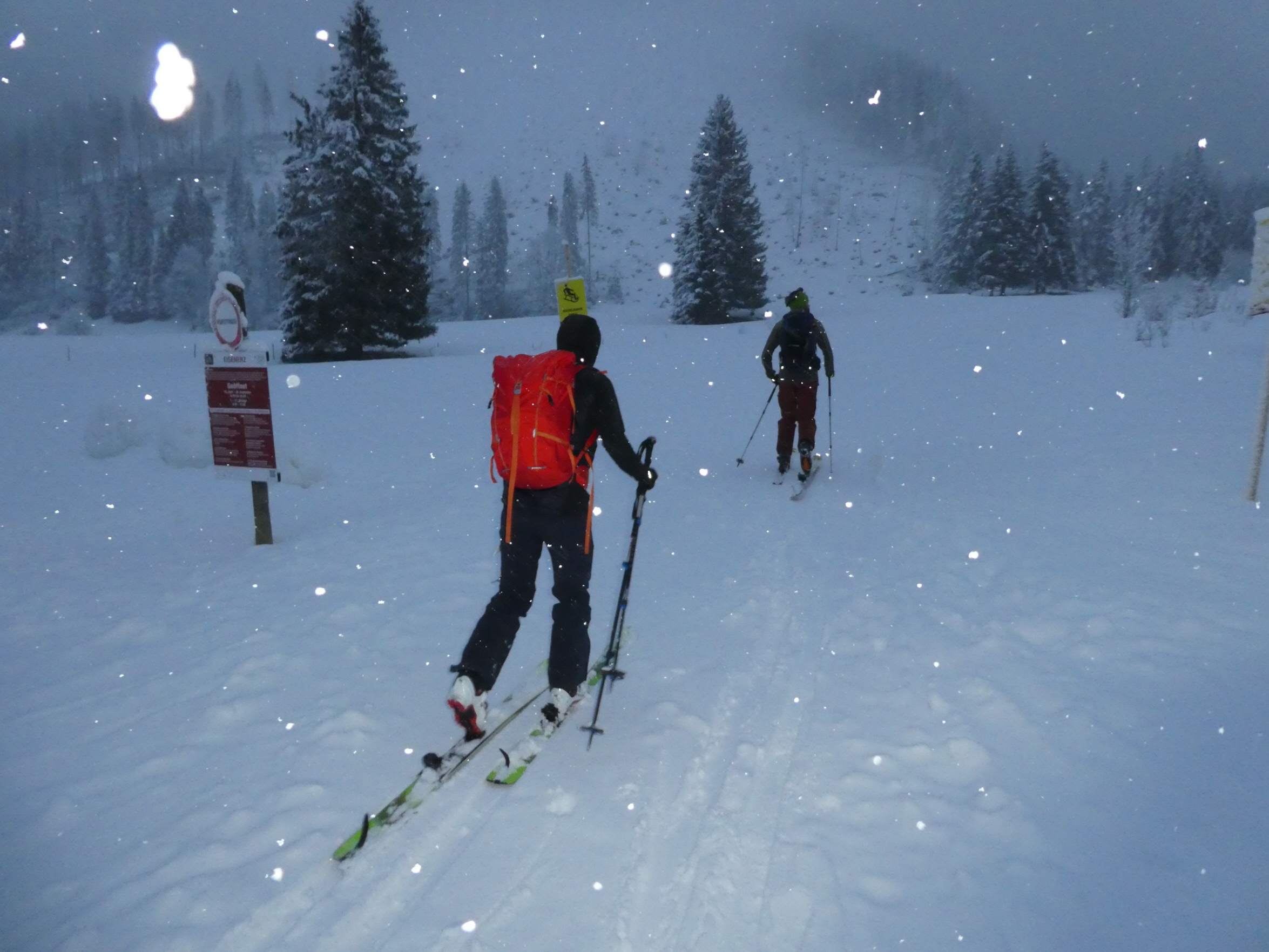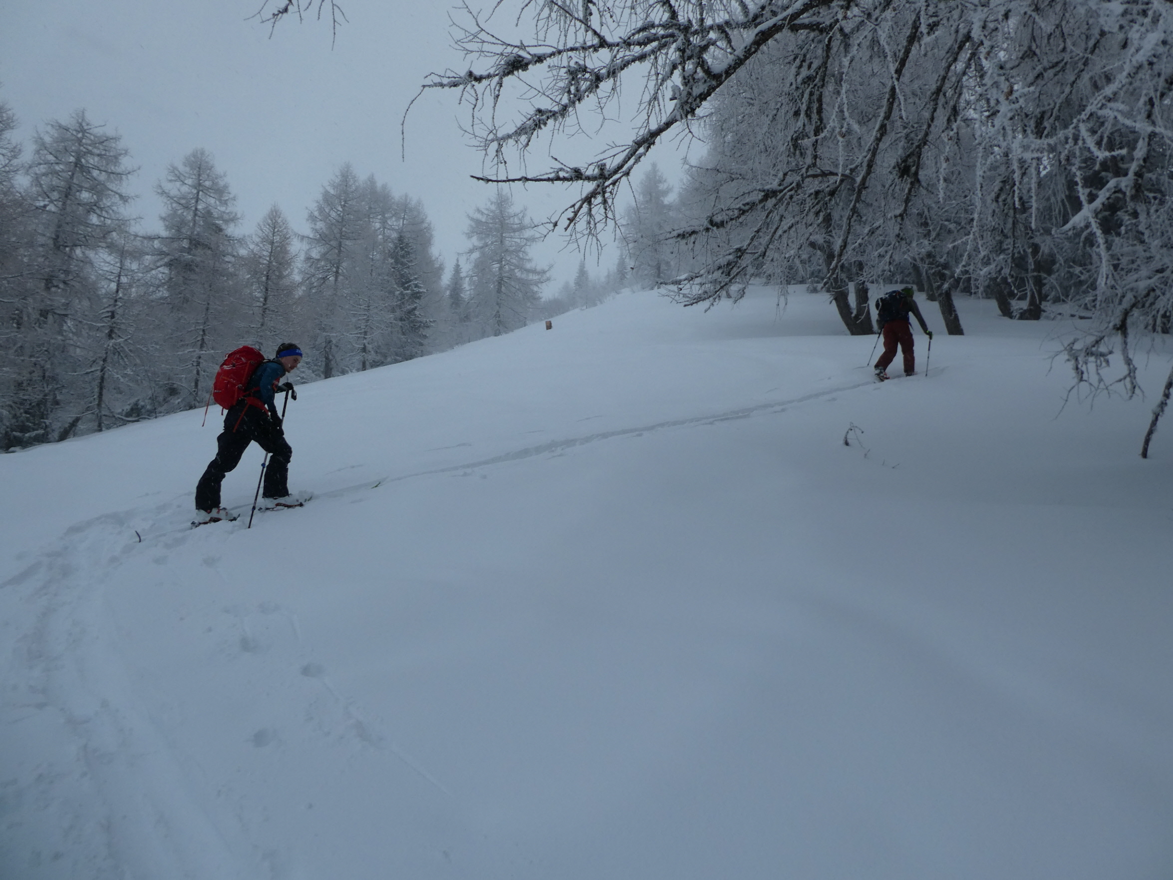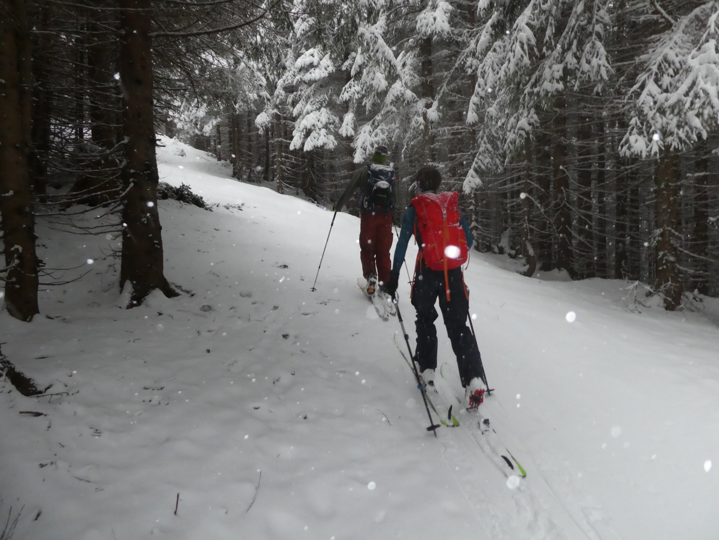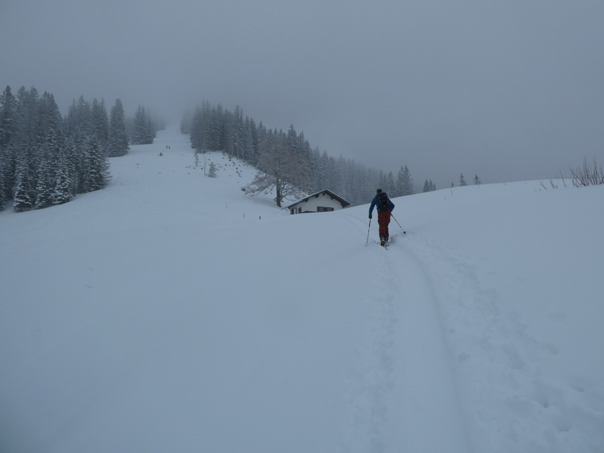 Nach problemloser Anfahrt größtenteils im Regen (nur beim Gleinalmtunnel Nordportal und am Präbichl hatte es geschneit) sind wir bei leichtem Schneefall als erste an diesem Tag entlang der Rodelpiste in die Lasitze gestartet. Chris hat uns von dort eine Spur hinauf auf die Hochalm gelegt. Die Steilstufe und einige Waldpassagen könnten noch etwas Schneezuwachs vertragen.