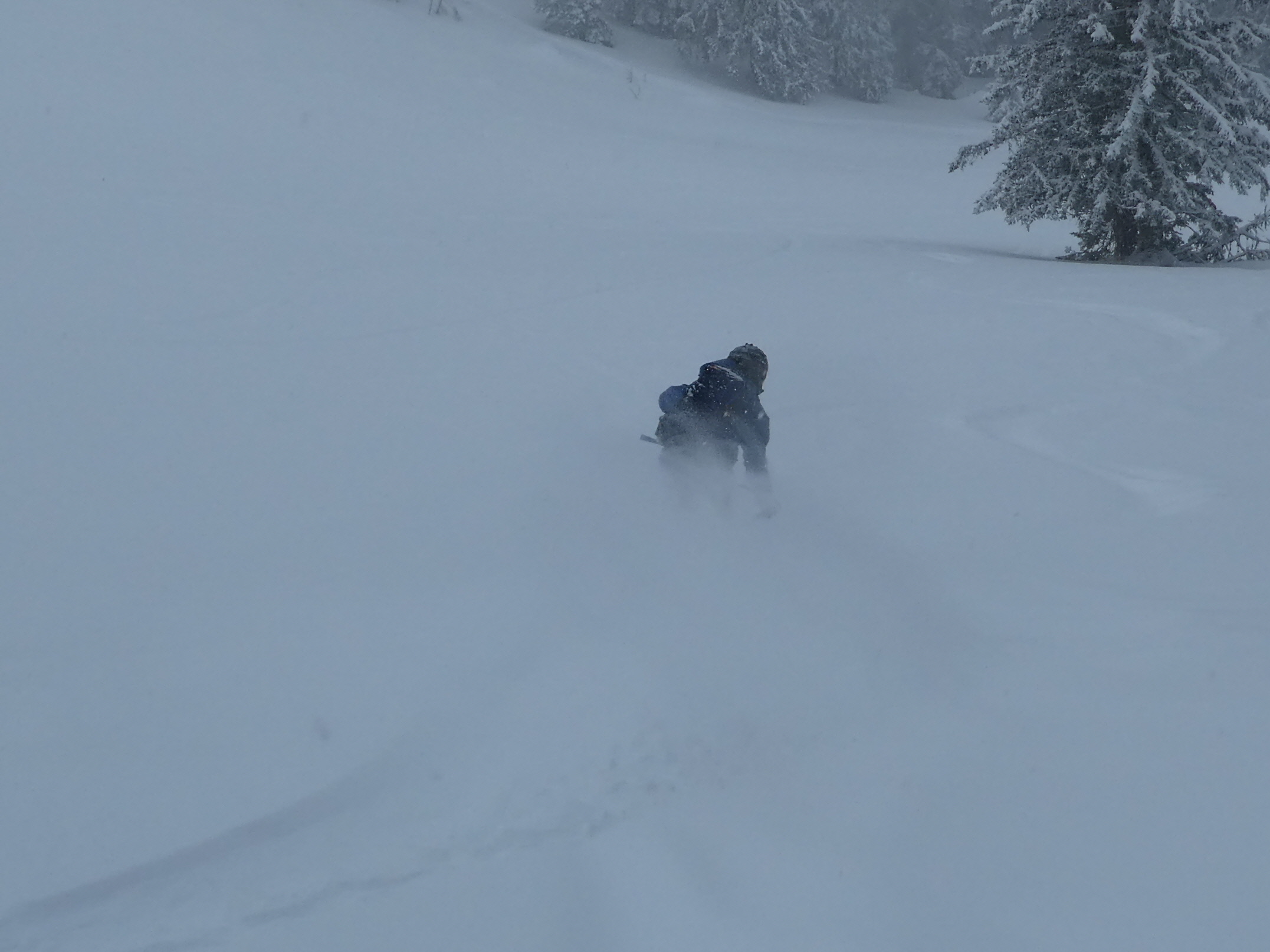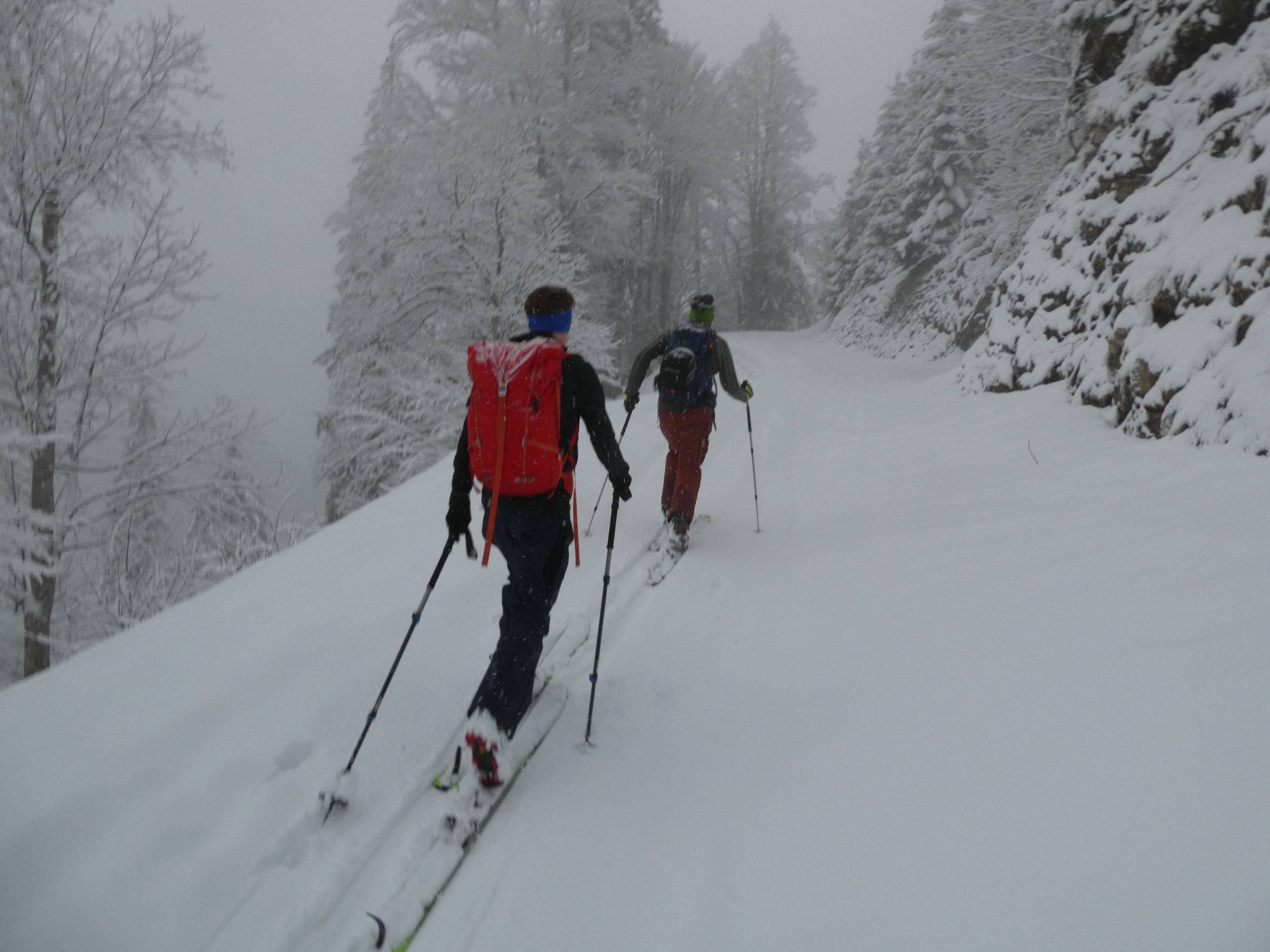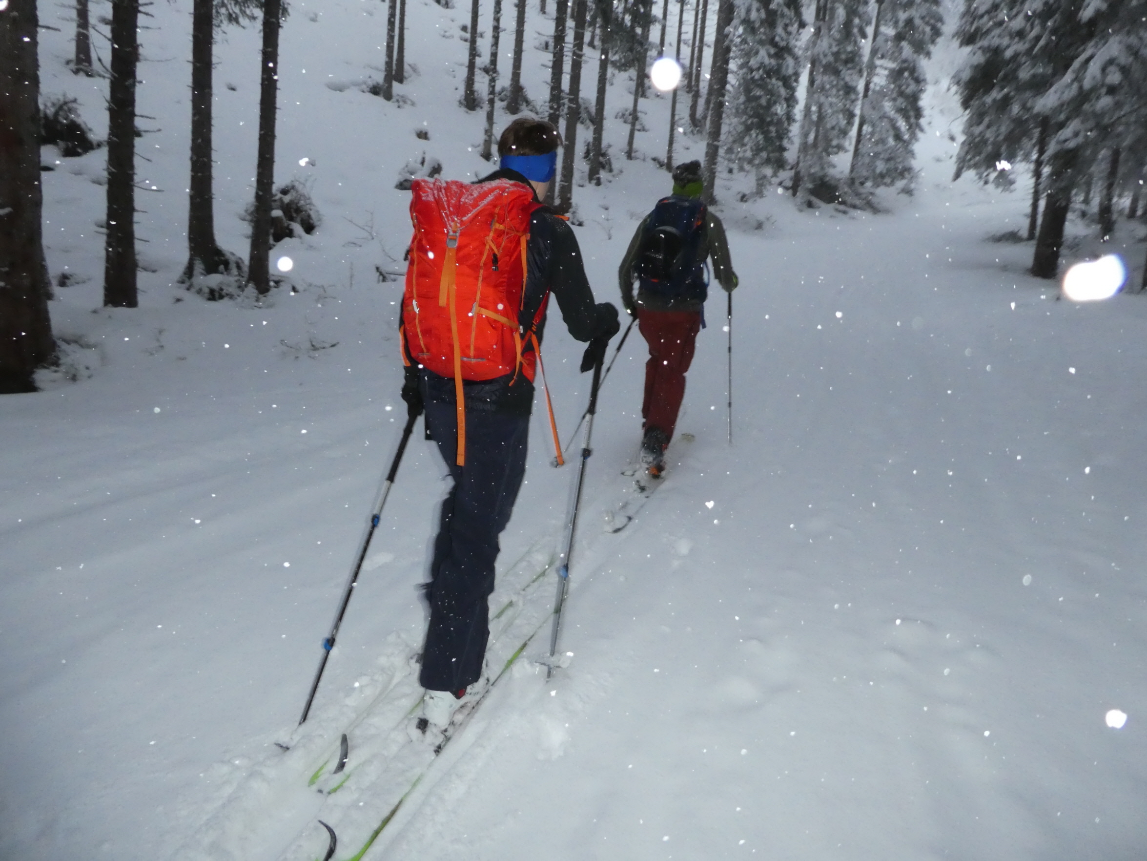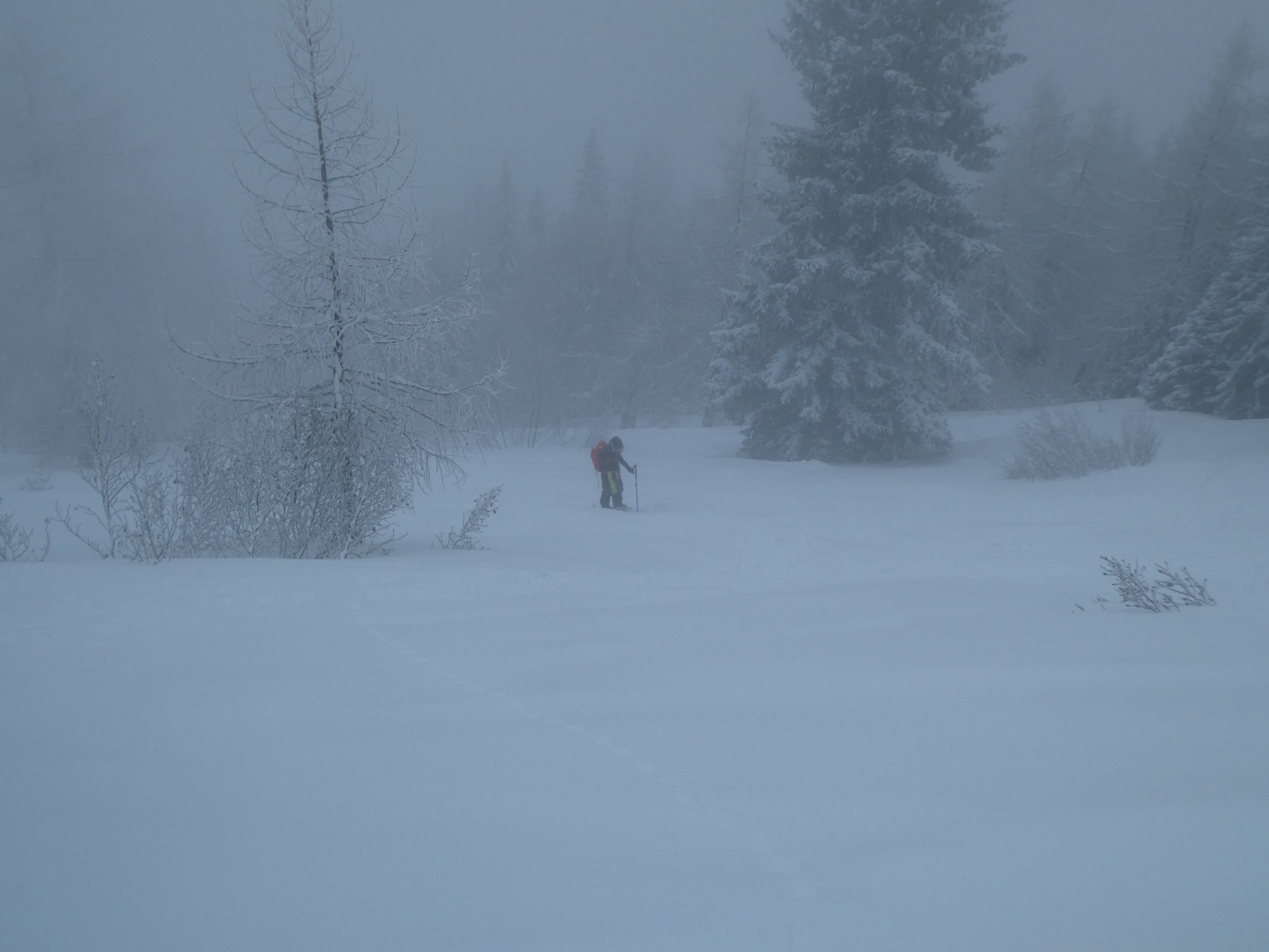 Nach problemloser Anfahrt größtenteils im Regen (nur beim Gleinalmtunnel Nordportal und am Präbichl hatte es geschneit) sind wir bei leichtem Schneefall als erste an diesem Tag entlang der Rodelpiste in die Lasitze gestartet. Chris hat uns von dort eine Spur hinauf auf die Hochalm gelegt. Die Steilstufe und einige Waldpassagen könnten noch etwas Schneezuwachs vertragen.