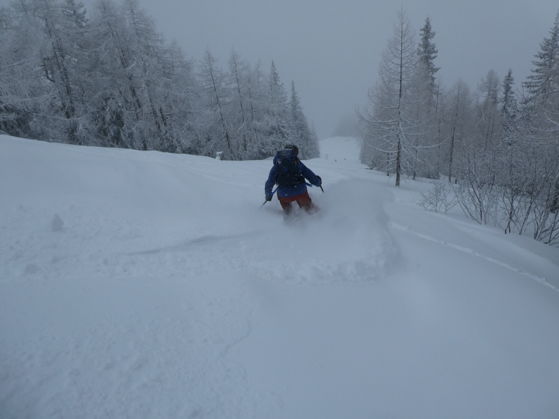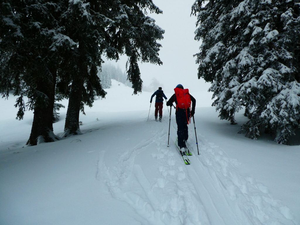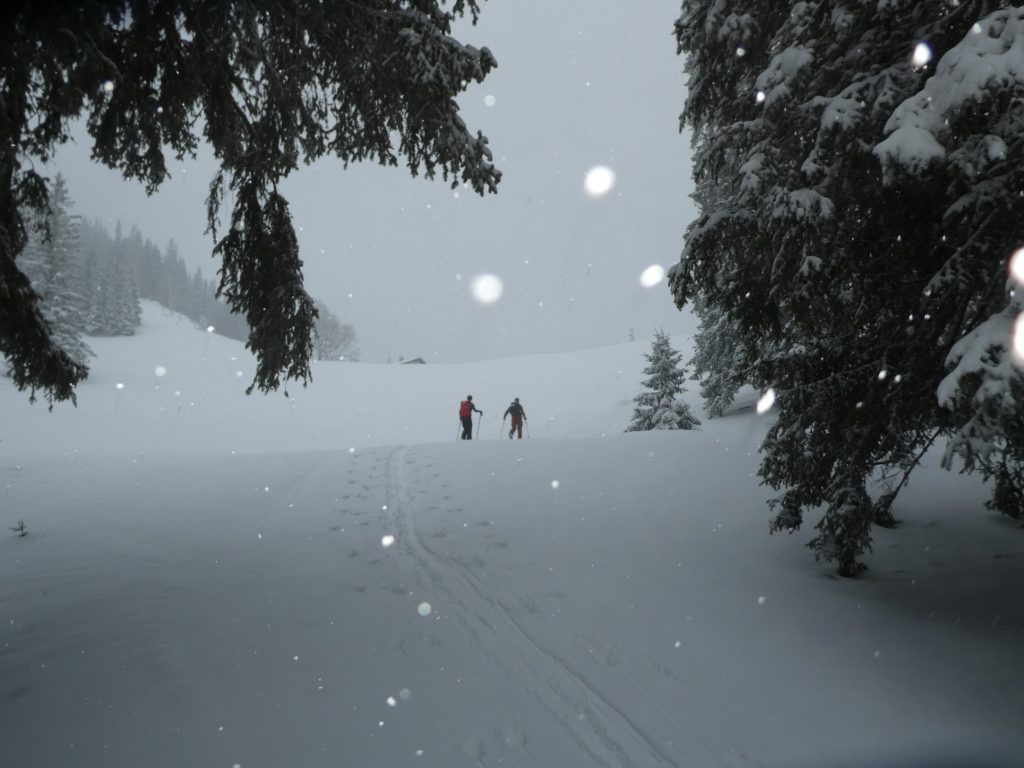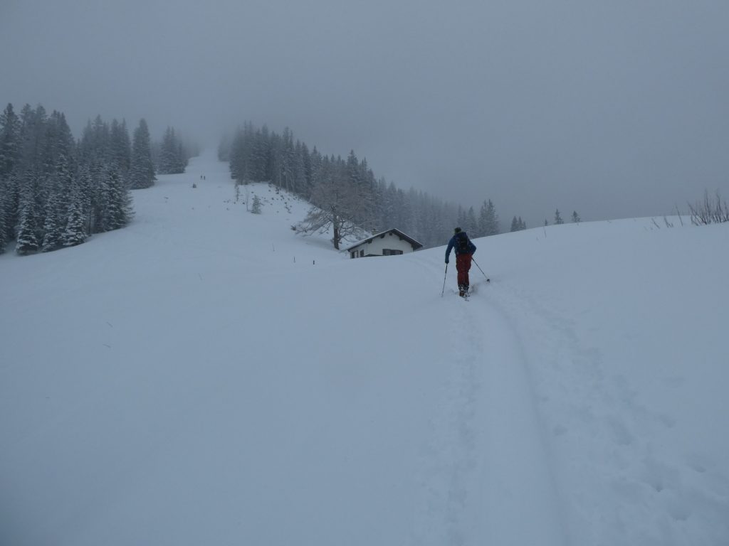 Bei etwas schlechterer Sicht als beim ersten Mal ging es dann wieder jubelnd talwärts. Bis hinunter zur Hochalm war kein schlechter Schwung dabei. Dass wir noch einmal die Felle aufziehen, war daher selbstredend. Nach der Umrüstpause ging es dann ein drittes Mal entlang der Schwarzensteinplan nach oben.