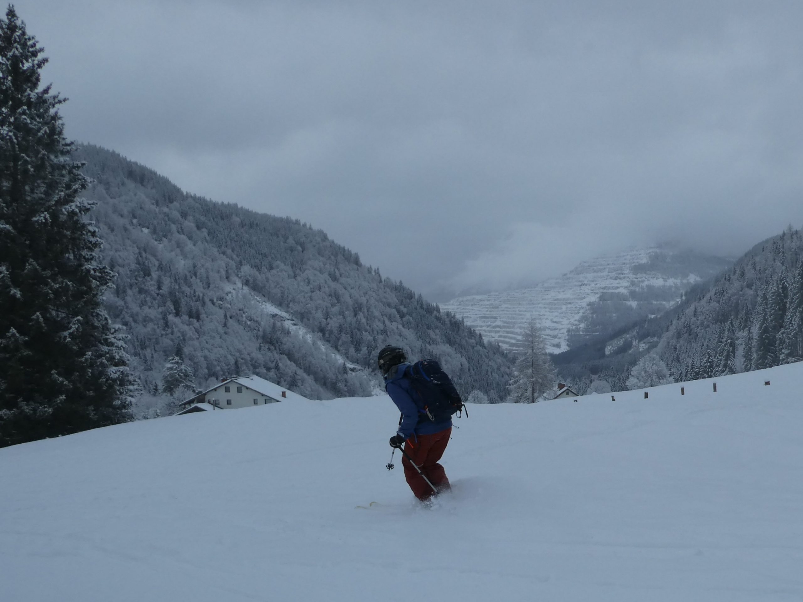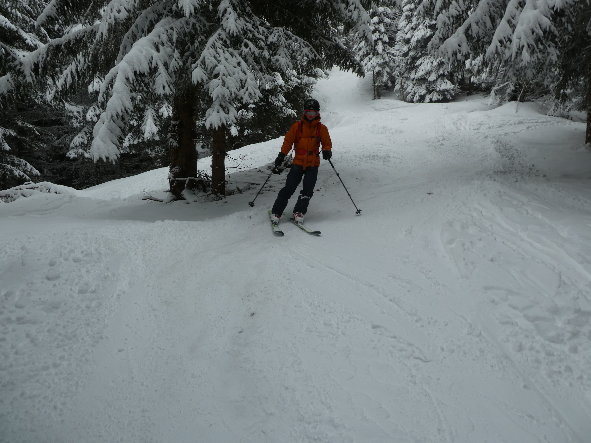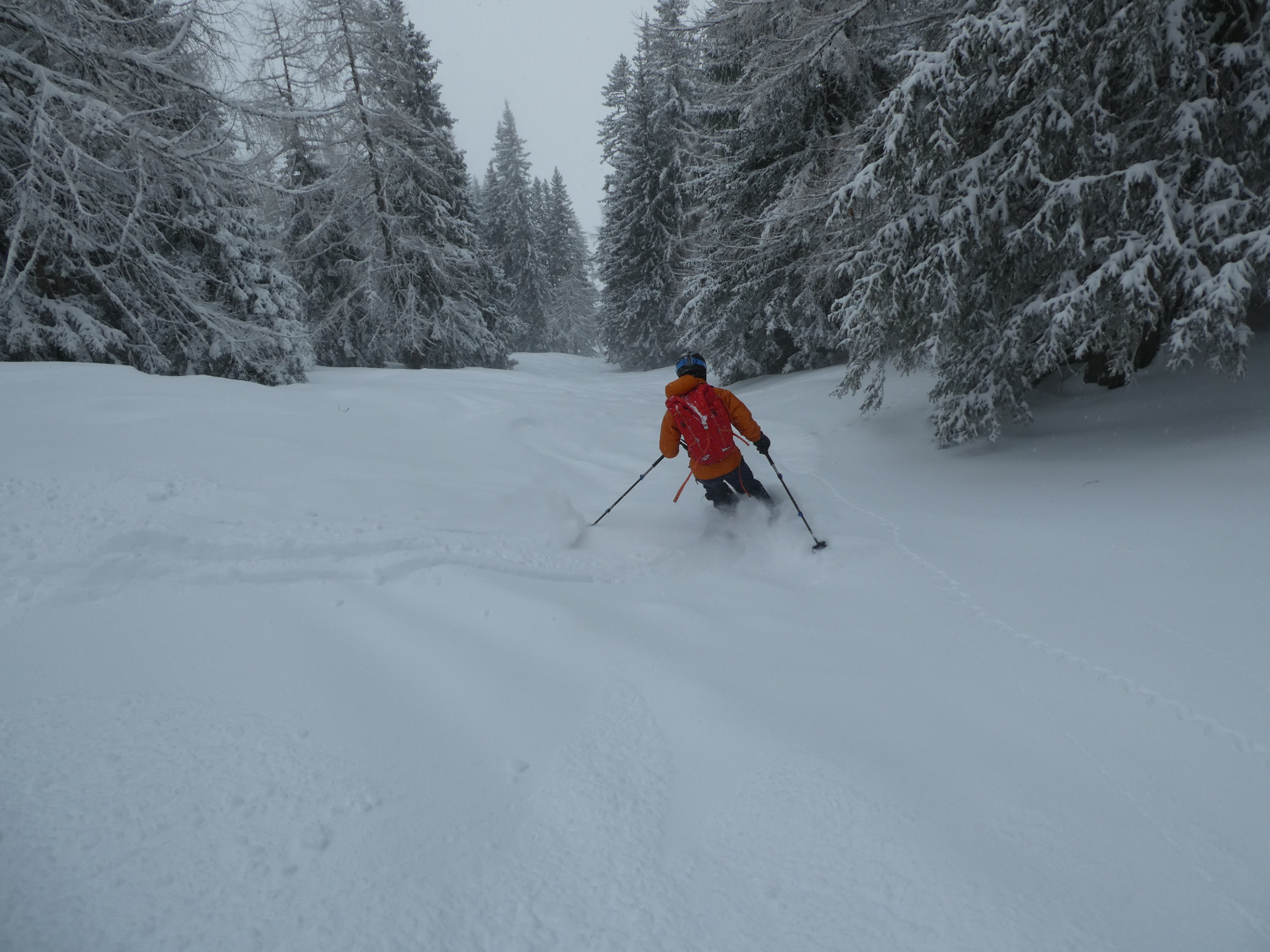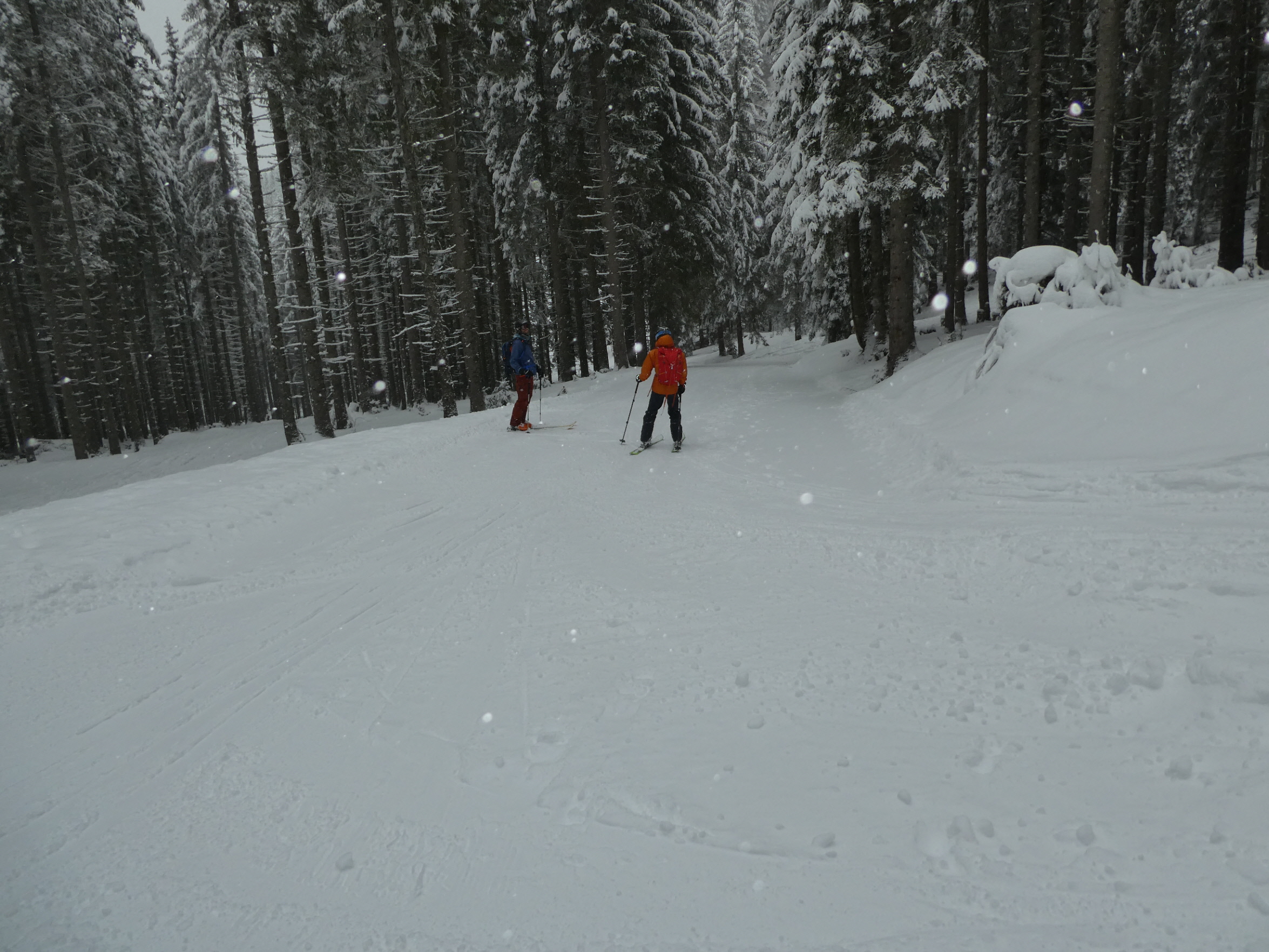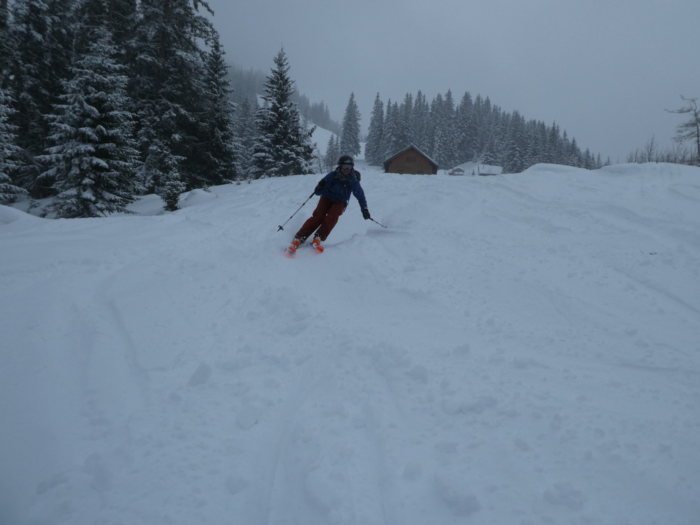Ein letztes Mal haben wir jetzt umgerüstet und uns für die finale Abfahrt fertig gemacht. Im zentralen Bereich der Plan haben wir zwischen wenigen dort schon vorhandenen Abfahrtsspuren immer noch genug Platz für eine genussvolle Tiefschneeabfahrt gefunden. Jetzt sind wir aber von der Hochalm weiter ins Tal abgefahren. Sowohl im Waldstück unterhalb der Alm als auch in der Steilstufe nach dem flachen Wegstück war der Neuschnee längst rausgeputzt und das Abfahren auf dem harten Untergrund weniger lustig.