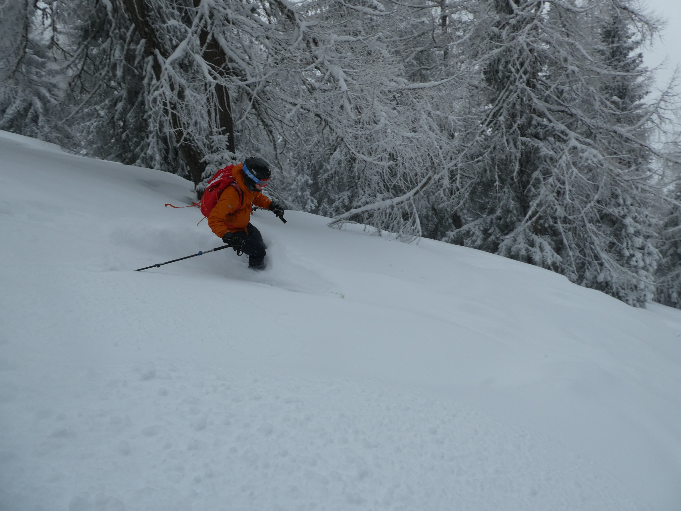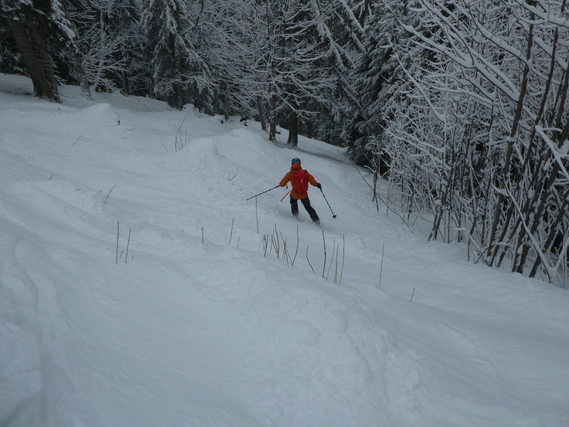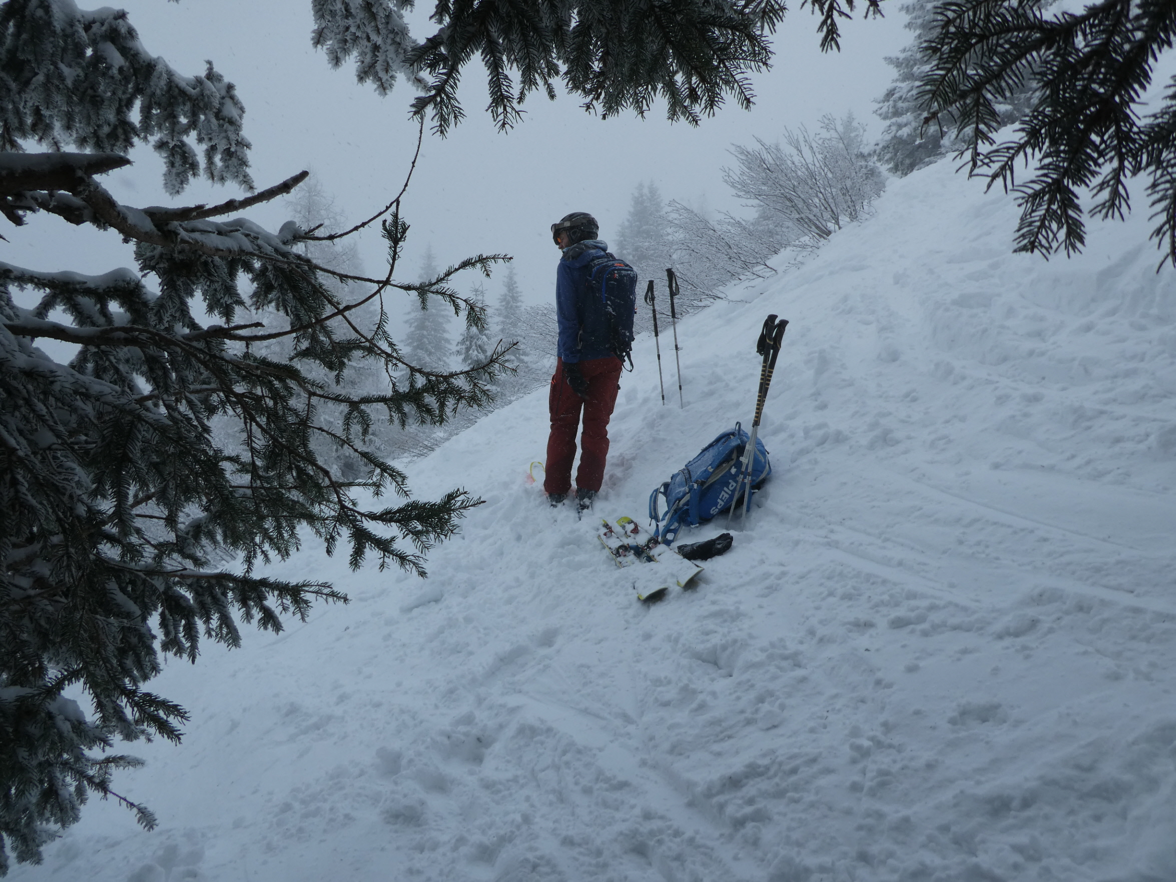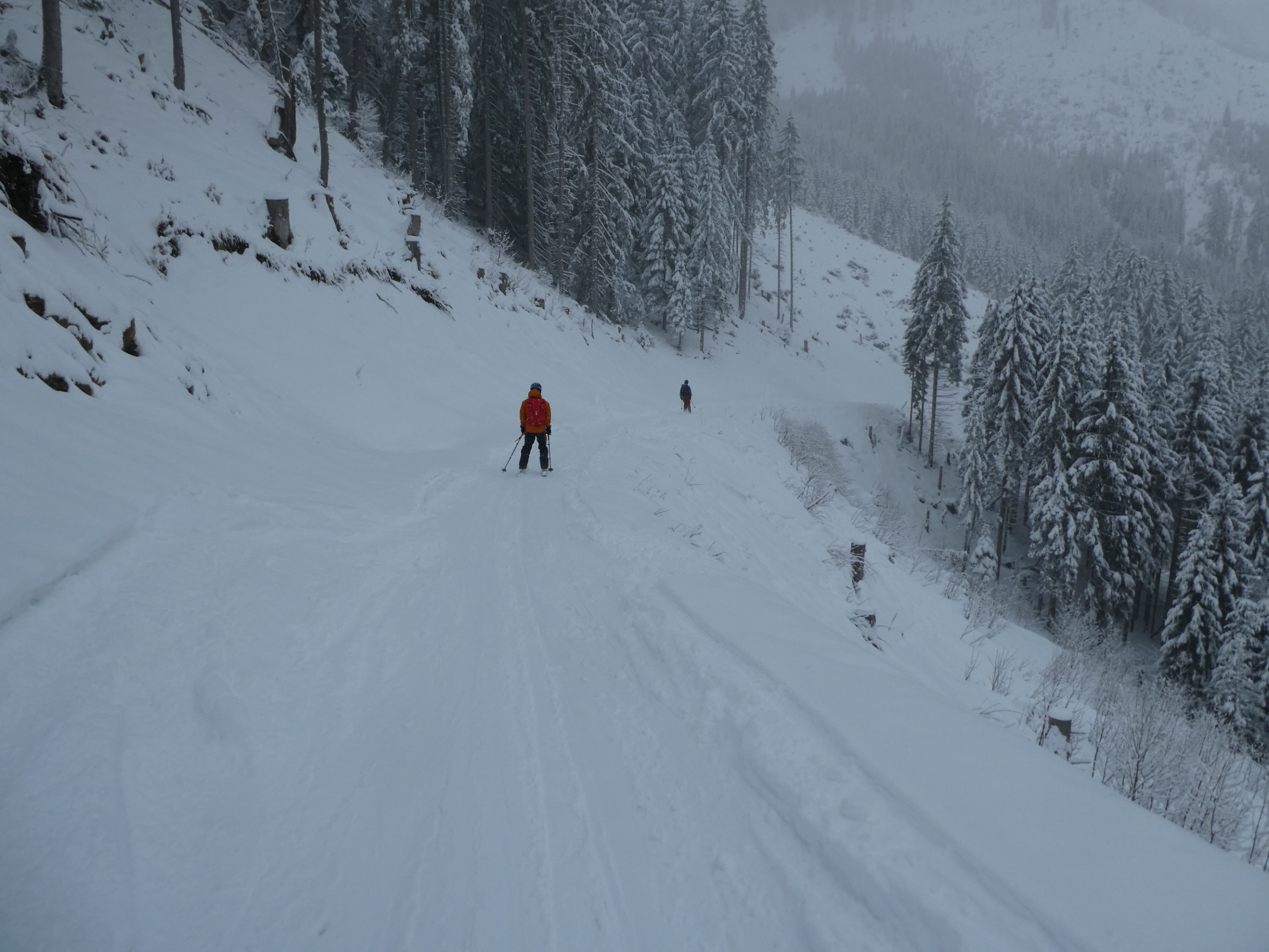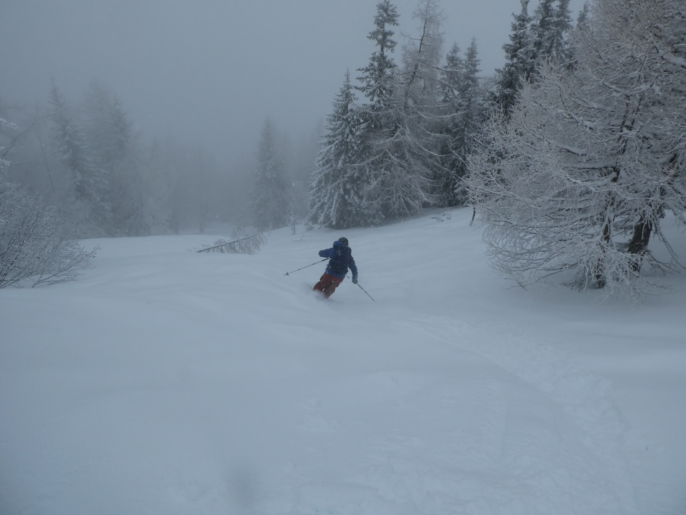 Ein letztes Mal haben wir jetzt umgerüstet und uns für die finale Abfahrt fertig gemacht. Im zentralen Bereich der Plan haben wir zwischen wenigen dort schon vorhandenen Abfahrtsspuren immer noch genug Platz für eine genussvolle Tiefschneeabfahrt gefunden. Jetzt sind wir aber von der Hochalm weiter ins Tal abgefahren. Sowohl im Waldstück unterhalb der Alm als auch in der Steilstufe nach dem flachen Wegstück war der Neuschnee längst rausgeputzt und das Abfahren auf dem harten Untergrund weniger lustig.