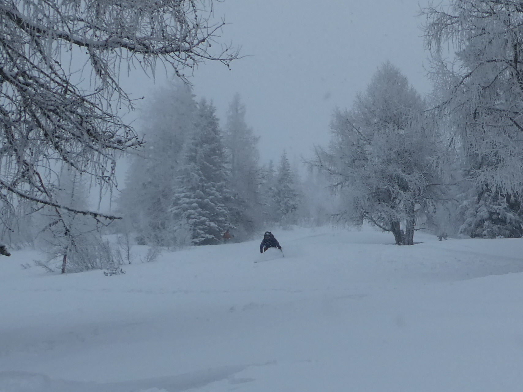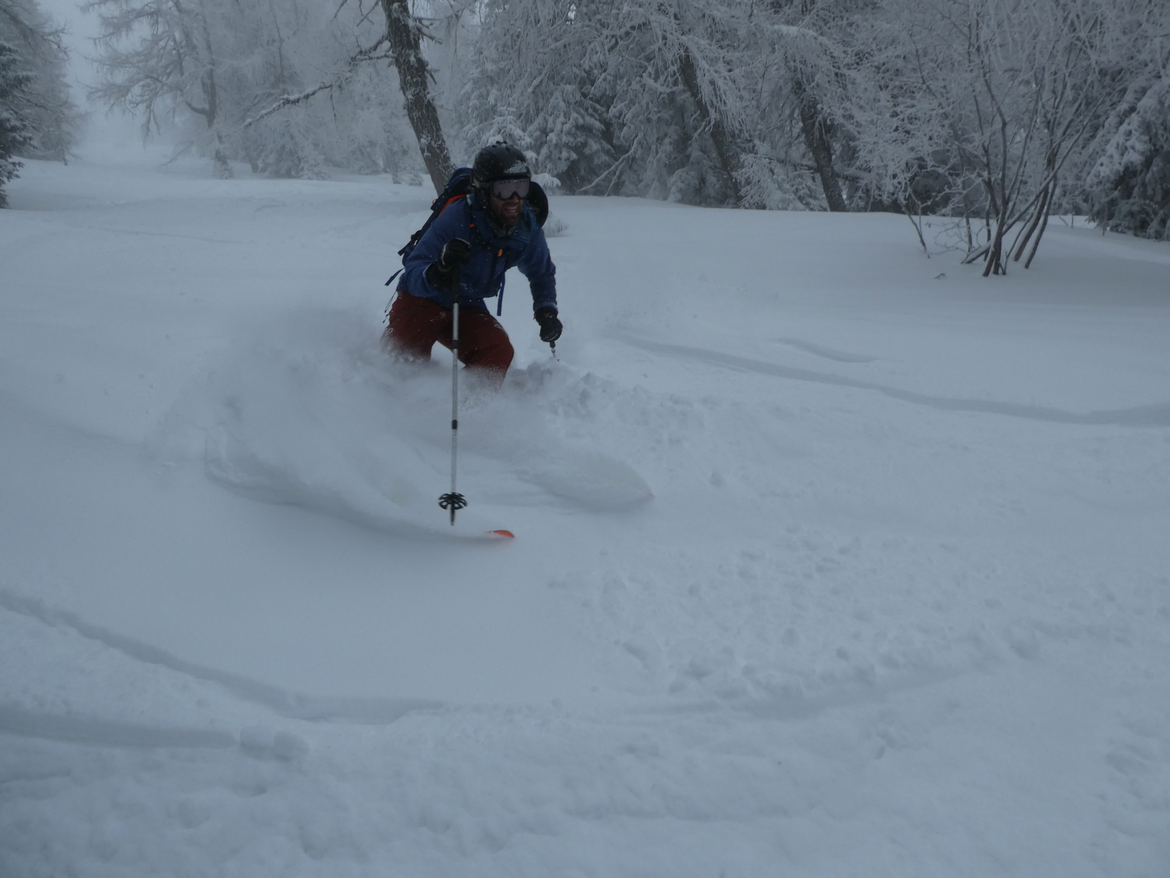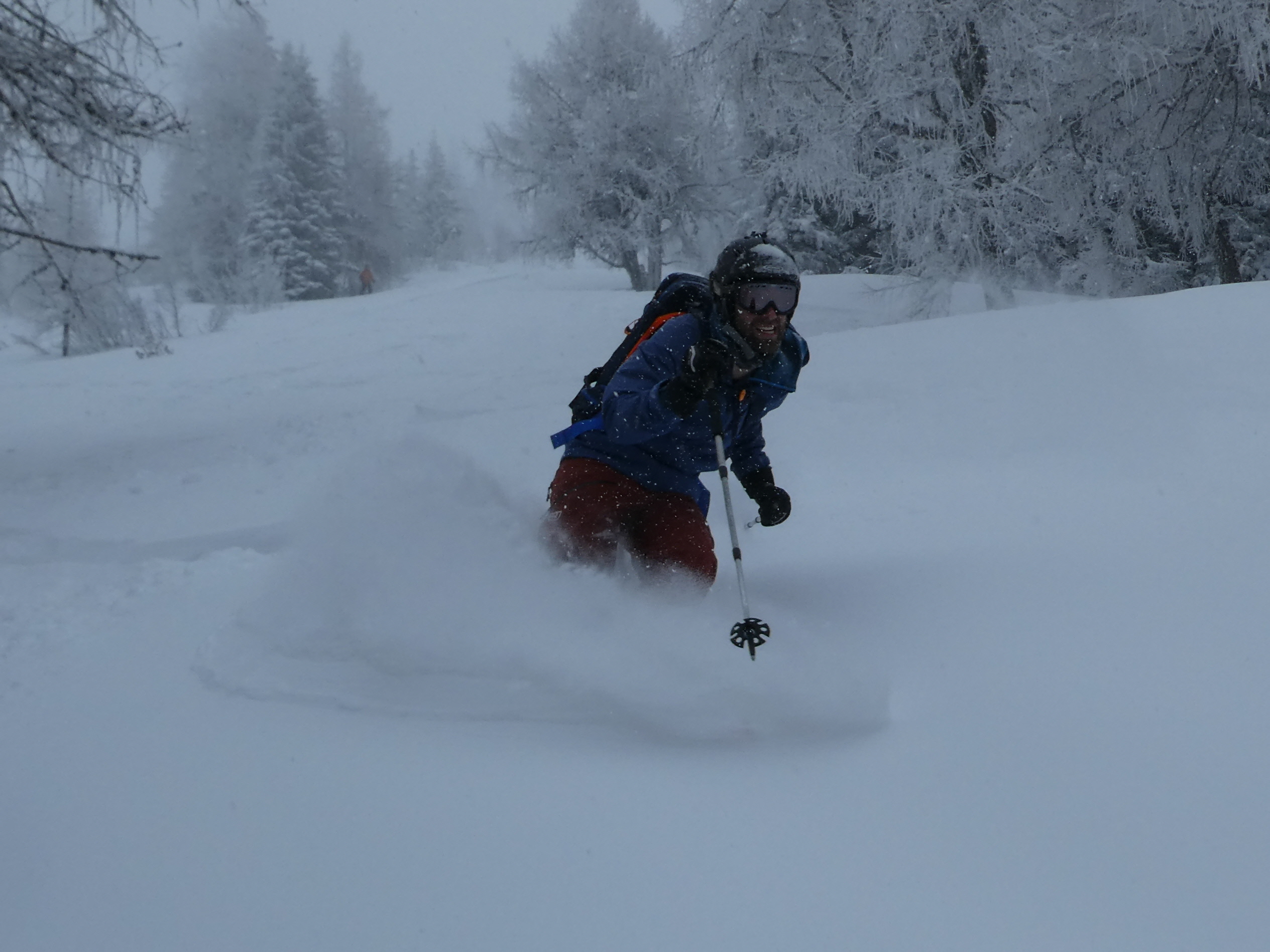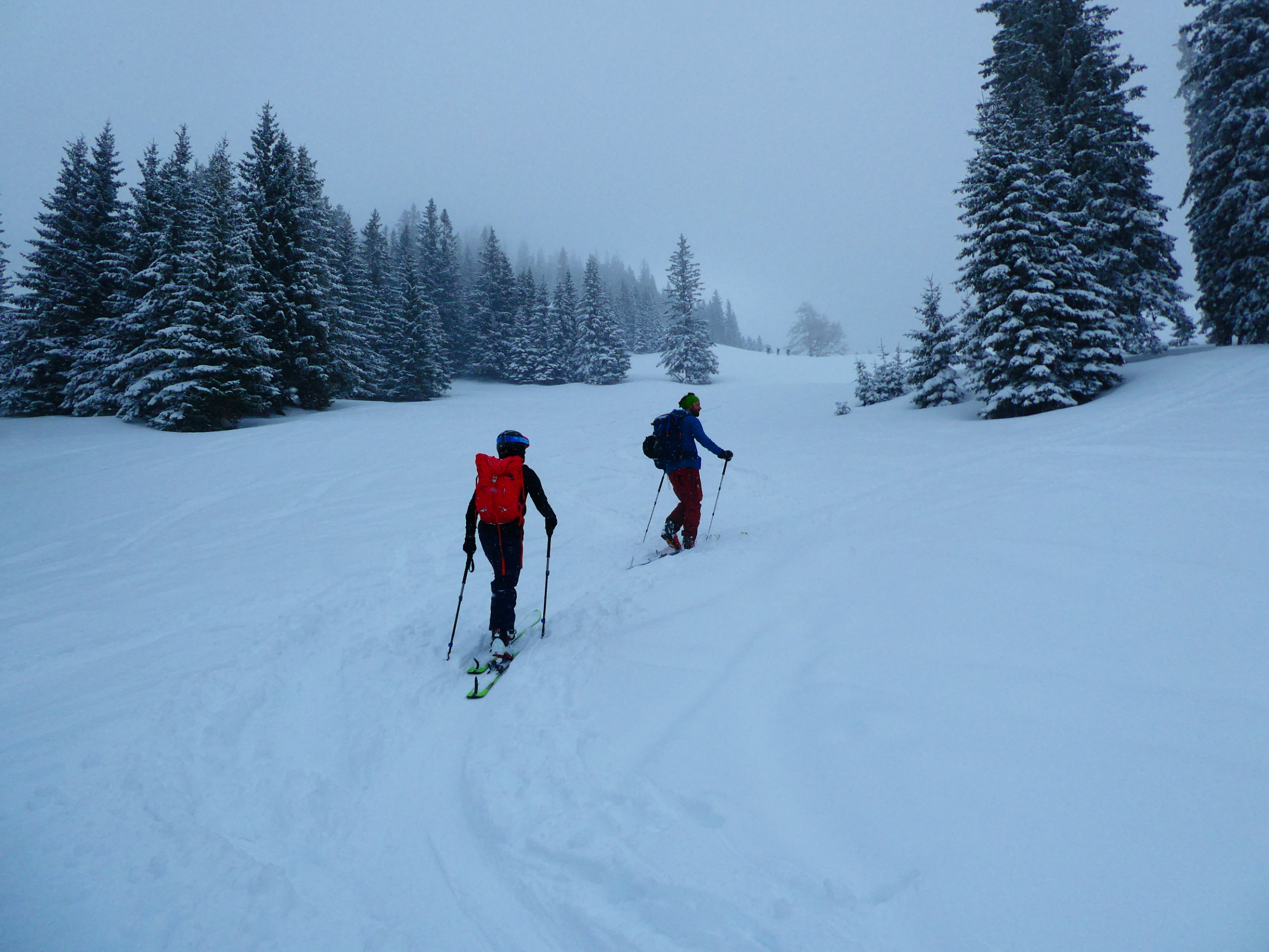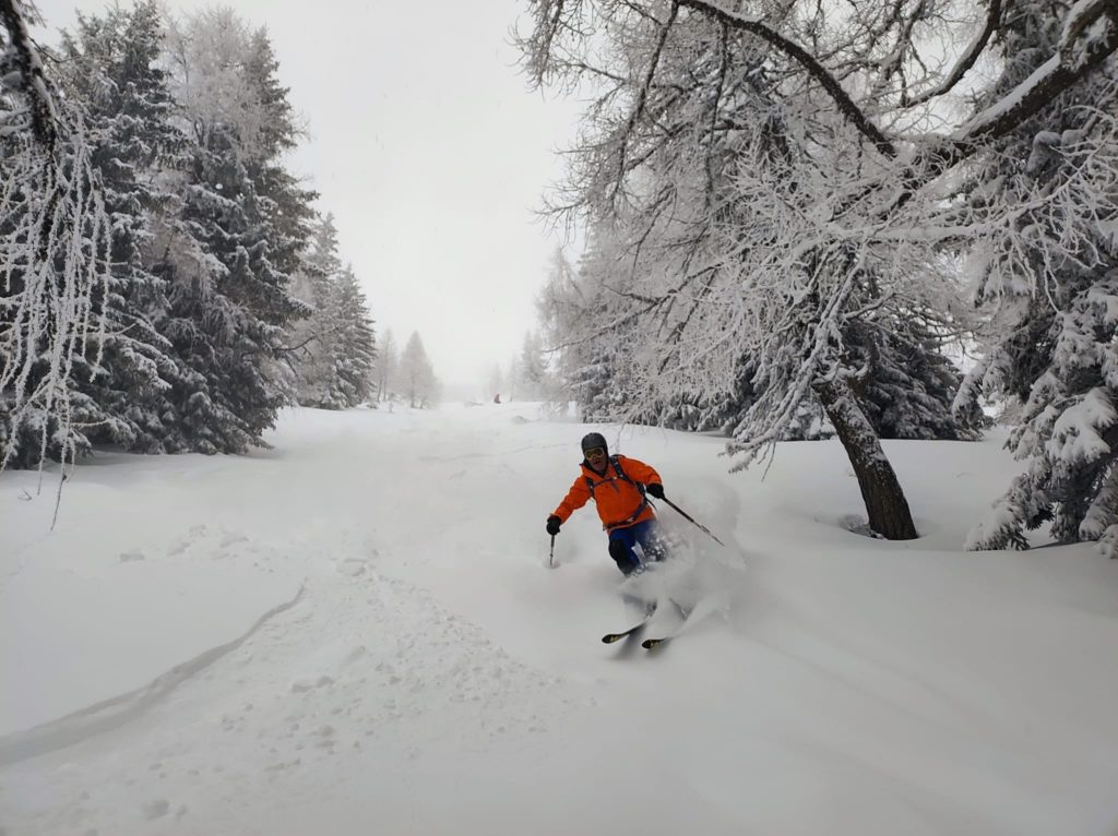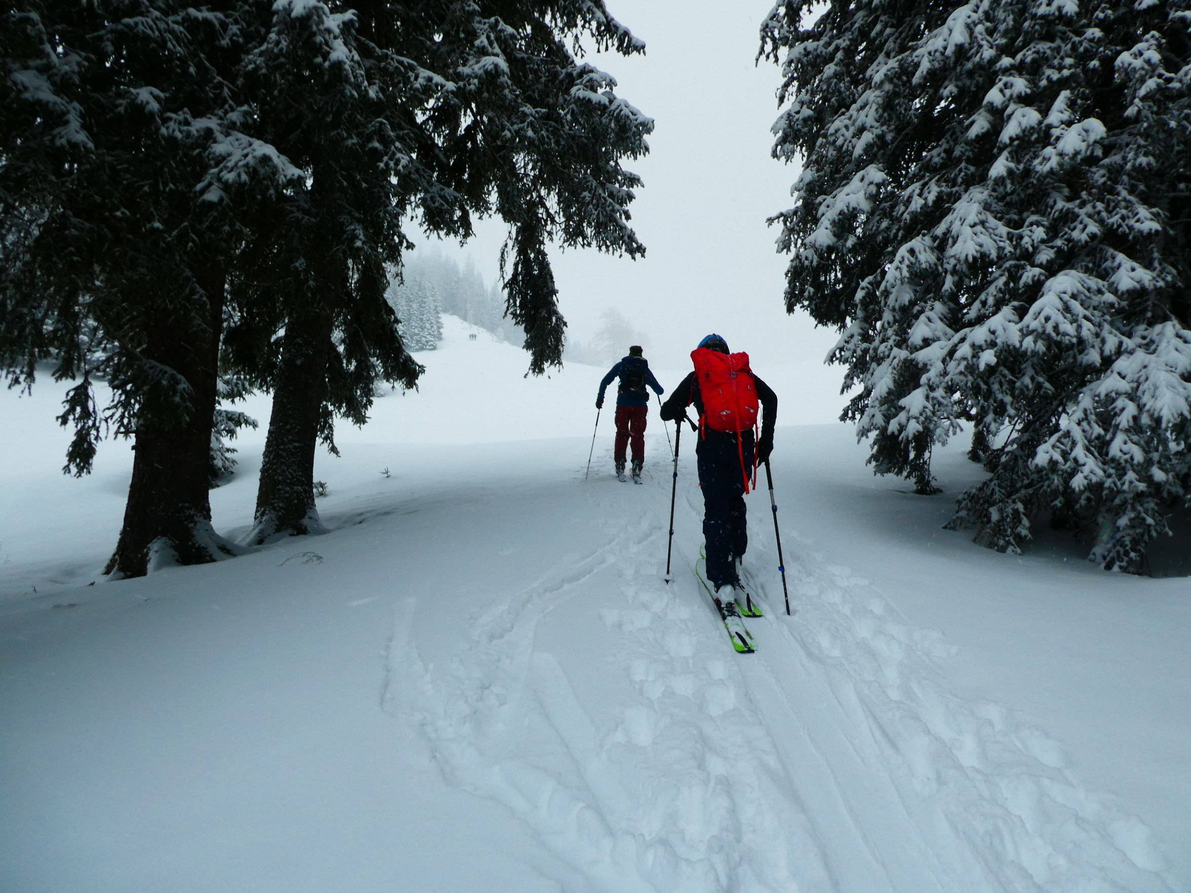 Ein letztes Mal haben wir jetzt umgerüstet und uns für die finale Abfahrt fertig gemacht. Im zentralen Bereich der Plan haben wir zwischen wenigen dort schon vorhandenen Abfahrtsspuren immer noch genug Platz für eine genussvolle Tiefschneeabfahrt gefunden. Jetzt sind wir aber von der Hochalm weiter ins Tal abgefahren. Sowohl im Waldstück unterhalb der Alm als auch in der Steilstufe nach dem flachen Wegstück war der Neuschnee längst rausgeputzt und das Abfahren auf dem harten Untergrund weniger lustig.