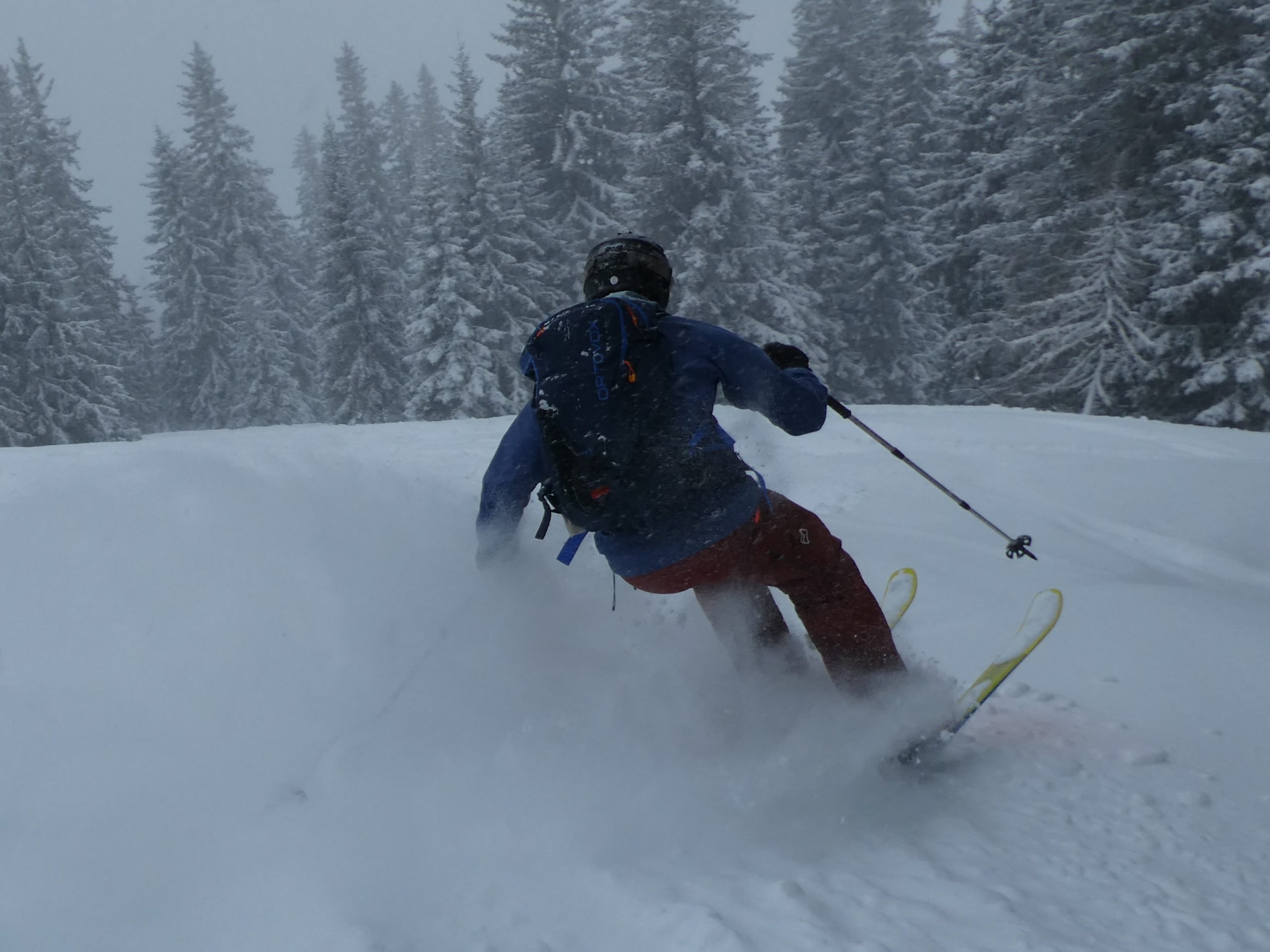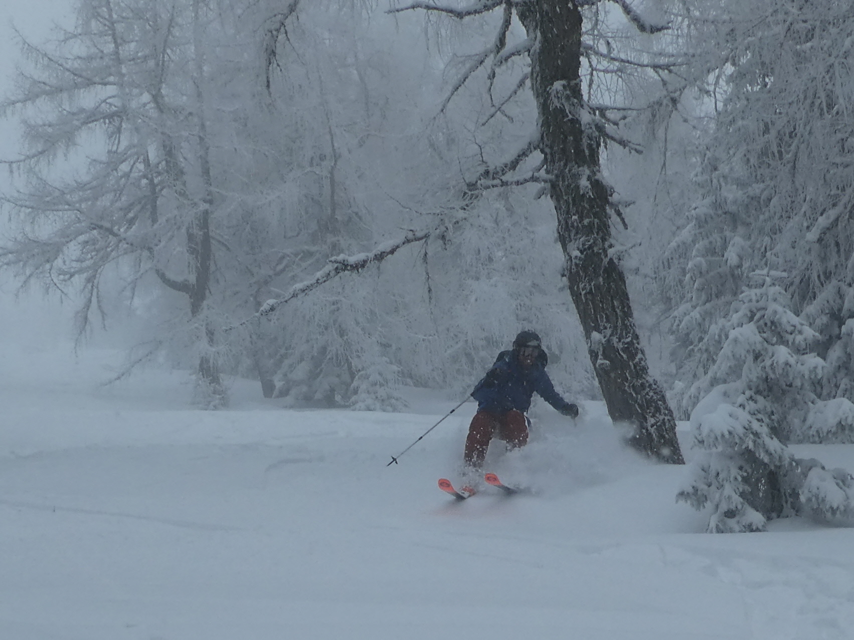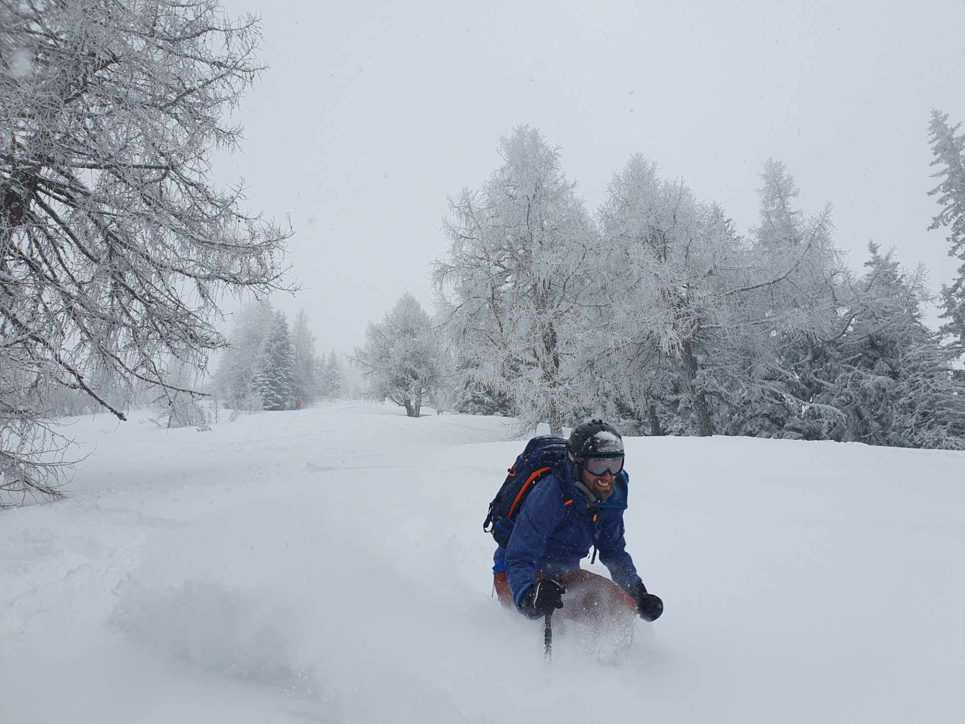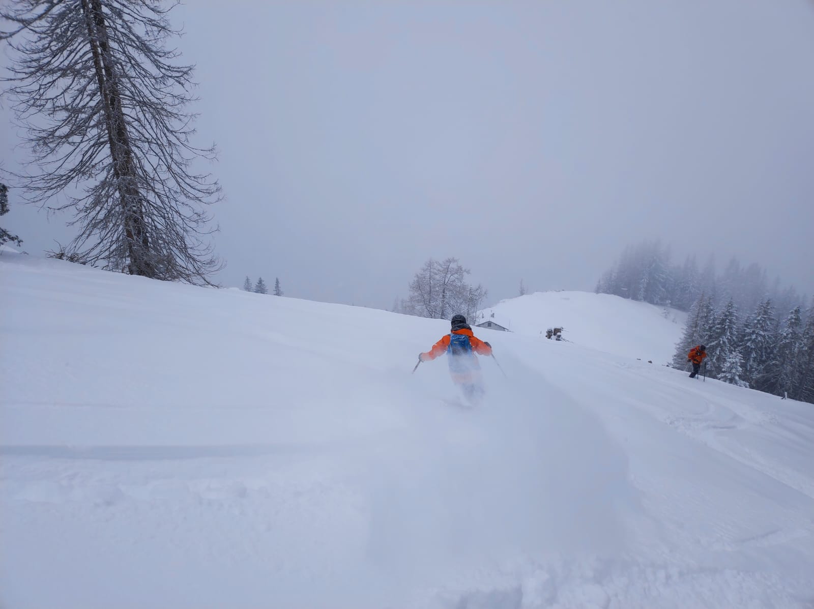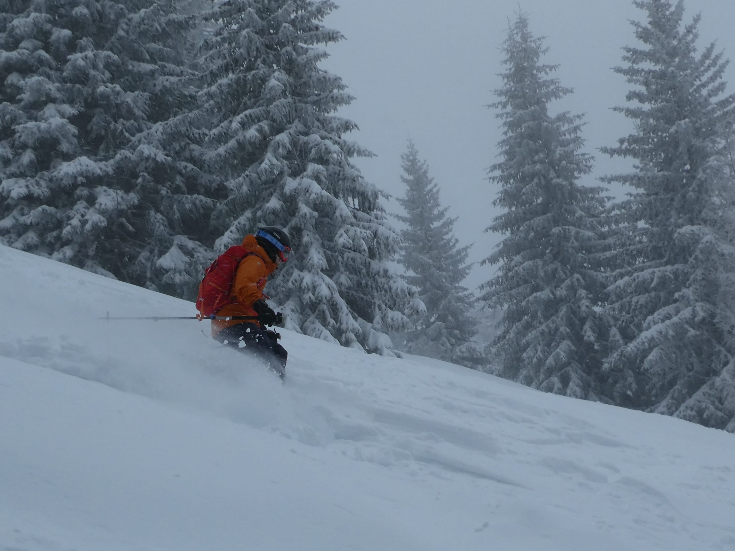 Ein letztes Mal haben wir jetzt umgerüstet und uns für die finale Abfahrt fertig gemacht. Im zentralen Bereich der Plan haben wir zwischen wenigen dort schon vorhandenen Abfahrtsspuren immer noch genug Platz für eine genussvolle Tiefschneeabfahrt gefunden. Jetzt sind wir aber von der Hochalm weiter ins Tal abgefahren. Sowohl im Waldstück unterhalb der Alm als auch in der Steilstufe nach dem flachen Wegstück war der Neuschnee längst rausgeputzt und das Abfahren auf dem harten Untergrund weniger lustig.